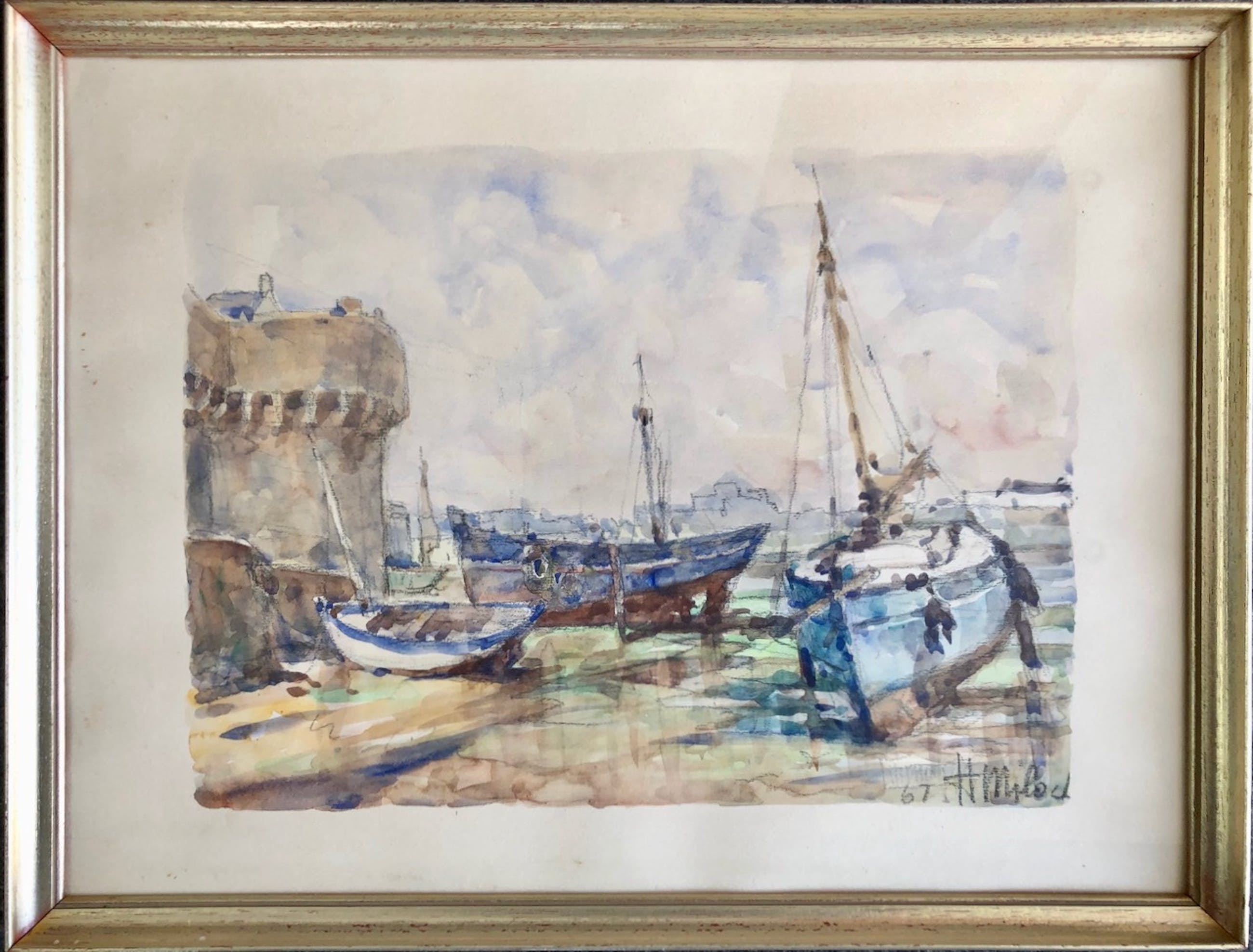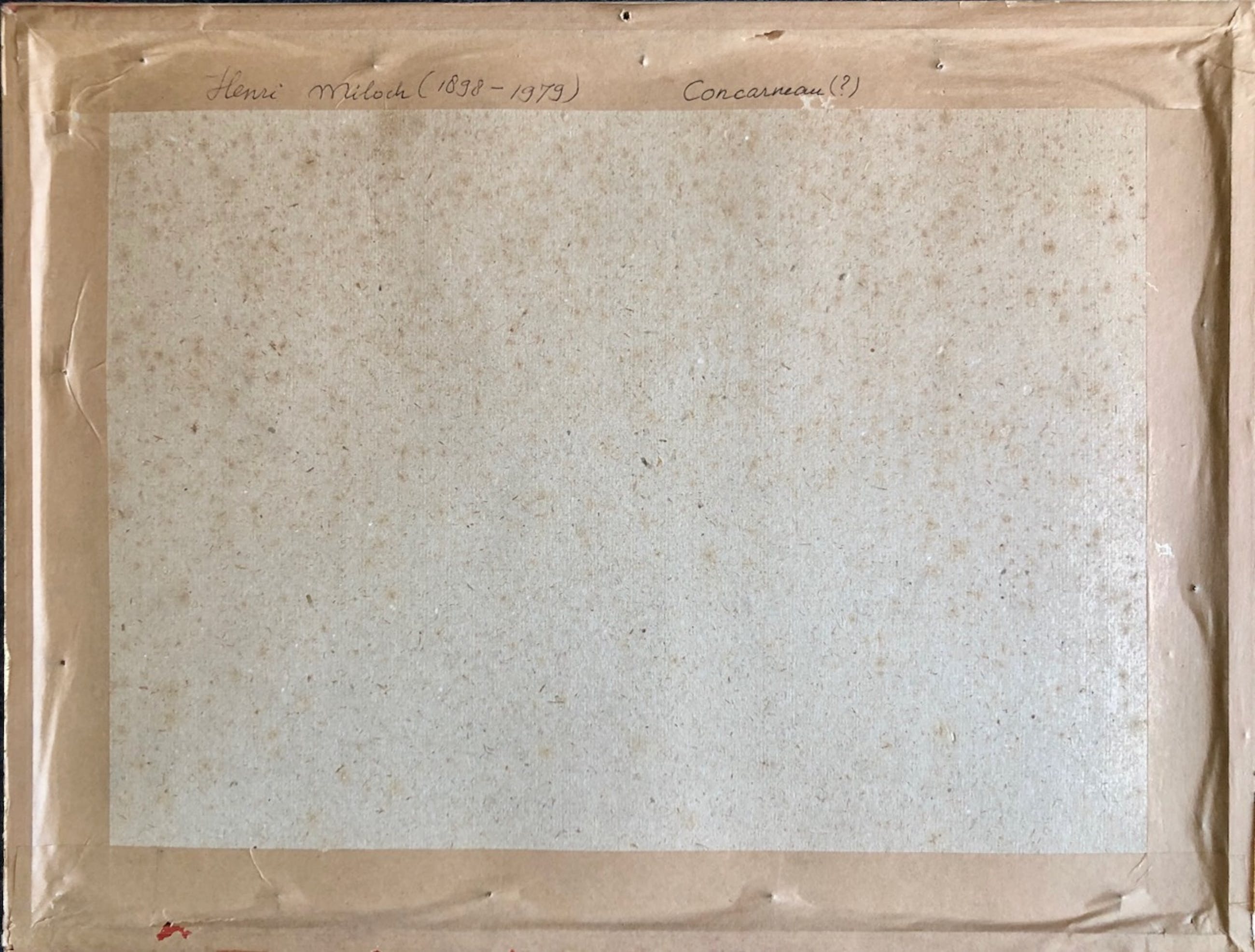 Een vlotte impressie van Henri Miloch met boten op het droge nabij Concarneau. Geen scheuren in het pa- pier en voorzien van een zuurvrij stuk papier aan de achterkant, waarna het schutkarton weer geplaatst is. Veilingresultaten kunt U gratis raadplegen op de site van Findartinfo. De haven- en zeegezichten zijn van hem het meest gewild.