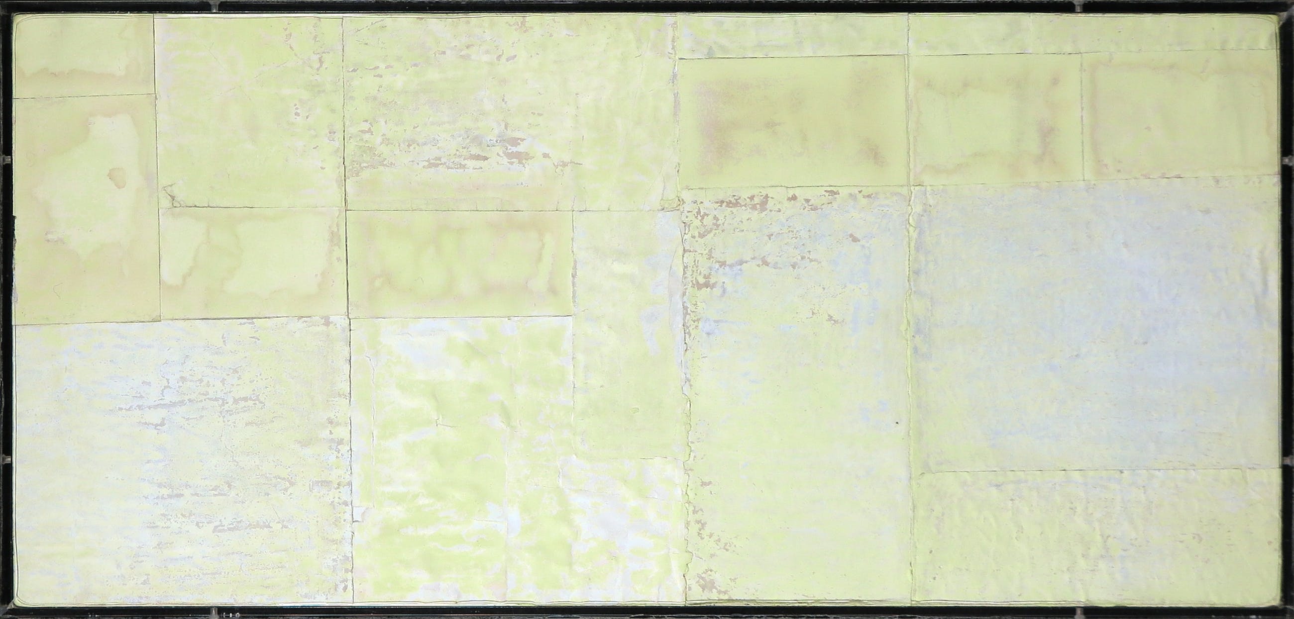 Het werk is ingelijst in een transparant plexiglazen 'lijst'. Het werk is gefotografeerd tegen een zwarte achtergrond, vandaar de zwarte rand.