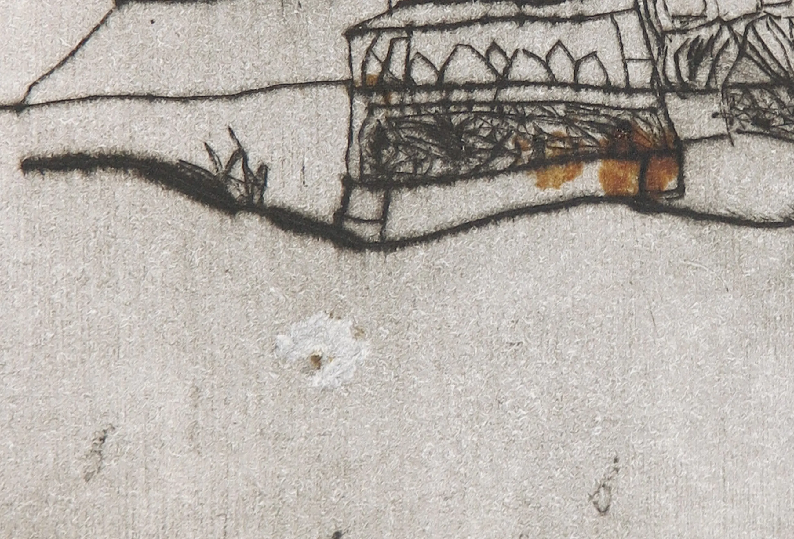 | Wat vlekken links onderin de compositie. Ook wat vegen en kreuken op het omliggende kader. | |||||||||||
