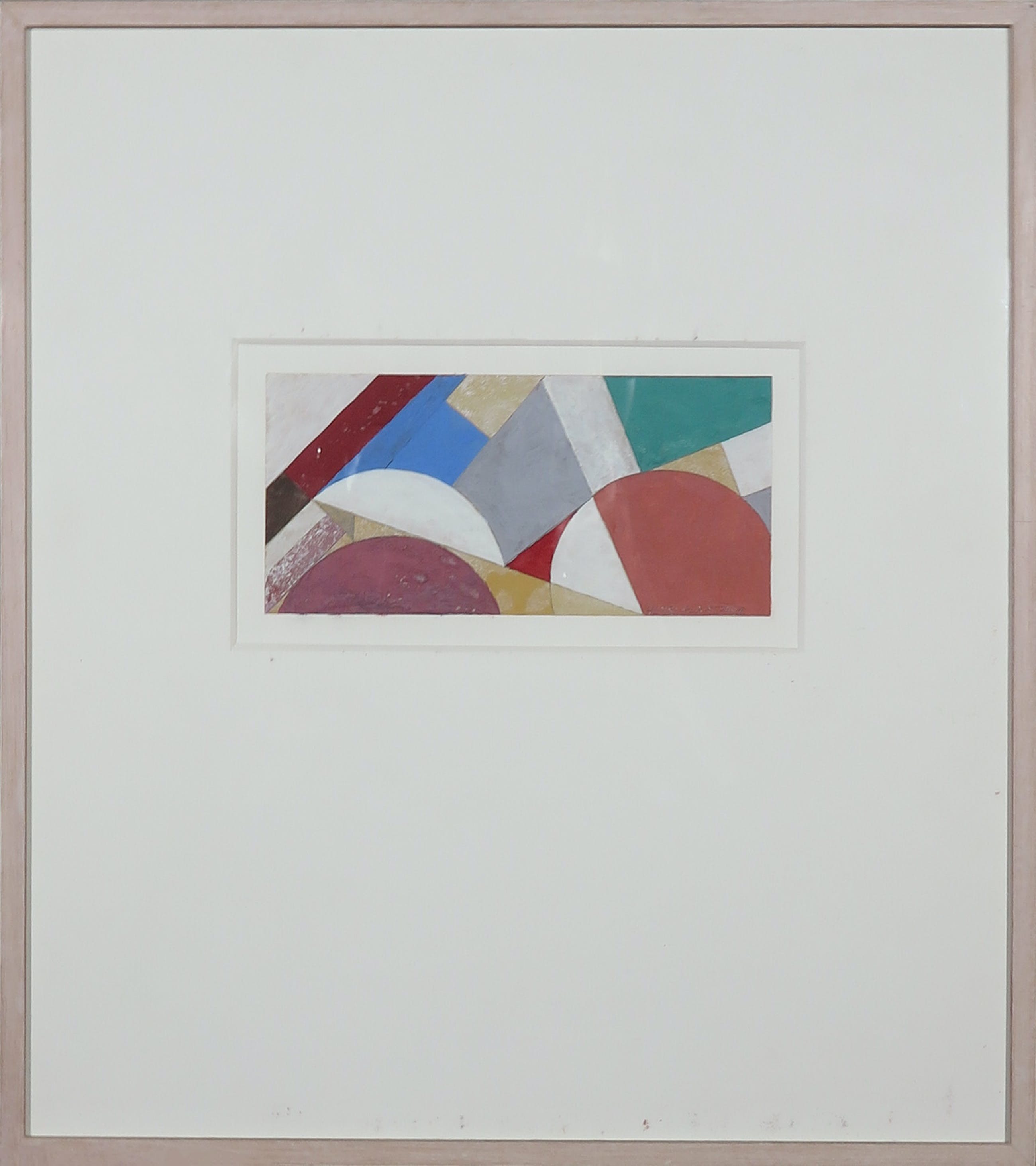Het werk is over het algemeen in goede staat, op de roze boog is wat craquelé te vinden en dit geldt ook voor de rode streep. Verder bevindt zich tussen het passe-partout en het glas wat oppervlakte vuil. | |