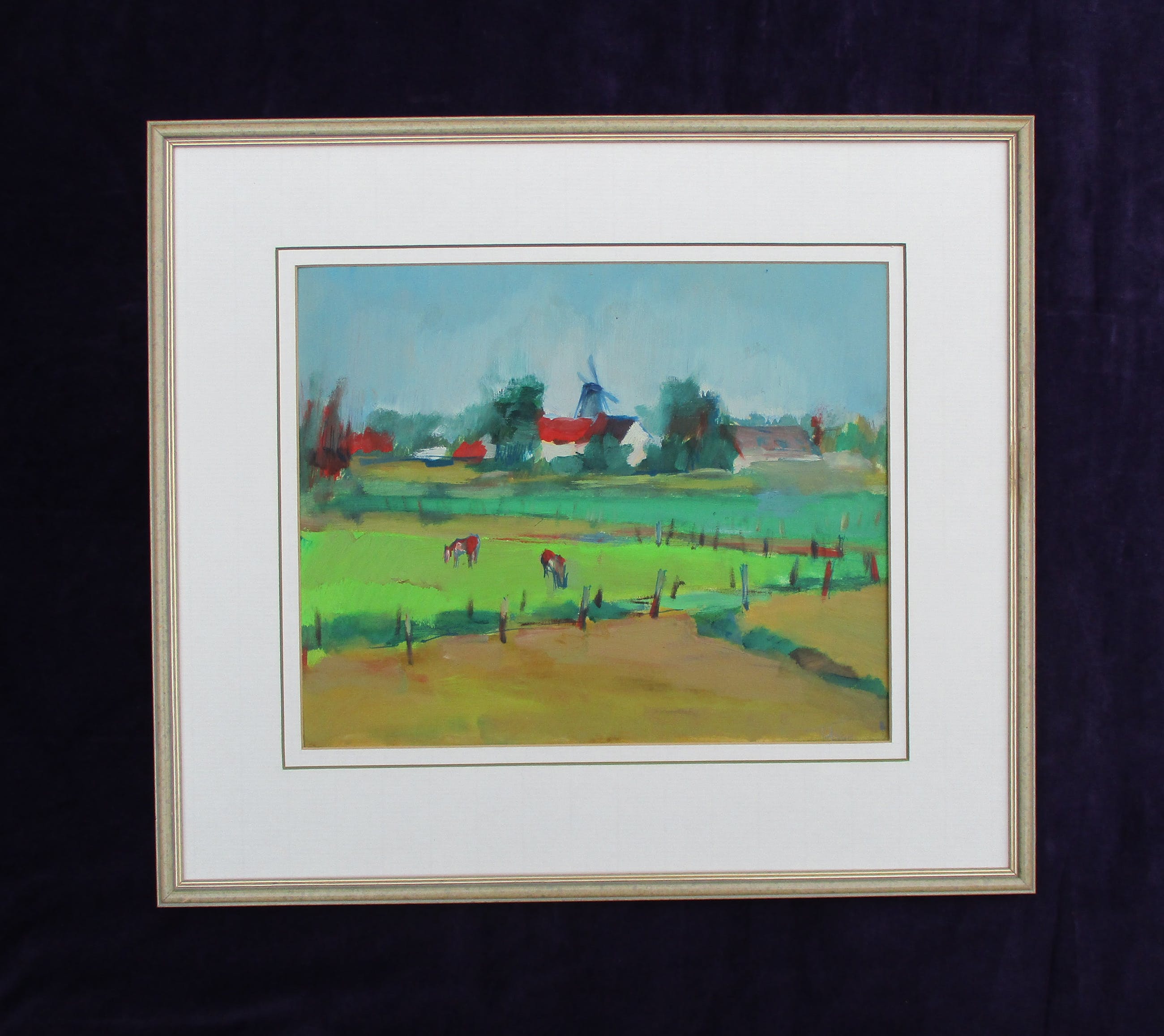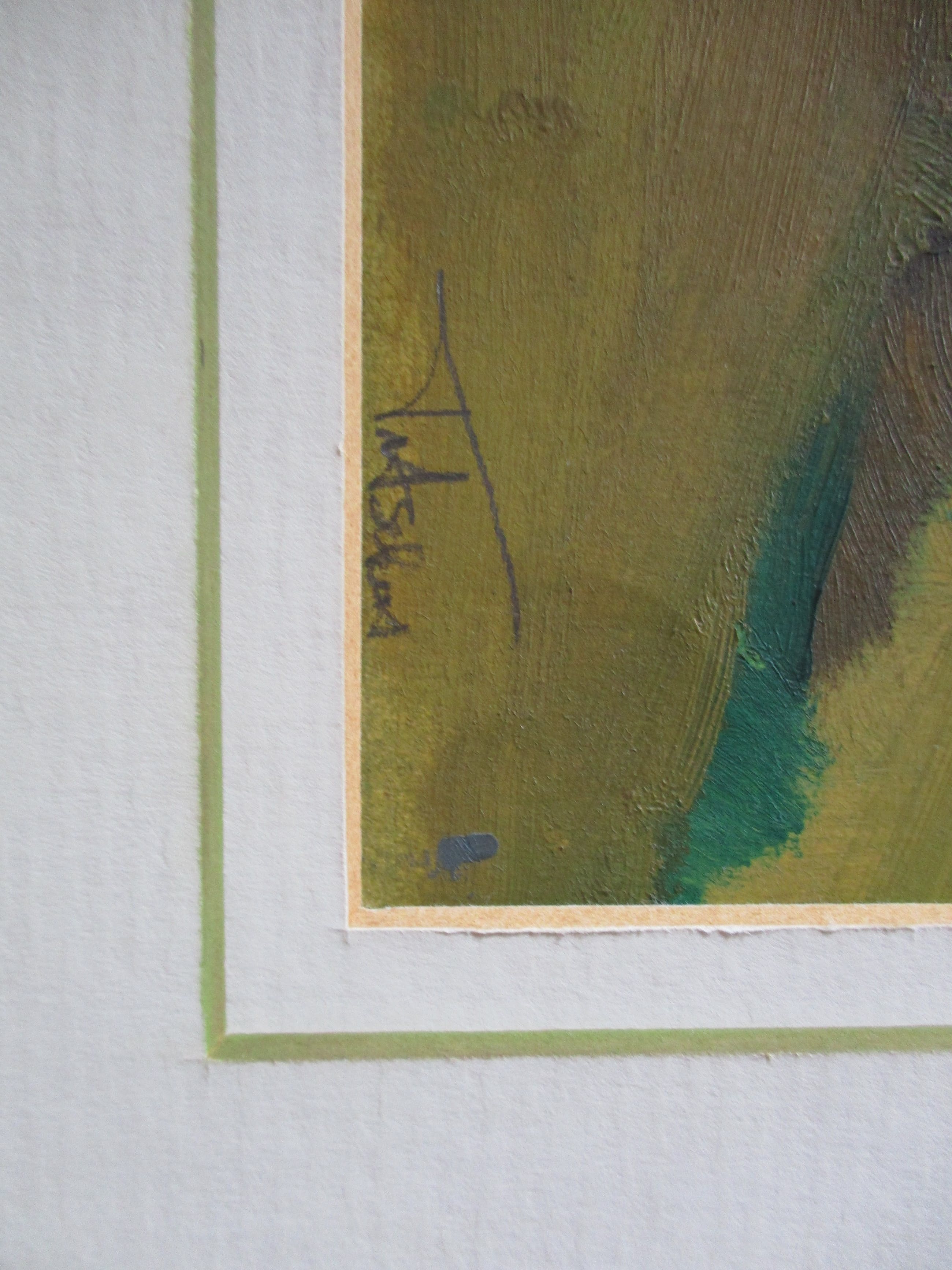 Dit werk is rechtsonder gesigneerd. Het werk is ingelijst met dubbele passepartout achter glas.