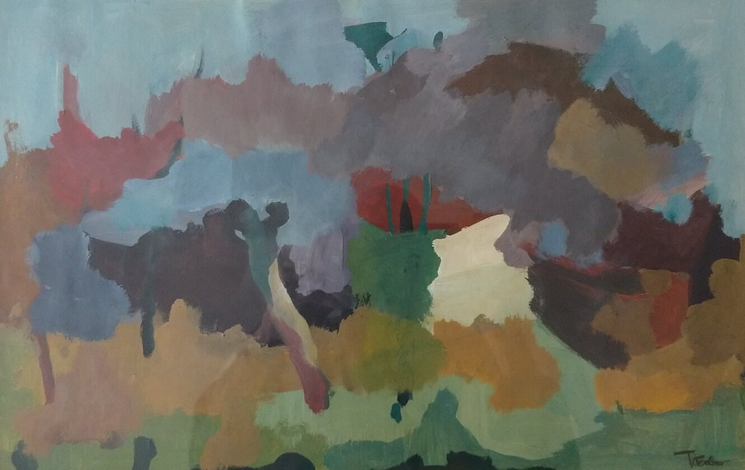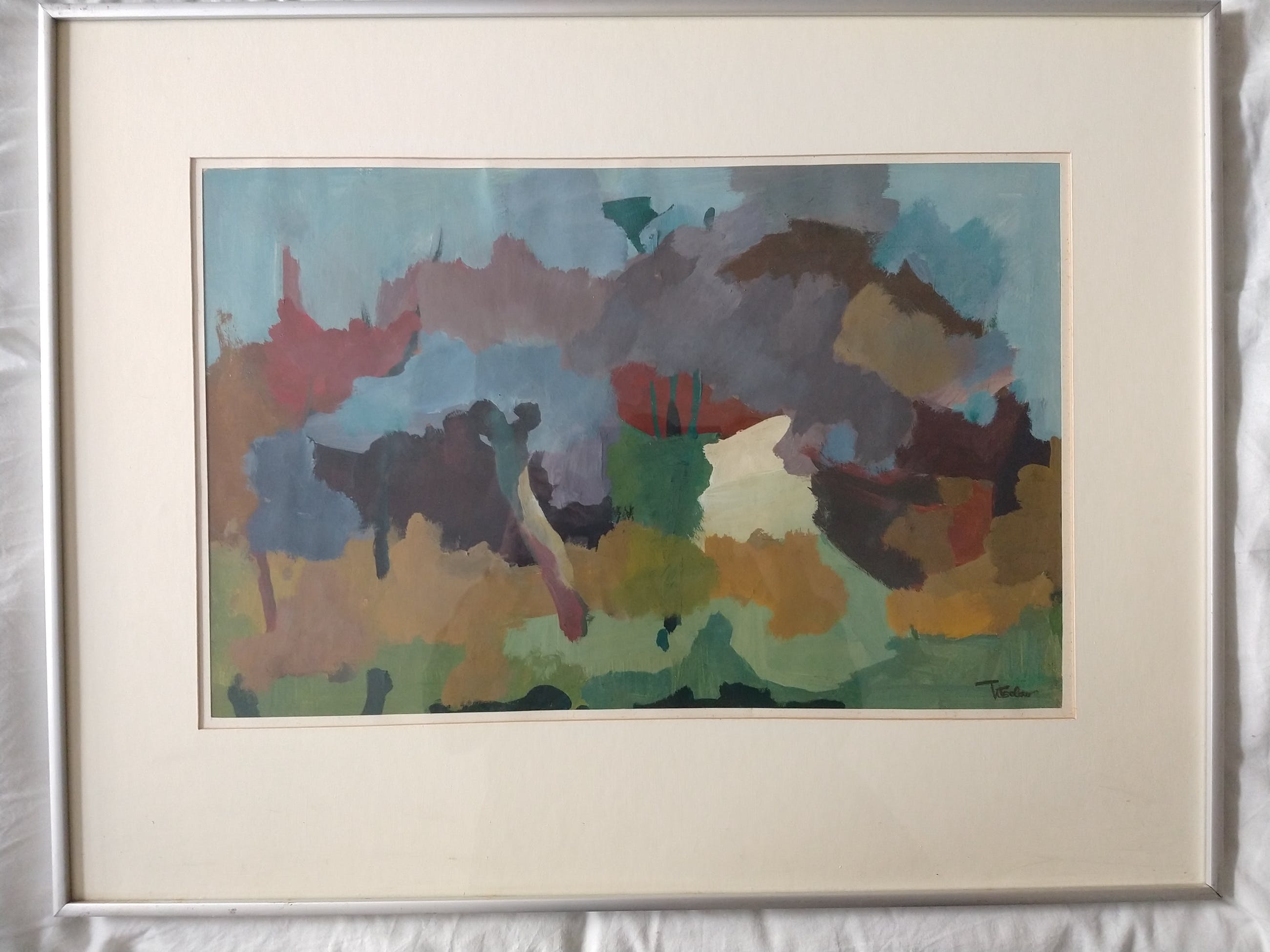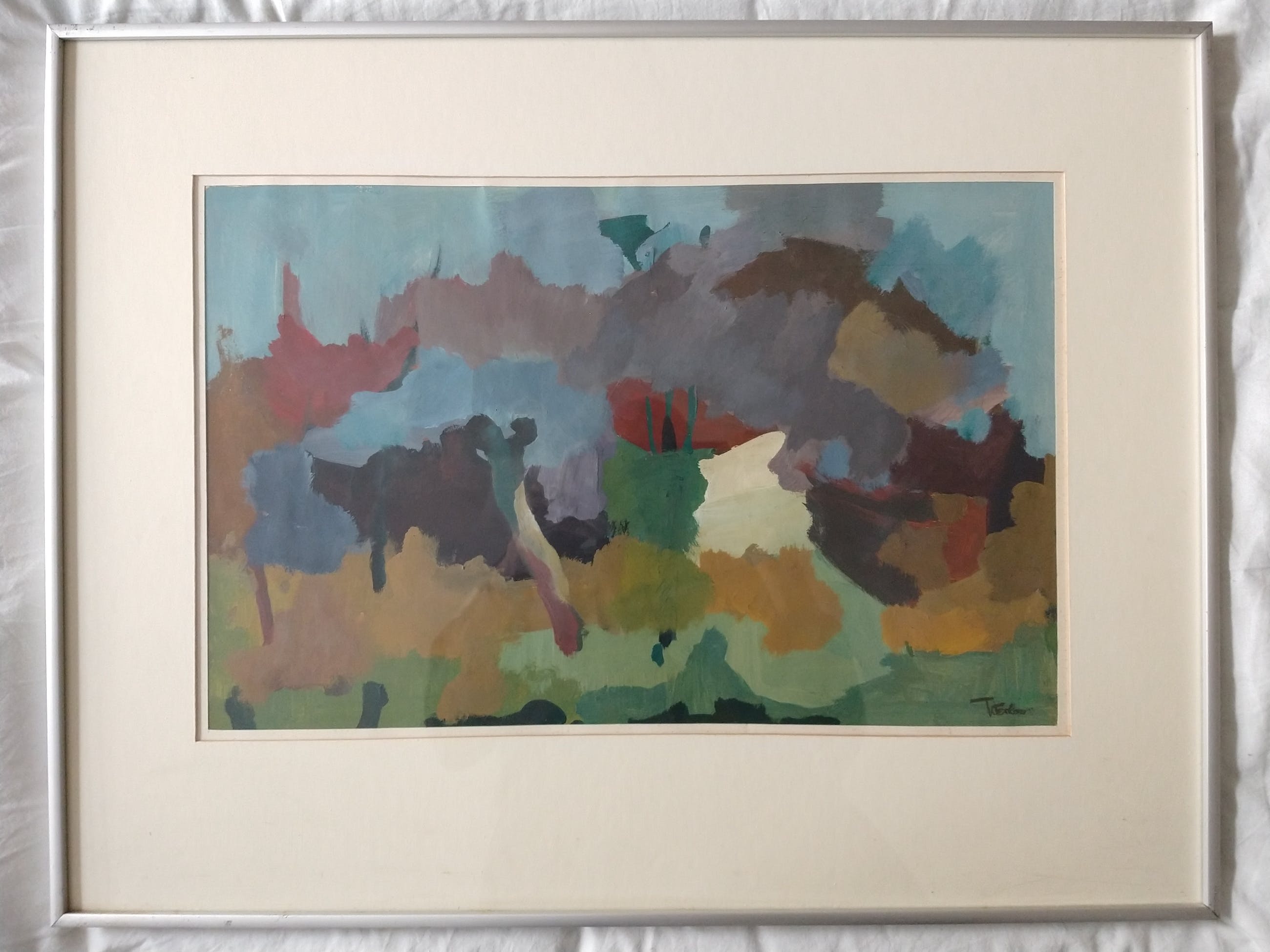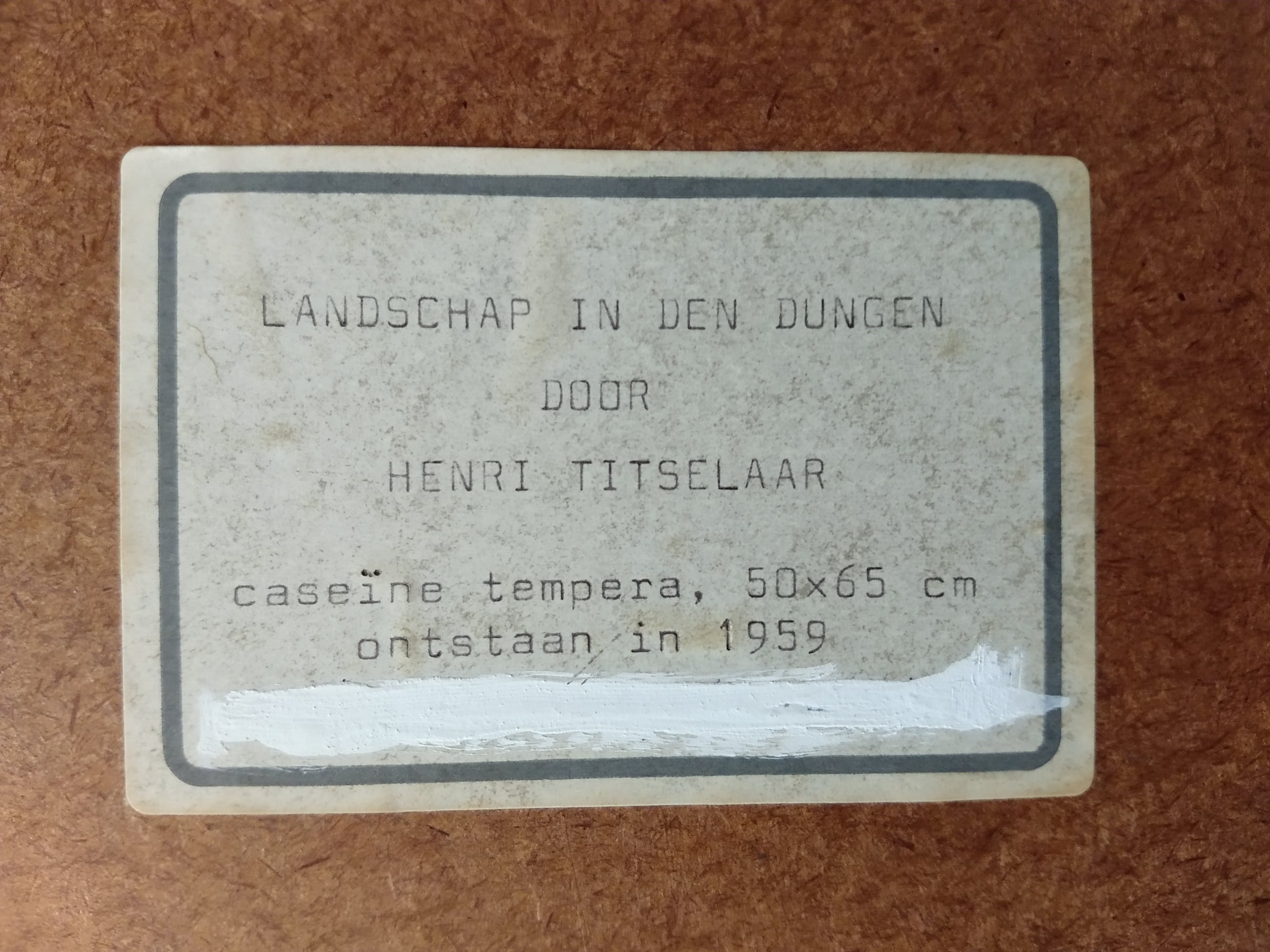 Henri Titselaar (Sittard 1917)."Mijn persoonlijke artistieke intenties worden gecreëerd vanuit een onderbewuste wereld, die verband houdt met kosmologische, biologische en psychologische tendensen, die het hele leven bepalen. Met andere woorden, gestalte geven op een plat vlak met vormen, die van wereldbeschouwelijke aard zijn. Uit deze onzichtbare realiteit ontstaan vormen, die enigszins surrealistisch aandoen. De vrije vorm en de kleur geven enorme mogelijkheden, vooral omdat het toeval hier in de kaart gespeeld wordt."