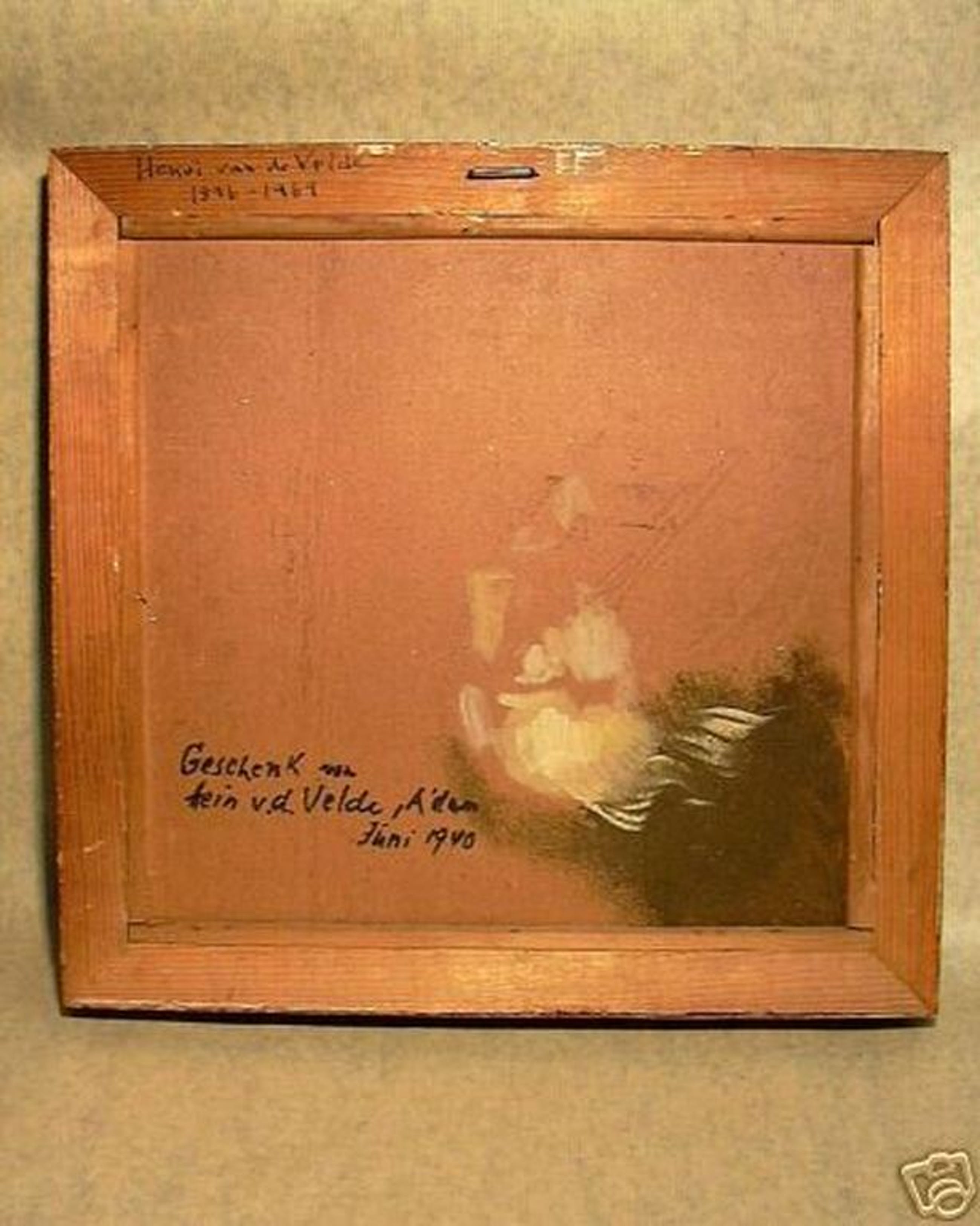 Zelden op de markt, een schilderij (32 x 32) van een in extase lijkende, opkijkende man, zeer typisch in zijn eigen stijl. Verso staat vermeld: "Geschenk von Hein van de Velde, juni 1940". Van deze kunstenaar kocht het Rijksmuseum enige jaren geleden een groot en omstreden werk ("De Nieuwe Mensch") waarvan was gedacht dat het tijdens de chaos van de bevrijdng verloren was gegaan. Het had tijdens de oorlog in het kantoor van NSB kopstuk Mussert te Utrecht gehangen. Van de Velde was dan ook niet bepaald onomstreden waar het ging om zijn rol en houding (was ook lid van de NSB) tijdens de 2e wereldoorlog en werd na de bevrijding dan ook gevangengezet, na ca. 1 jaar in vrijheid gesteld en in 1948 gerehabiliteerd. Maar de kunstwereld negeerde hem voor de rest van zijn leven.