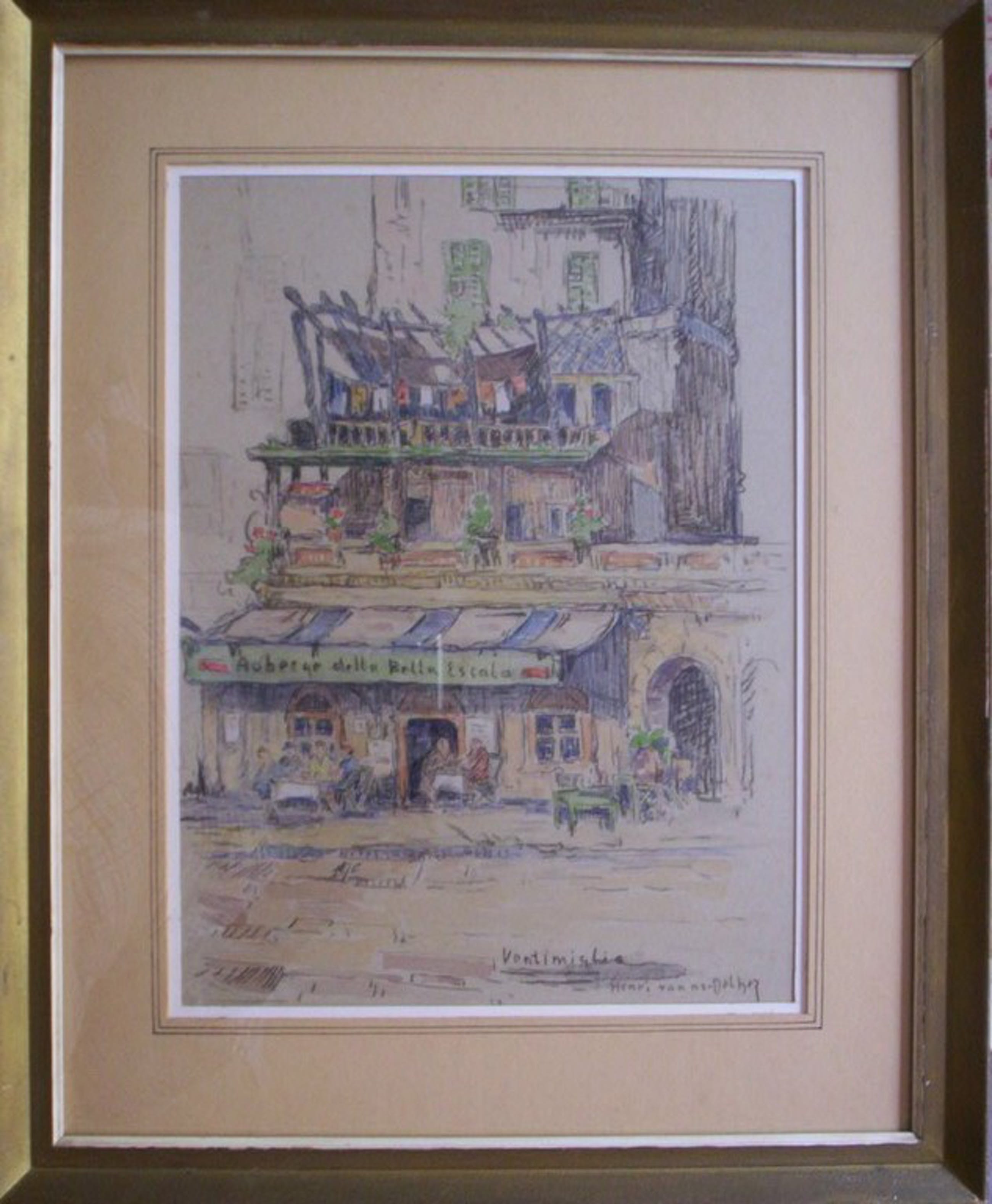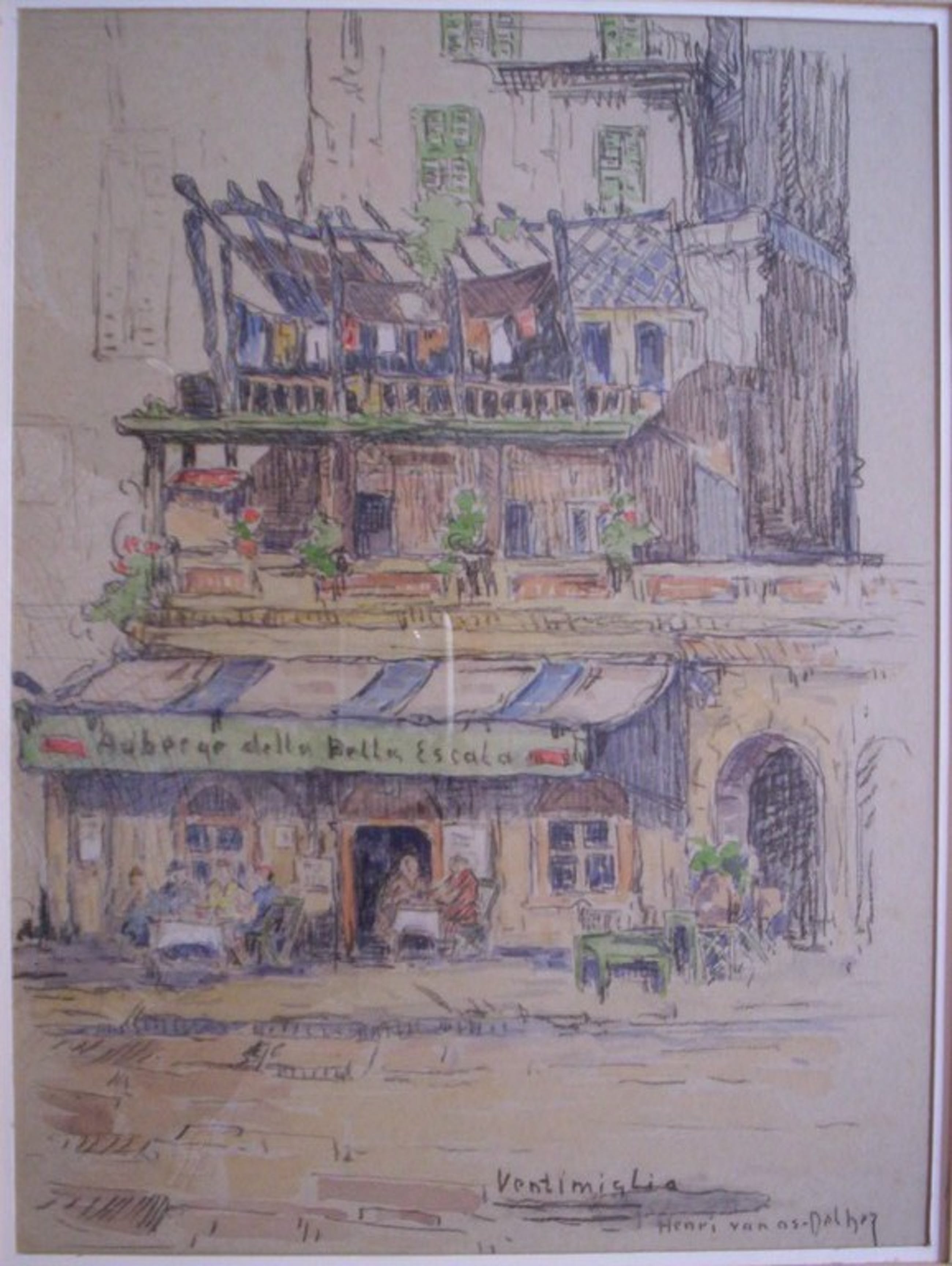 Mooi gemengde techniek van de bekende kunstenaar Henri van Os-Delhez. Gesigneerd met de tekst:"Auberge della Bella Escala. Ventimiglia-Italië". Henri van Os-Delhez werd op 20 oktober 1880 geboren te Nieuwer-Amstel en overleed in 1976. Oorspronkelijk werd hij opgeleid voor decorateur en bezocht de Ambachtschool en de Tekenschool voor Kunstambachten te Amsterdam. Hier ontving Henri van Os Delhez hij zijn eerste onderscheiding. De bekende landschapschilder A.M. Gorter gaf hem ook nog enige tijd les. Hij ontwierp ter gelegenheid van de kroning van H.M. Koninging Wilhelmina de versiering van de Vijzelstraat te Amsterdam. Later bij Hotel Hamdorff de carnavals "Sous les toits de Paris" en "Carnaval in het paleis van Neptunis". Henri Van Os-Delhez schilderde stadsgezichten, landschappen en interieuren maar hij gaf de voorkeur aan bloemen en stillevens. Hij werkte ook in Parijs. Hij was lid van de kunstverenigingen Arti et Amcictiae te Amsterdam, de Gooische schildersvereniging te Laren, St. Lucas en de Onafhankelijken. Op de tentoonstelling "De kunst van heden" in het Rijksmuseum te Amsterdam werden van zijn vier ingezonden werken er twee gekozen voor een expostie in het Museum voor Schone Kunsten te Brussel een een derde voor een tentoonstelling in het Gemeente Museum te Arnhem. Hij exposeerde in vele plaatsen in Nederland en ook in het buitenland, Parijs, Brussel, en Nederlands Indië. Werk o.a. in het bezit van Singer Museum te Laren nh en de Rijkscollectie. Afmetingen inclusief lijst:43x54 cm.Herkomst:Collectie Streefoord Eemnes.