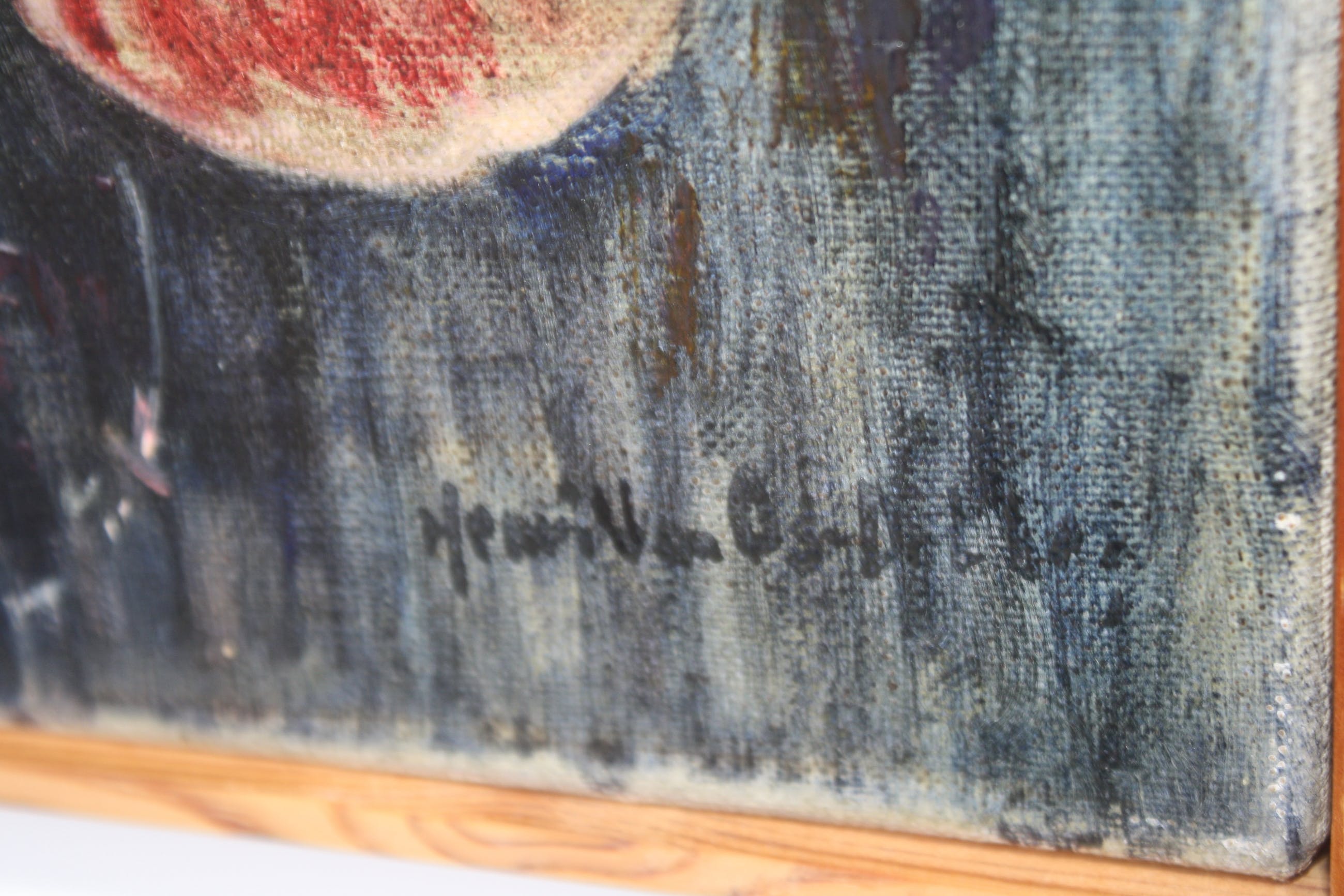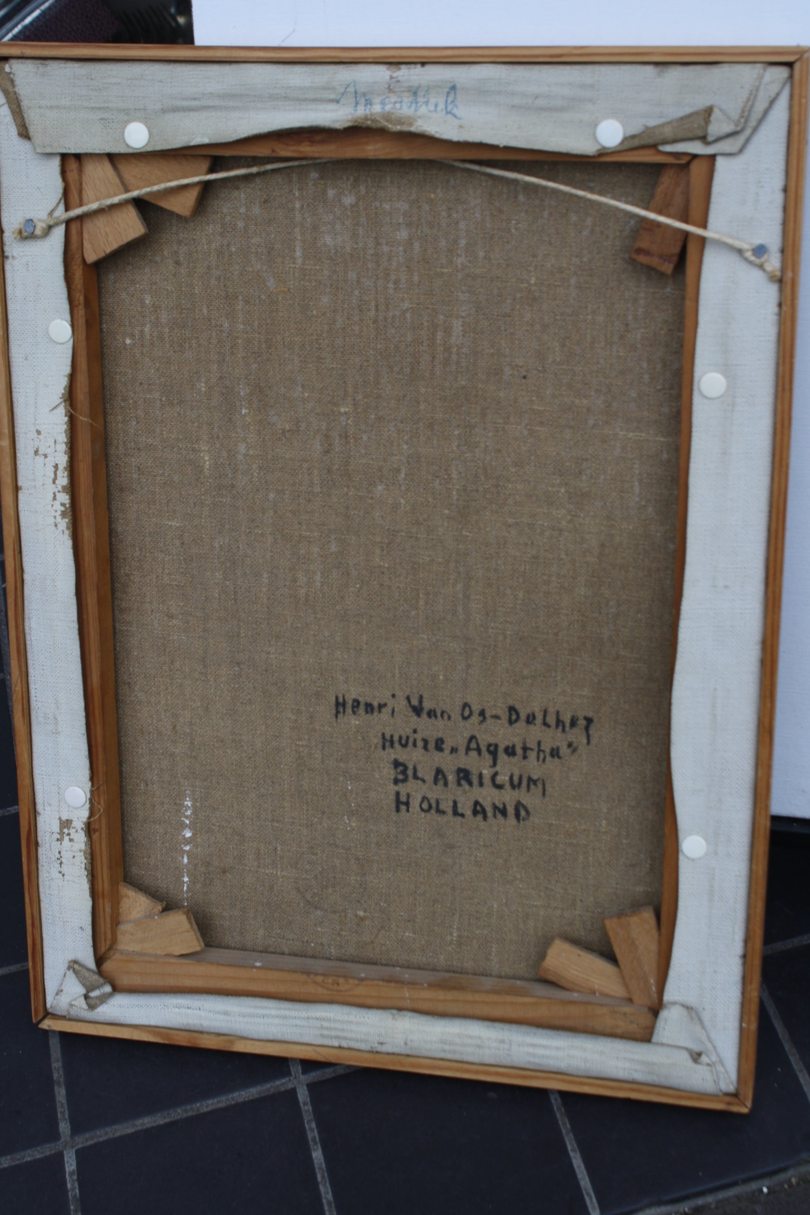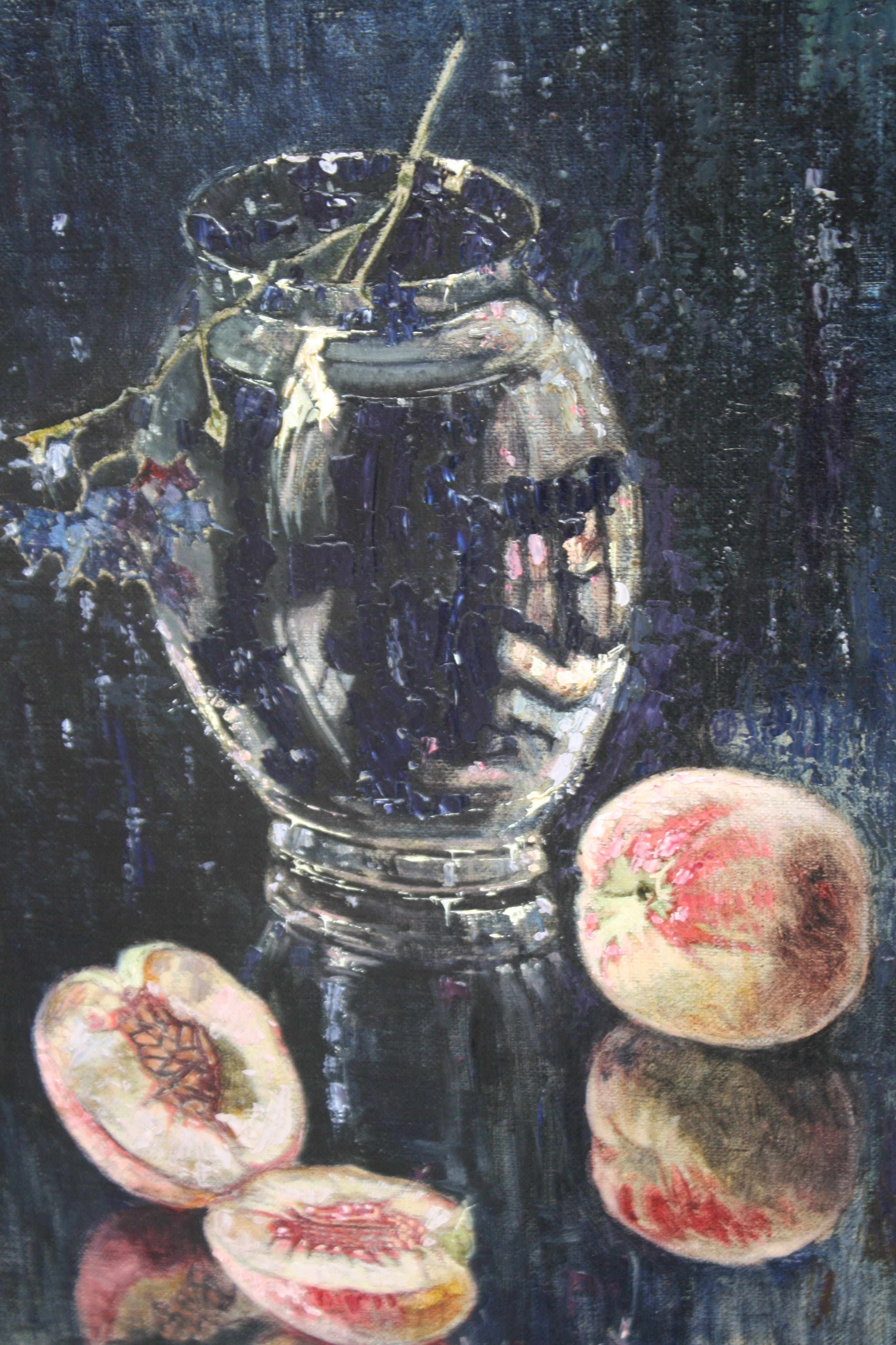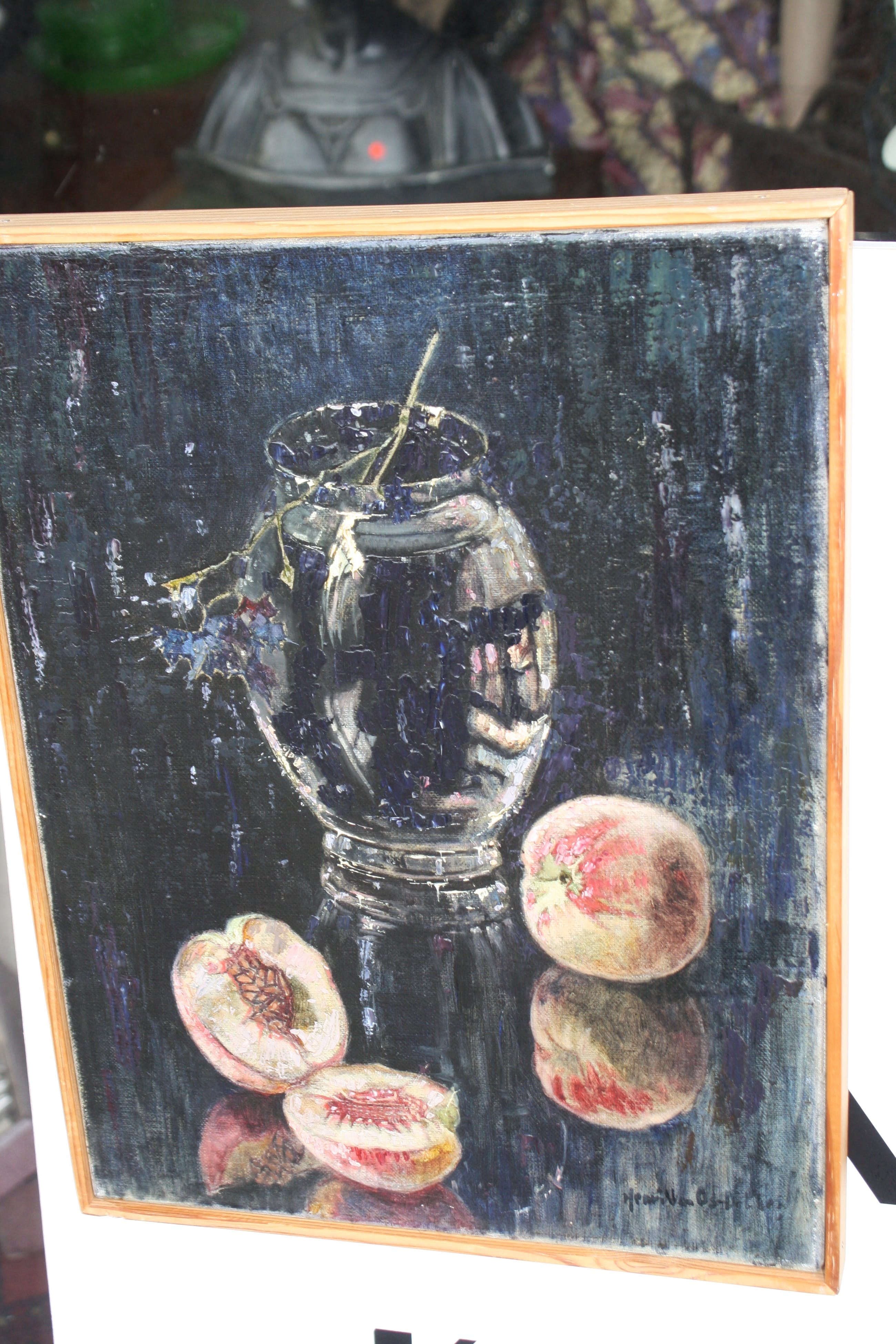 henri van os delhez stilleven vaas en perzik olieverf op linnen in de maat 30 x 40 gesigneerd onder en op achterzijde in dun houten lijstje