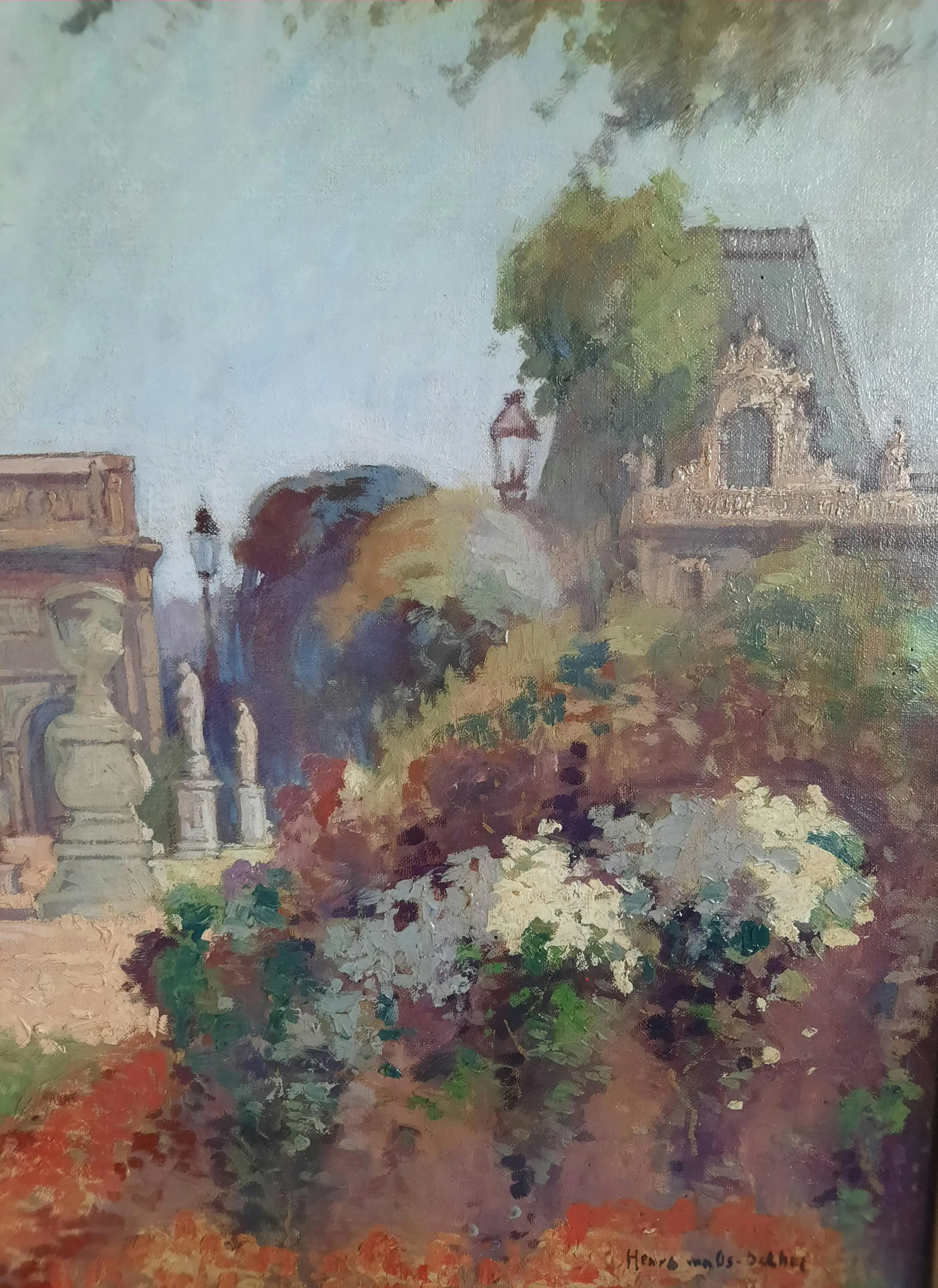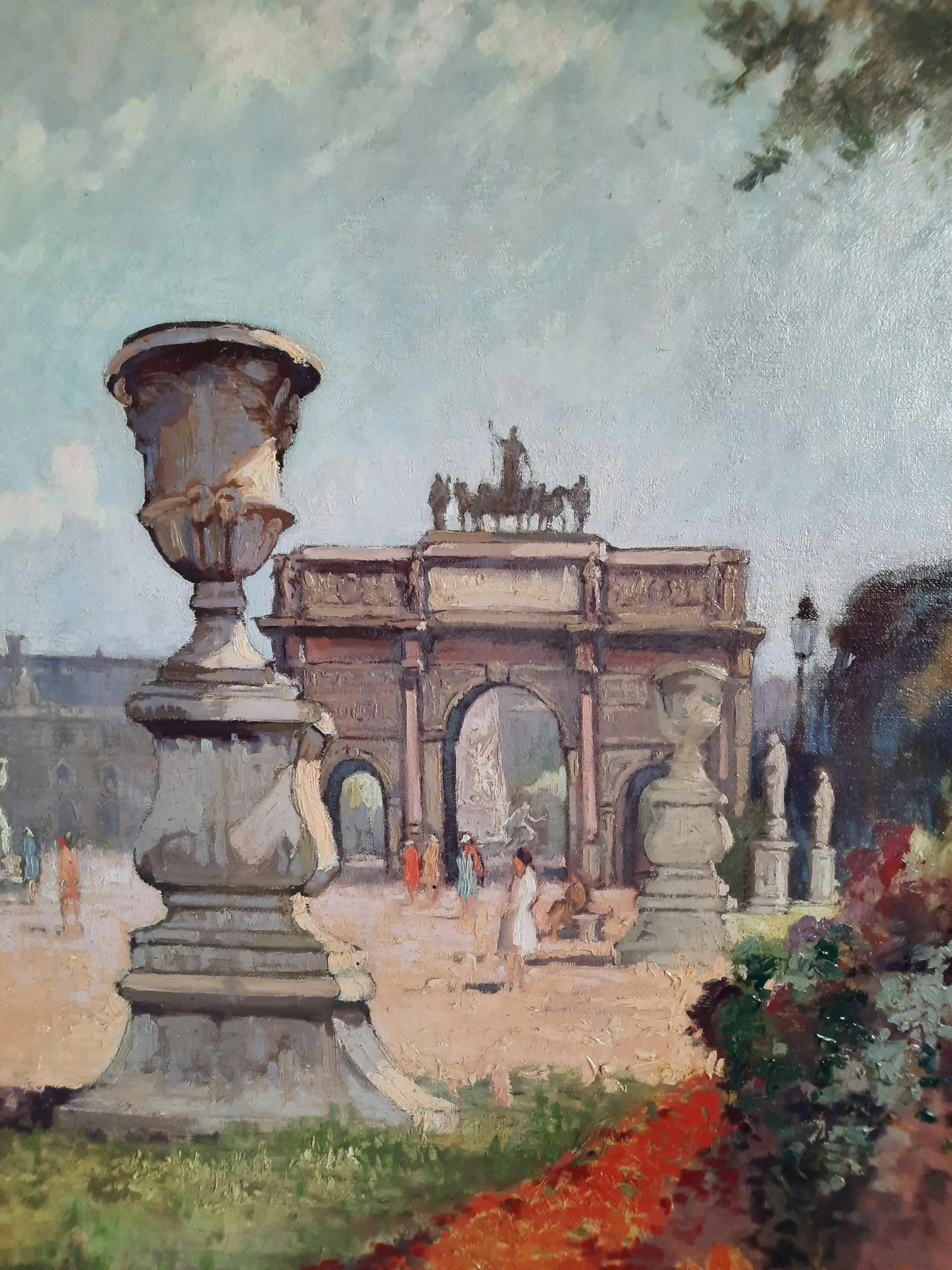 Door Henri van Os -Delhez in frisse, heldere kleuren geschilderd vanuit het park de Tuilerieën met uitzicht op de Arc de Triomph du Carrousel.