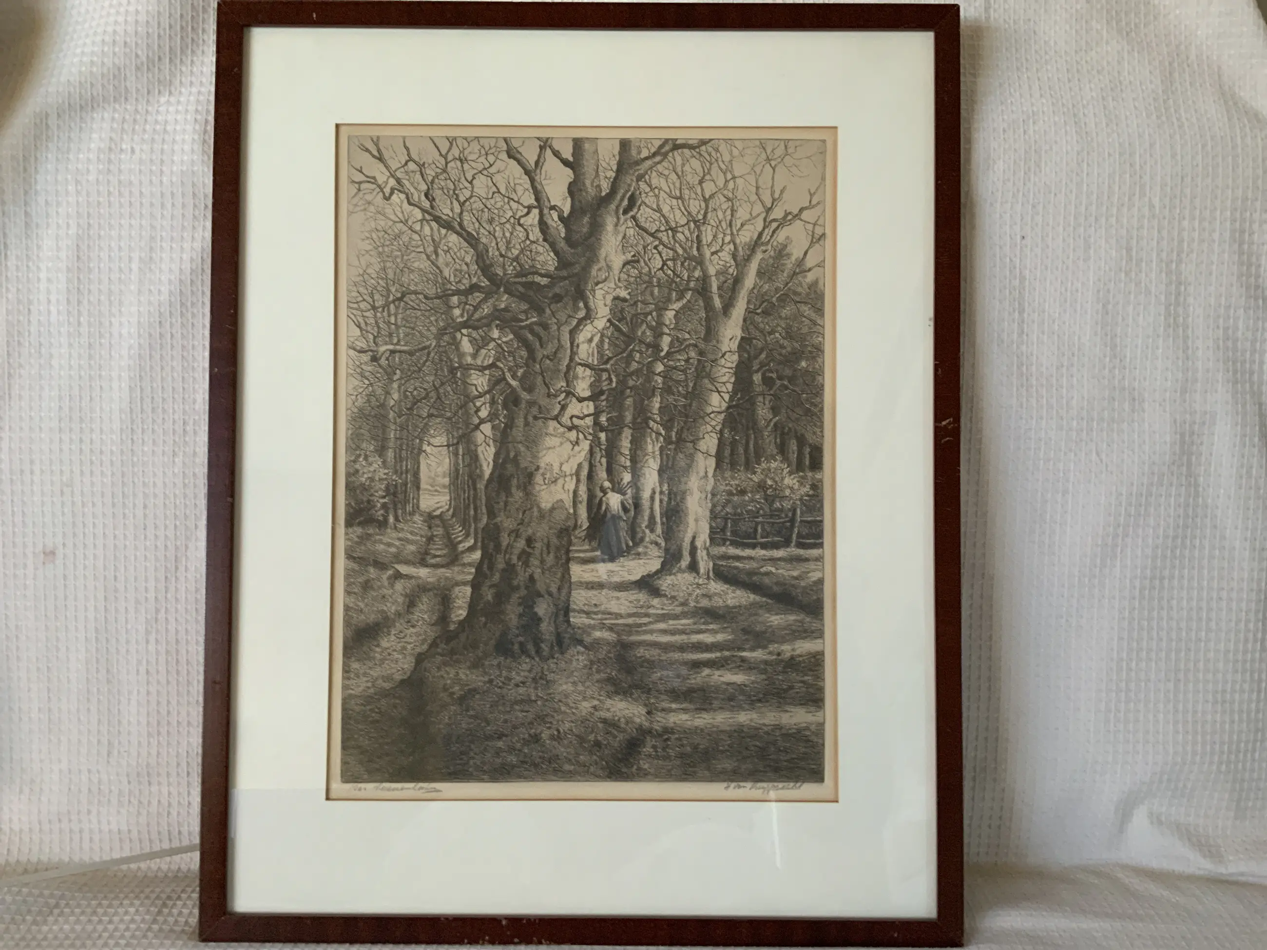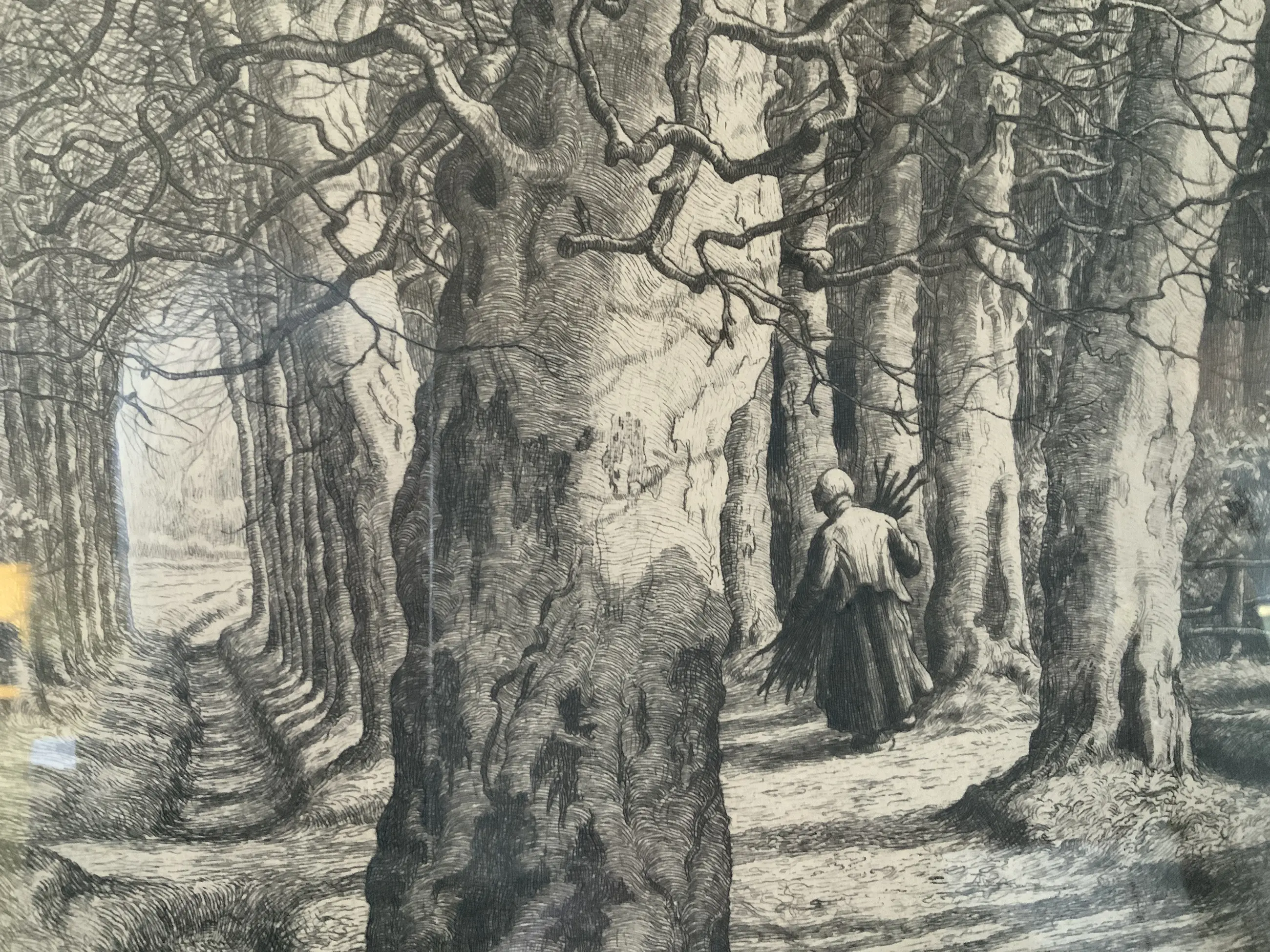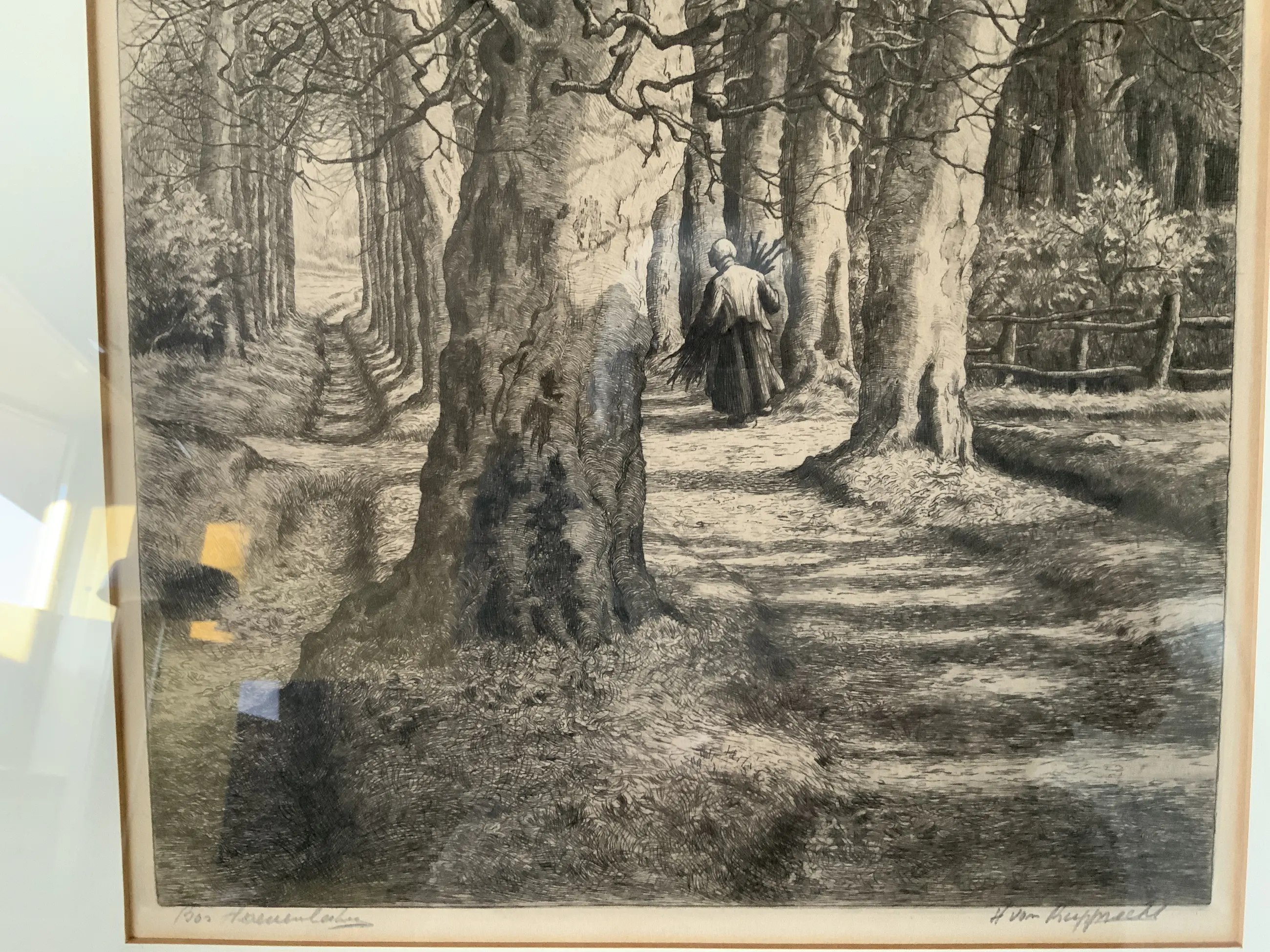 Dit is ets van Henri von Rupprecht ( 1891-1970). Henri was een beeldendkunstenaar uit Amersfoort. Hij stond vooral bekend om zijn gedetailleerde etsen en pentekeningen, waarbij hij vaak stadsgezichten en boslandschappen vastlegde. Zijn werk wordt gekenmerkt door een realistische stijl. De ers toont een boslandschap met een vrouw die hout aan het sprokkelen is op een bospad. Rechtsonder is het werk handgesigneerd en links onder lijk ik te lezen Bos Hoevenlaken.
