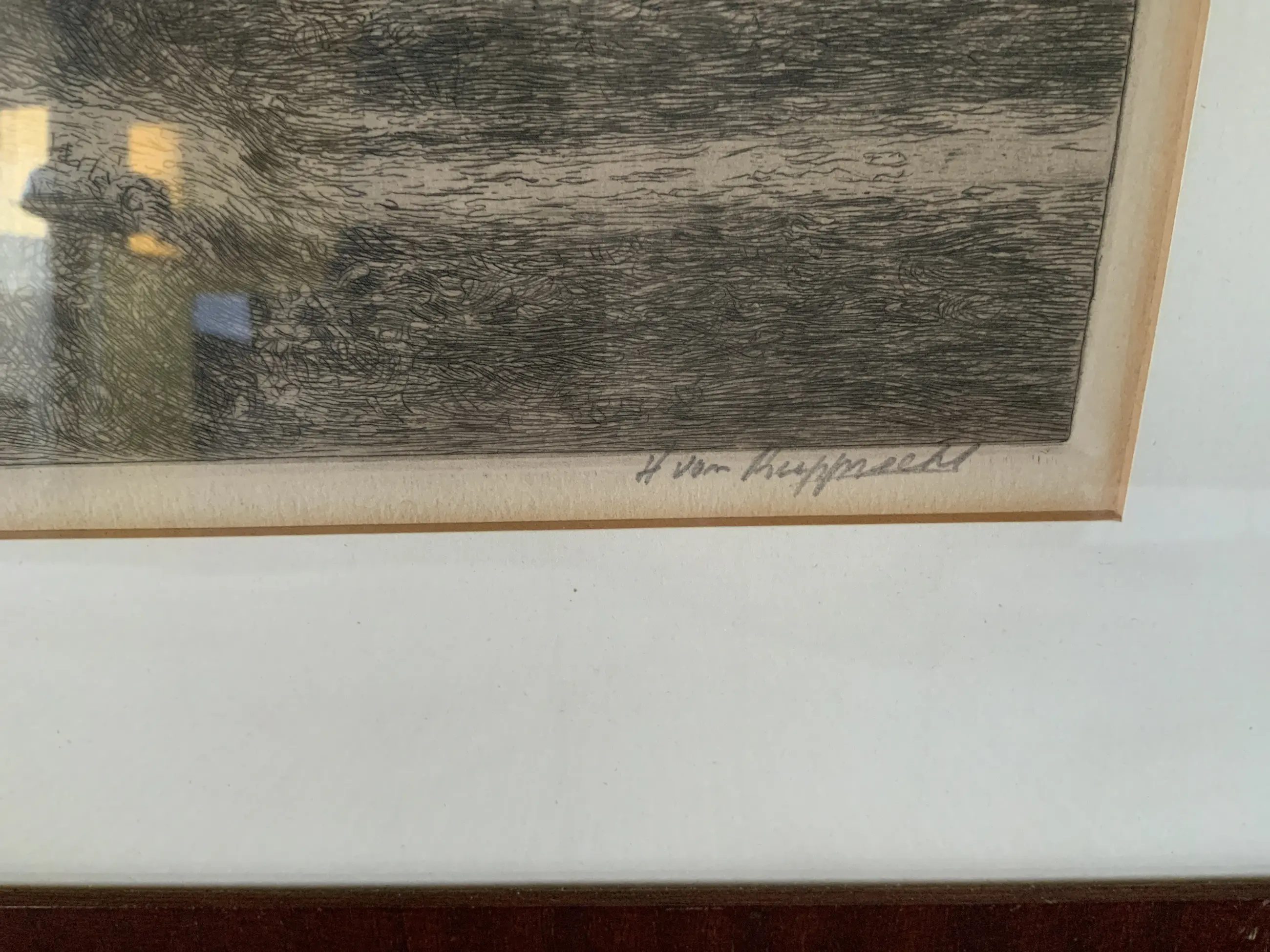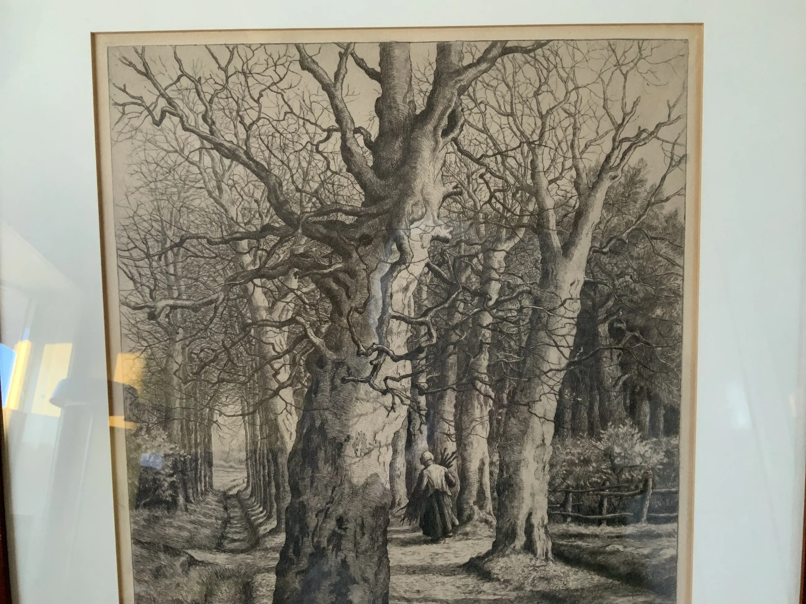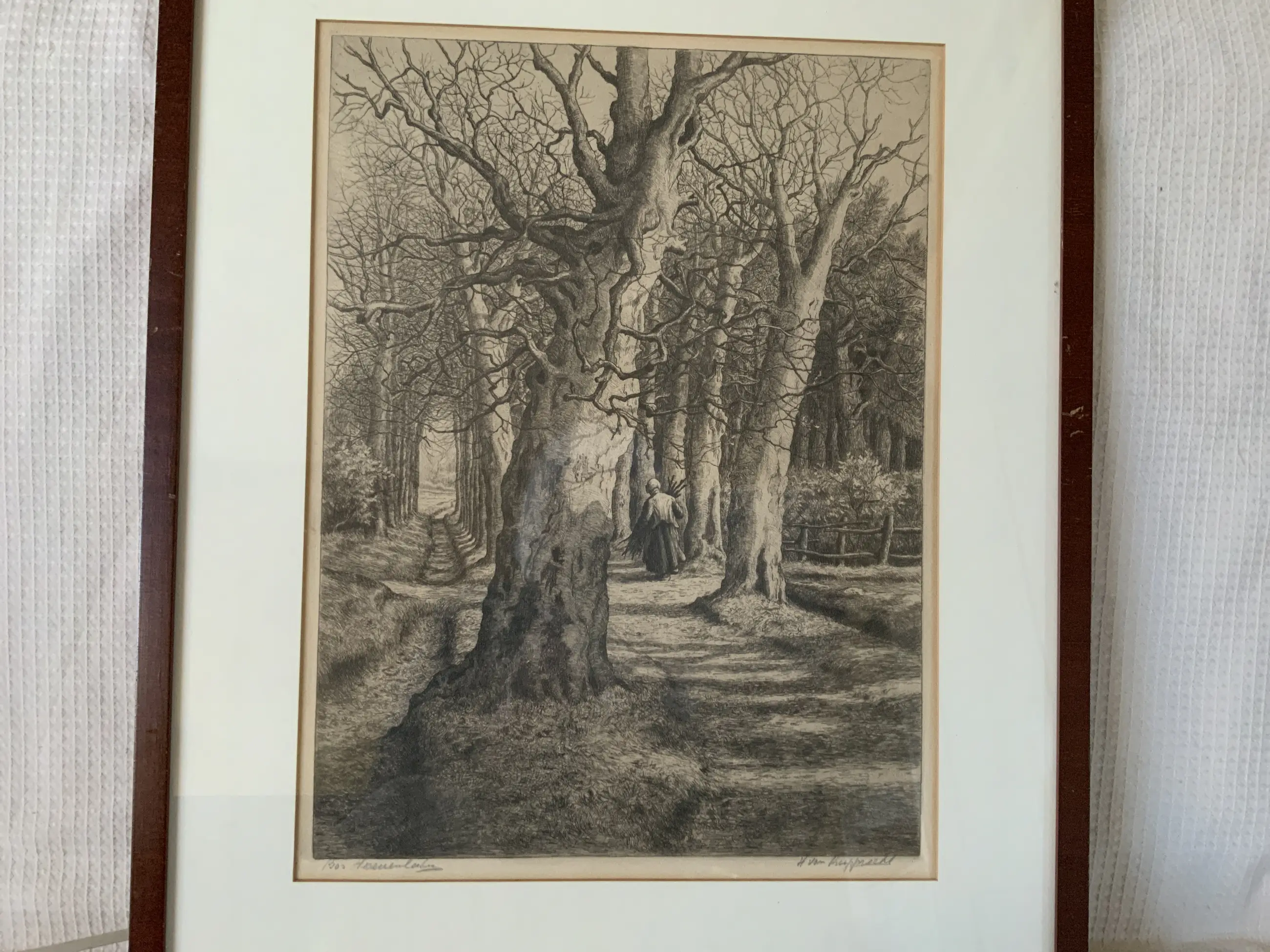 Dit is ets van Henri von Rupprecht ( 1891-1970). Henri was een beeldendkunstenaar uit Amersfoort. Hij stond vooral bekend om zijn gedetailleerde etsen en pentekeningen, waarbij hij vaak stadsgezichten en boslandschappen vastlegde. Zijn werk wordt gekenmerkt door een realistische stijl. De ers toont een boslandschap met een vrouw die hout aan het sprokkelen is op een bospad. Rechtsonder is het werk handgesigneerd en links onder lijk ik te lezen Bos Hoevenlaken.