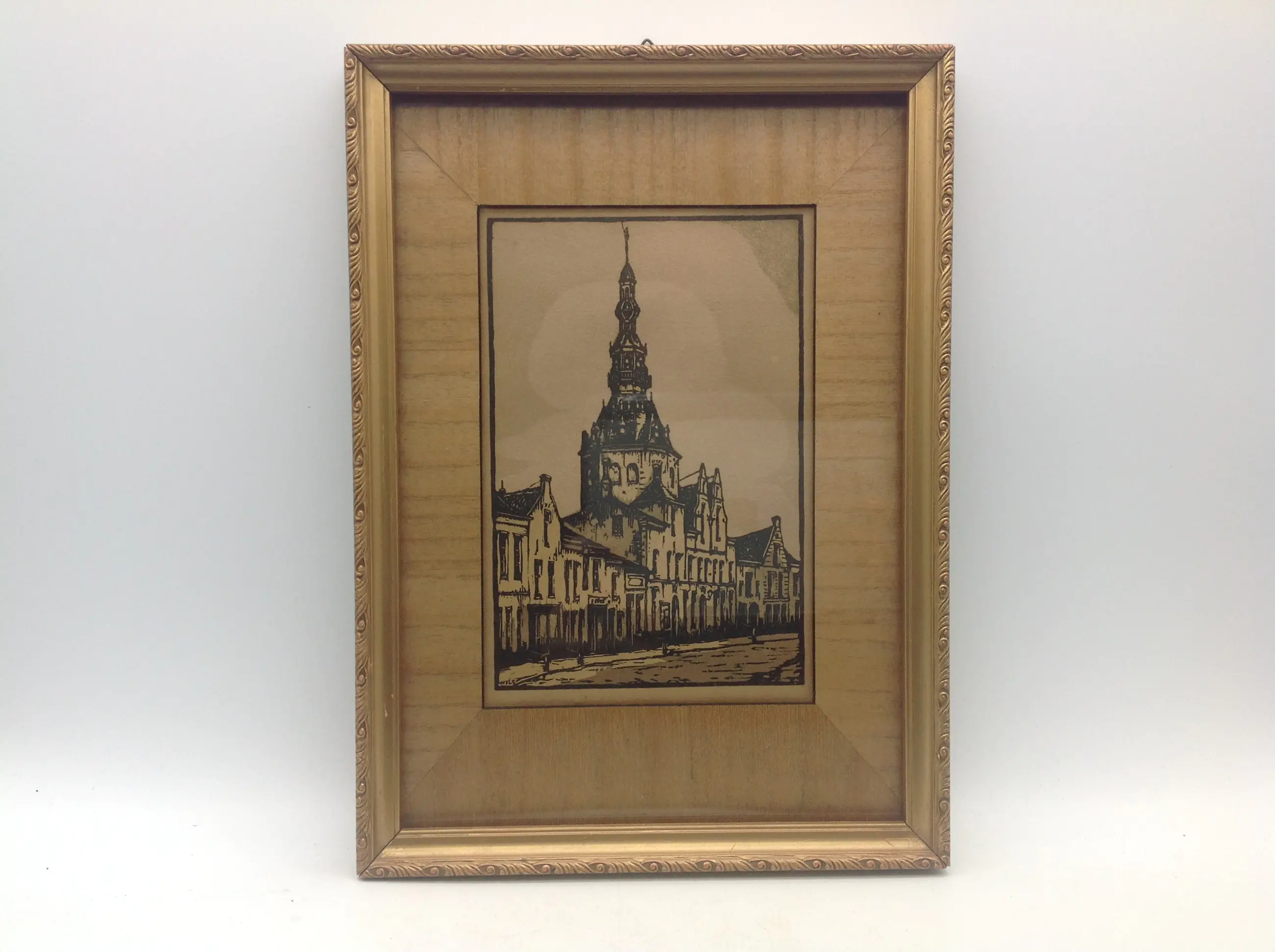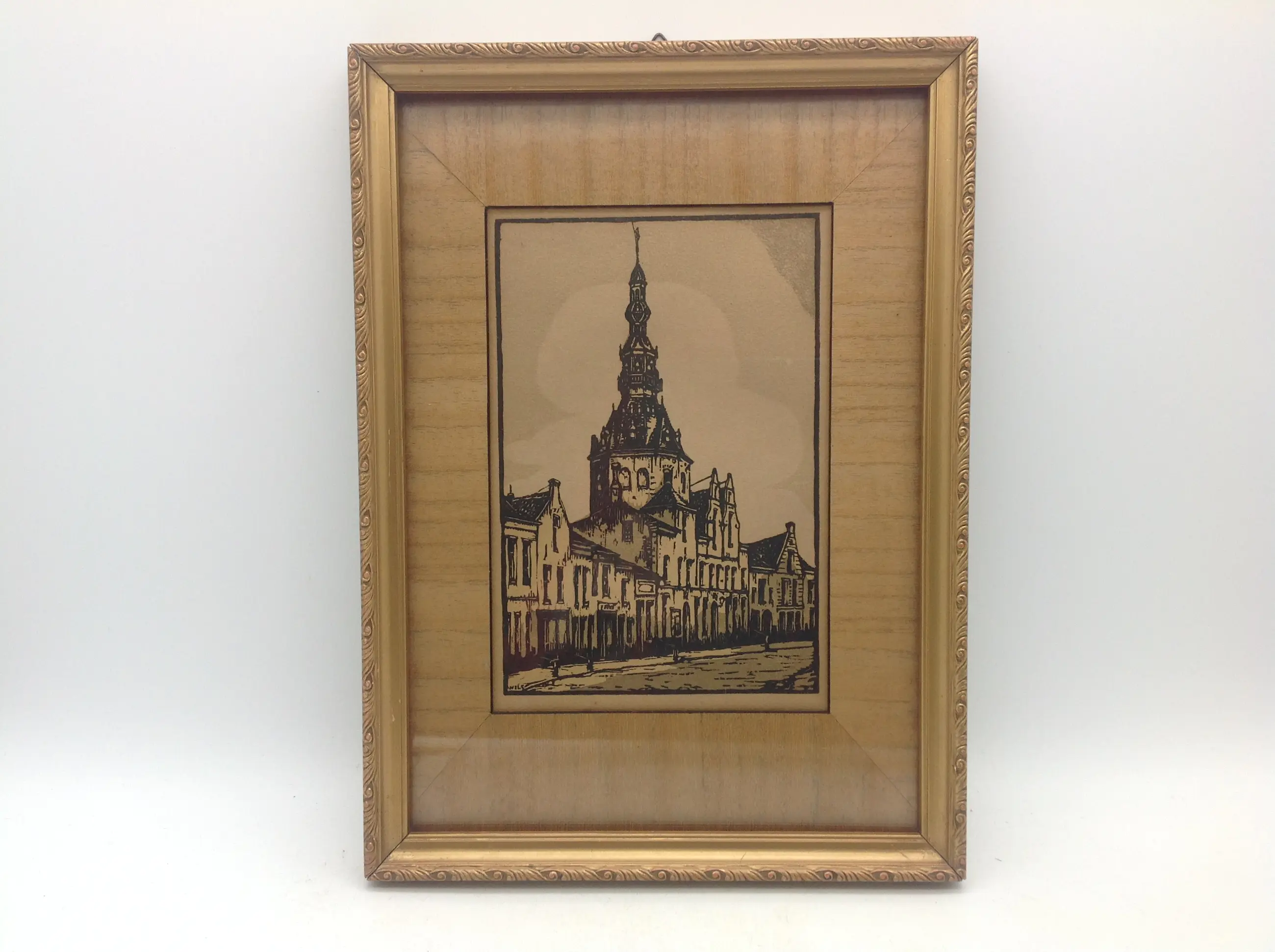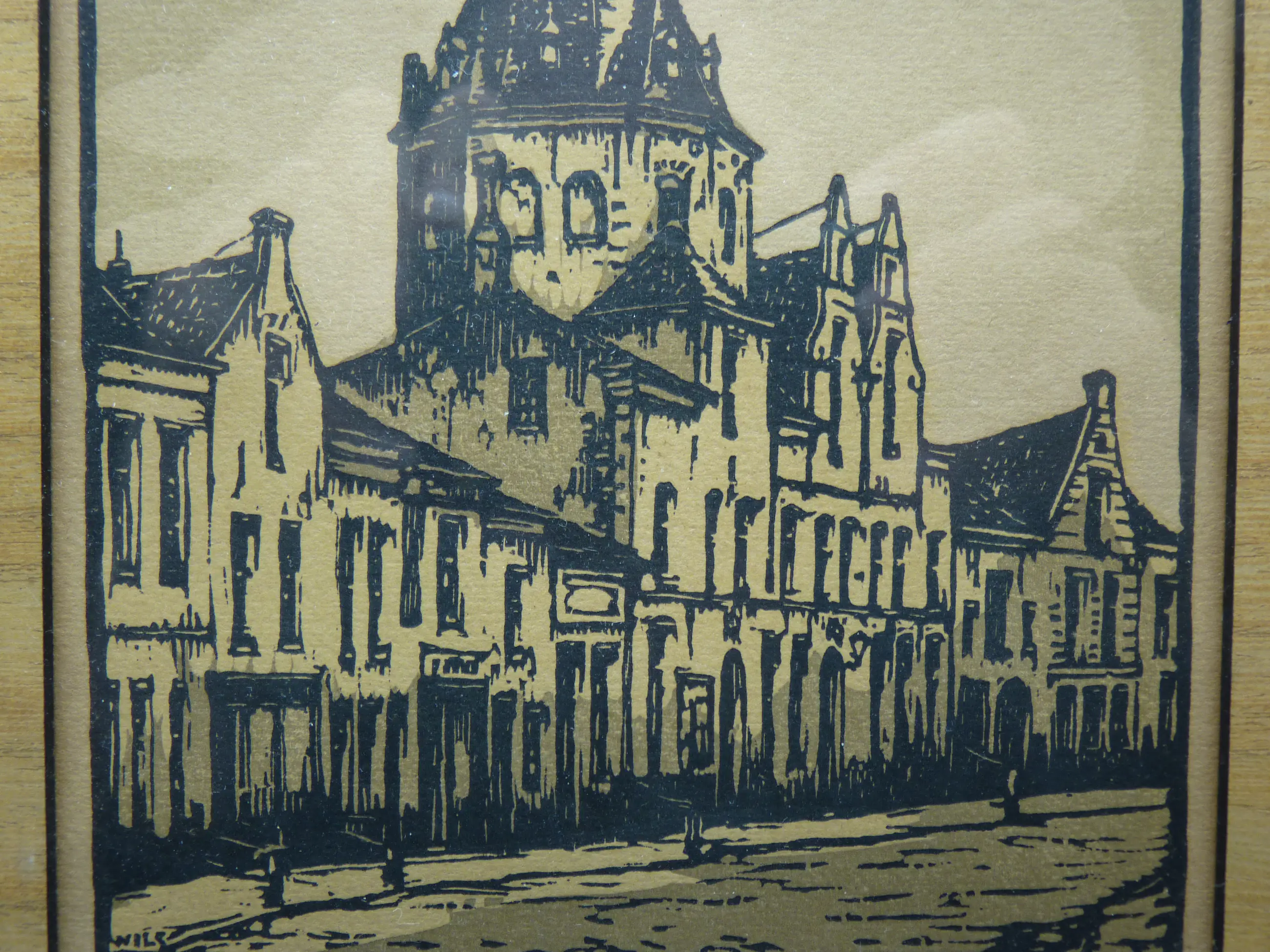 Mooie houtsnede van het stadhuis in Zierikzee, gemaakt door de Belgische kunstenaar Henri Wils, linksonder gesigneerd in de houtsnede zelf: wils.
