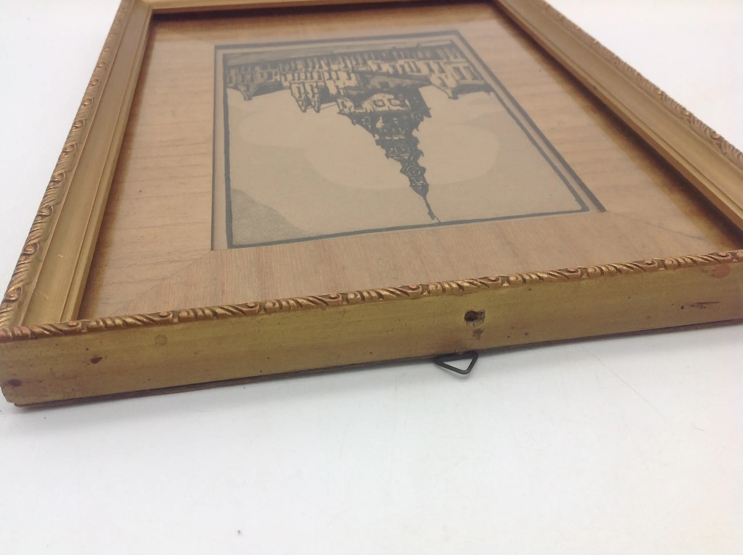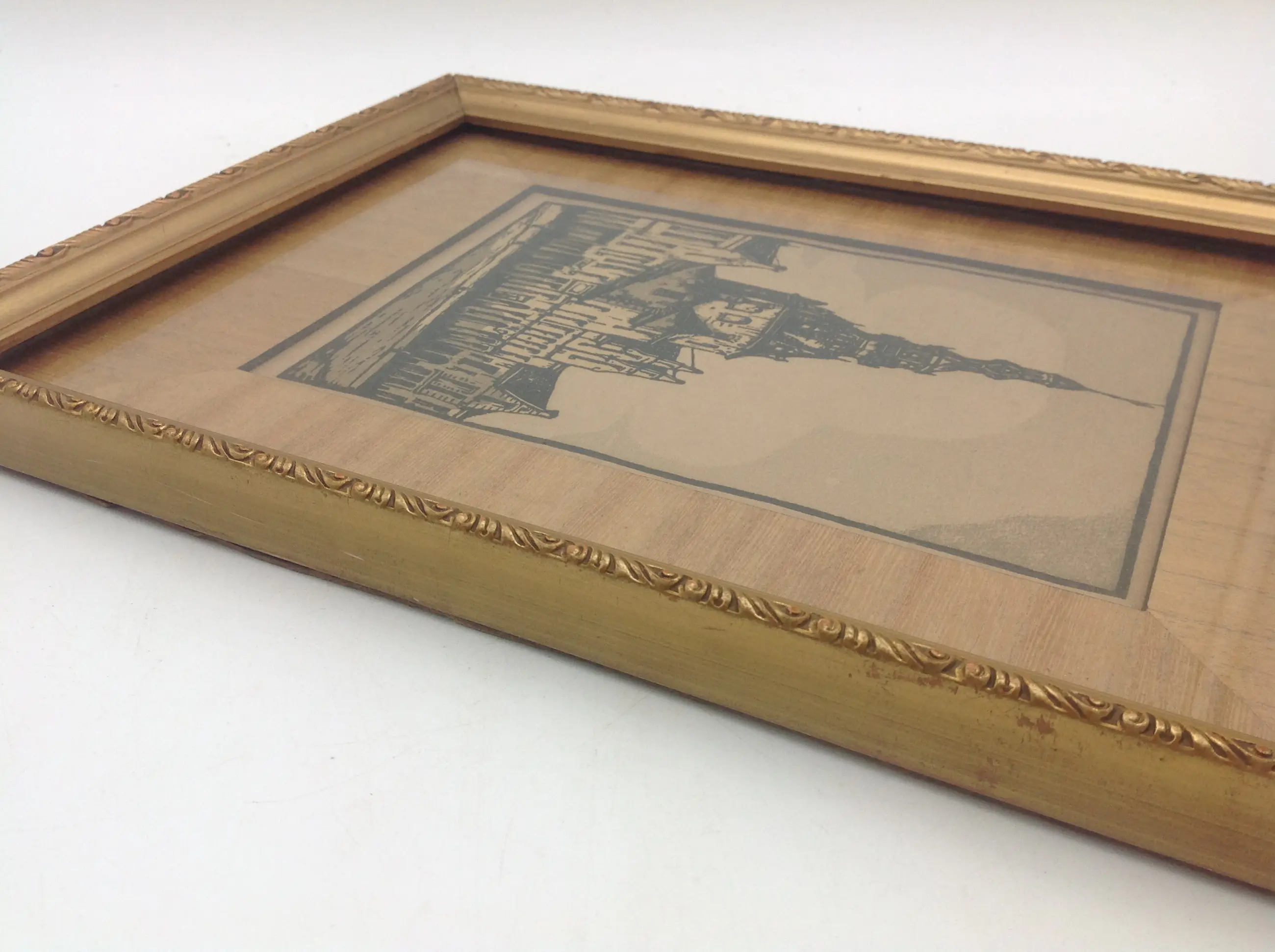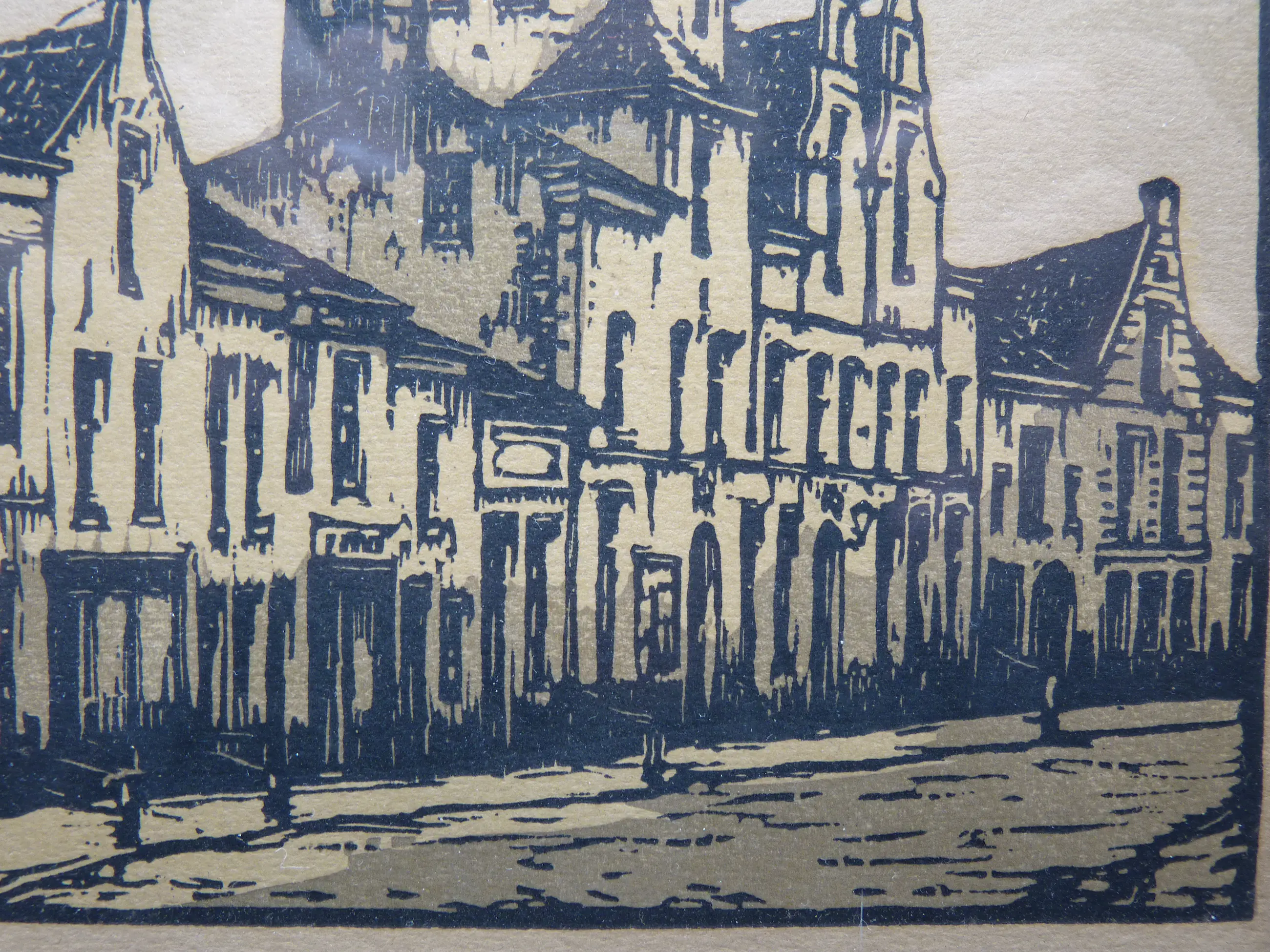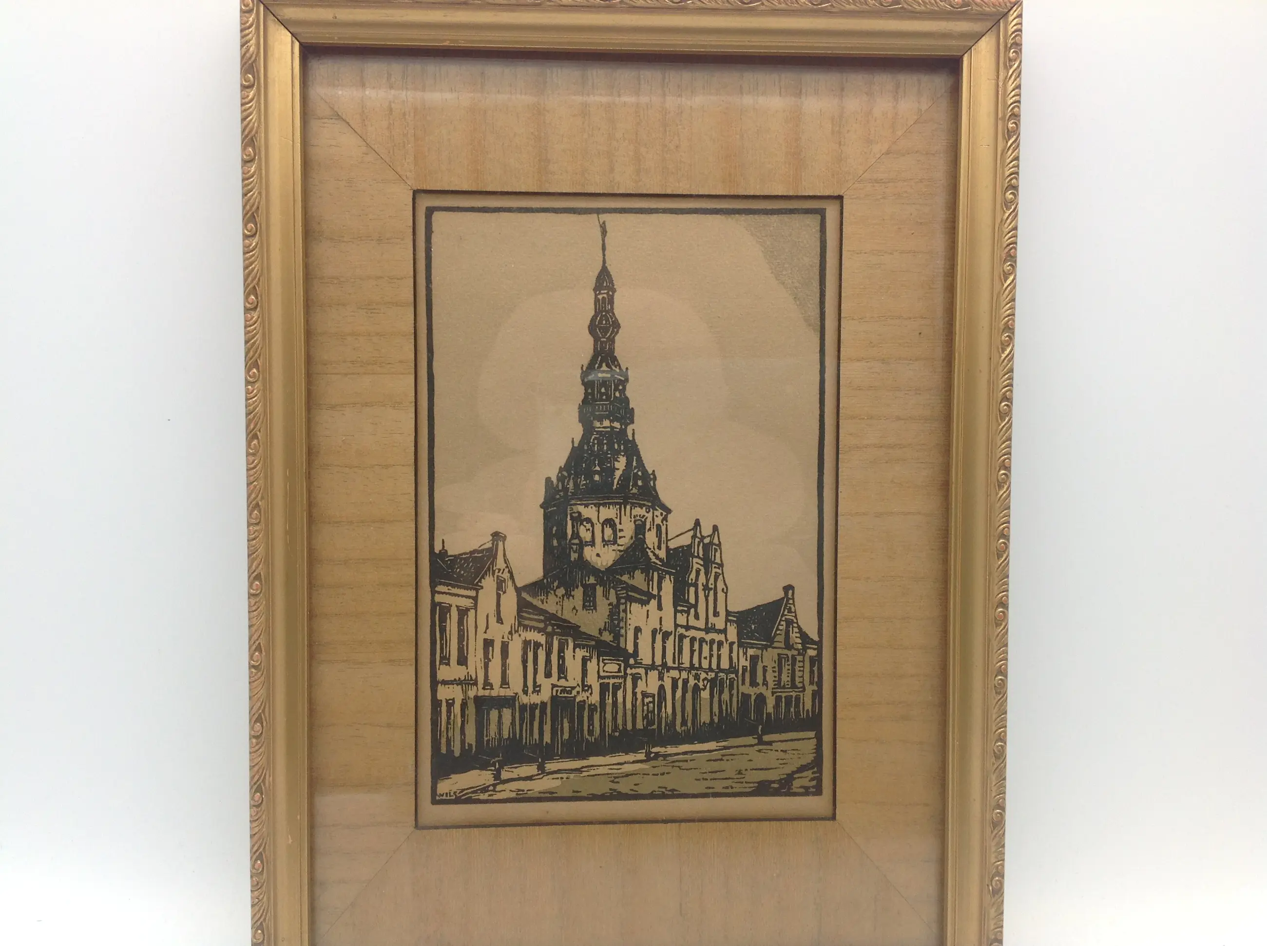 Mooie houtsnede van het stadhuis in Zierikzee, gemaakt door de Belgische kunstenaar Henri Wils, linksonder gesigneerd in de houtsnede zelf: wils.