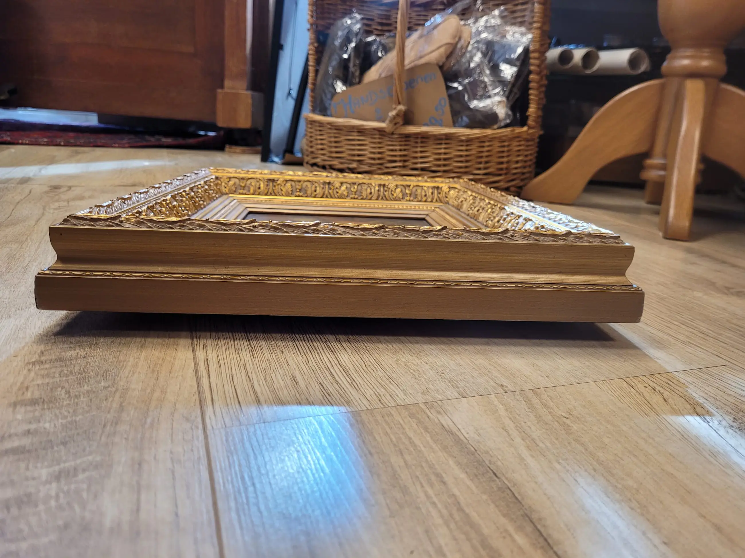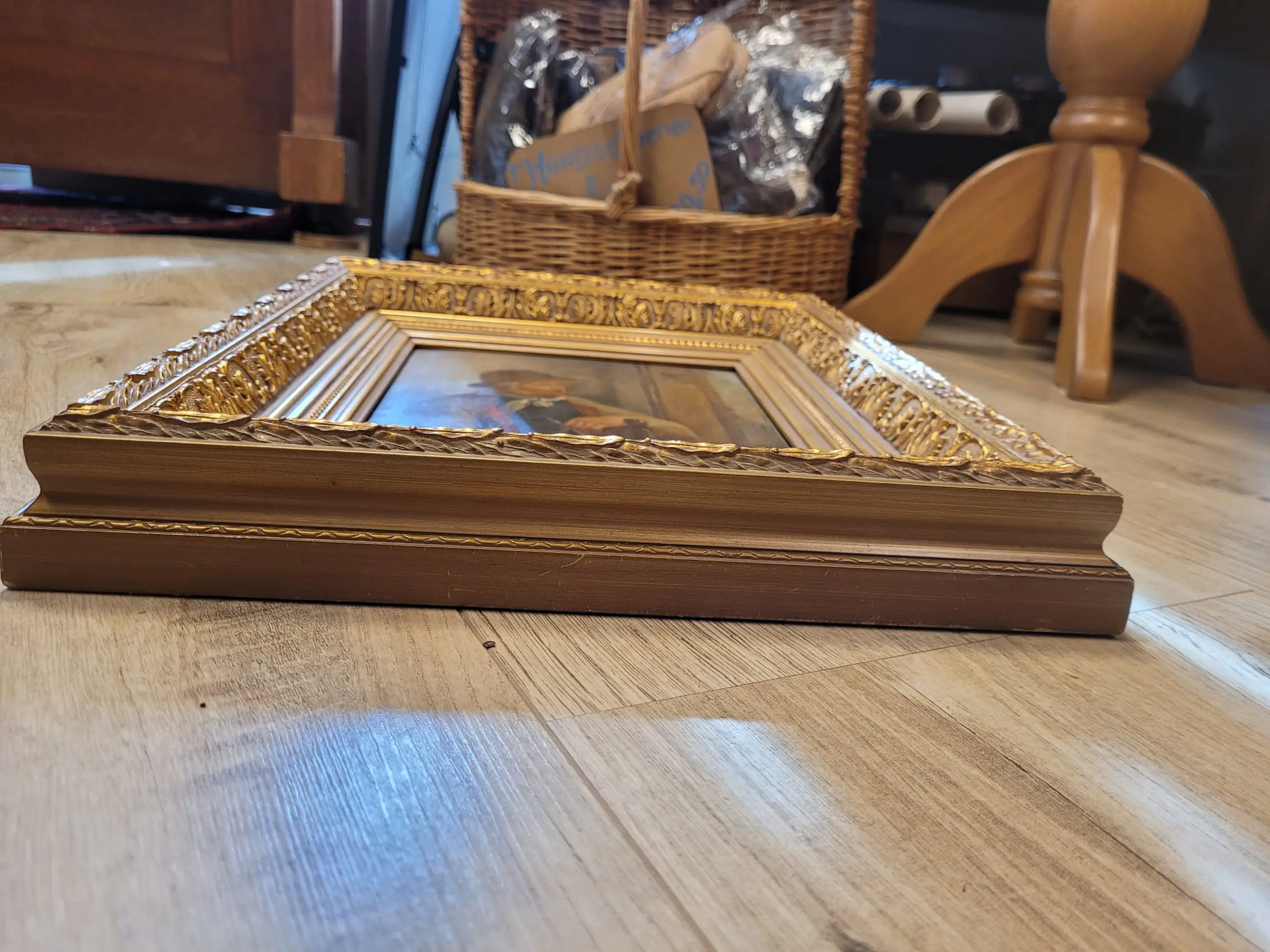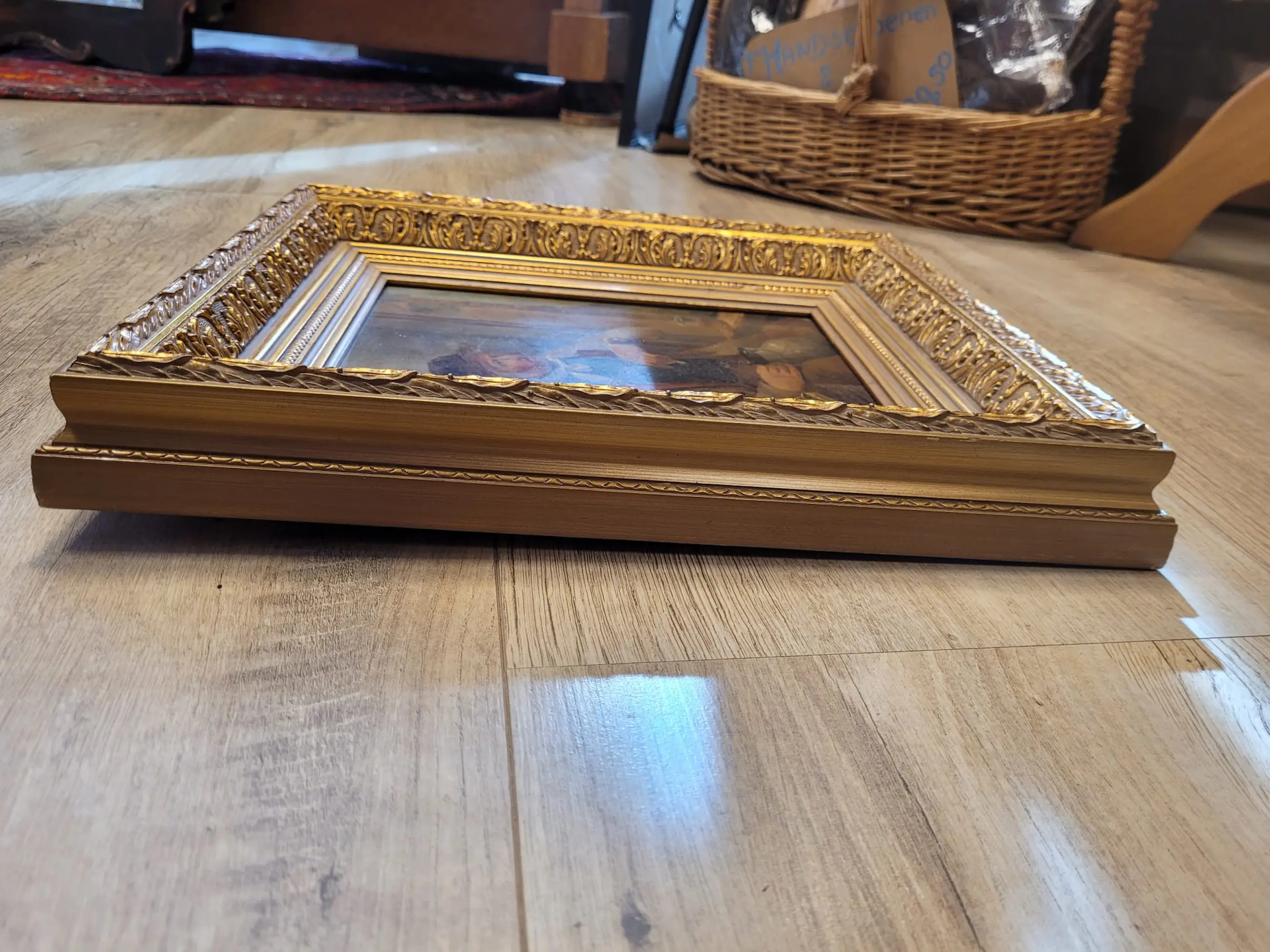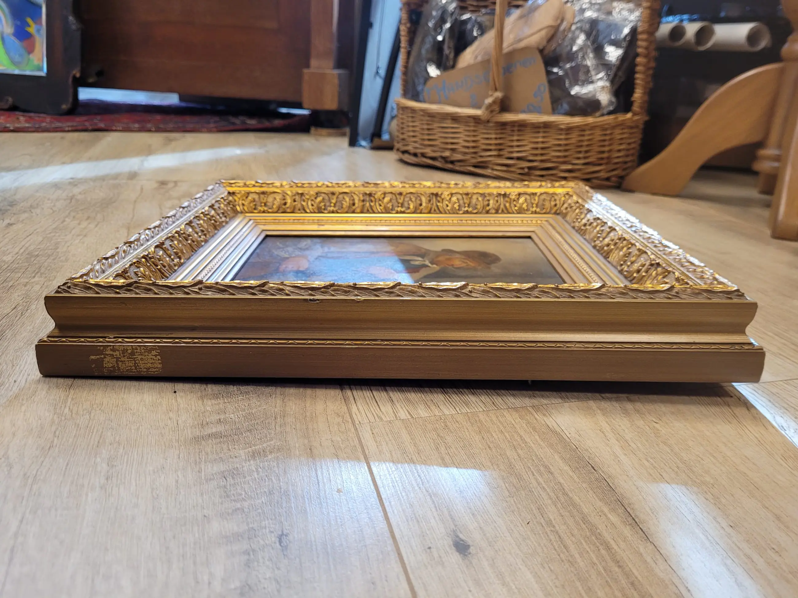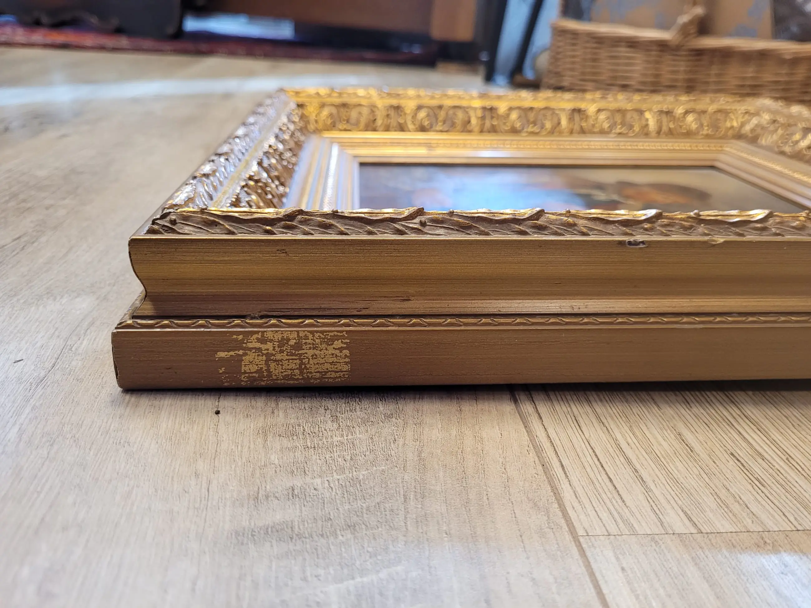Op de rechterzijkant is iets een verkleuring op de lijst, alsof daar een stickertje heeft gezeten, waardoor die plek nog iets meer goudkleur heeft. Op diezelfde kant een klein butsje in de lijst. Beide te zien op een foto.