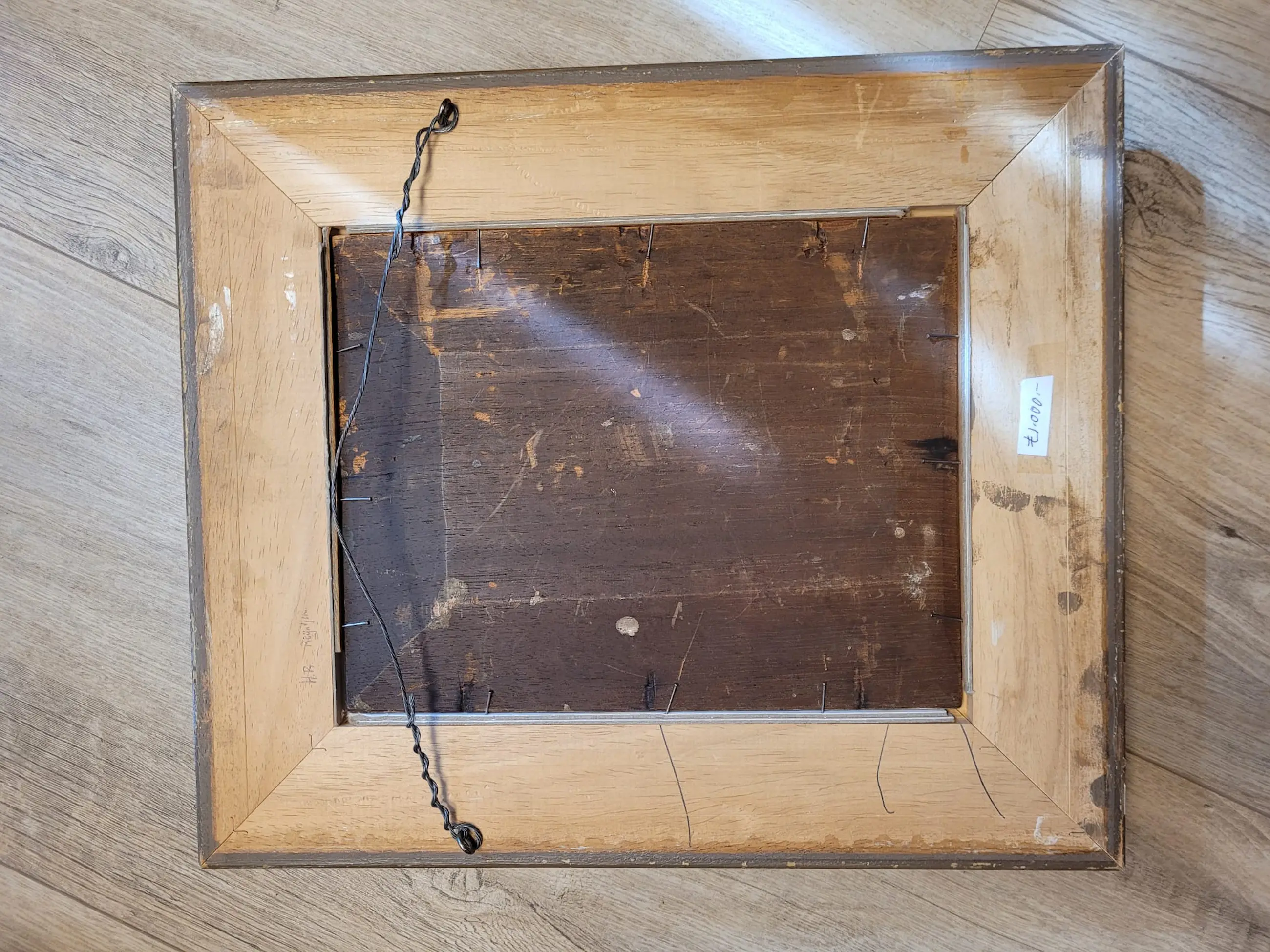 Het randje direct onder het werk heeft iets een scheurtje in de lijst. tevens op foto.