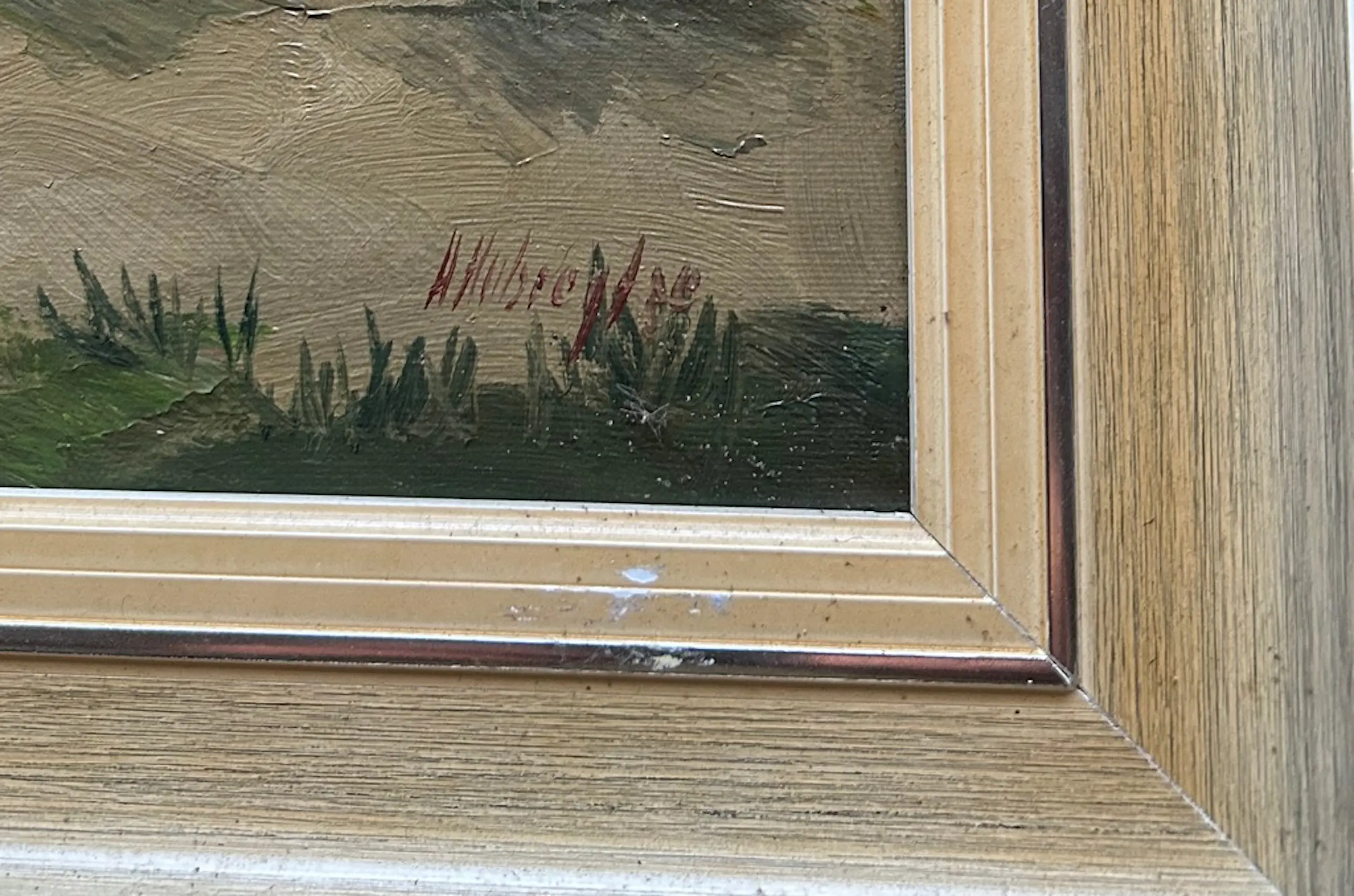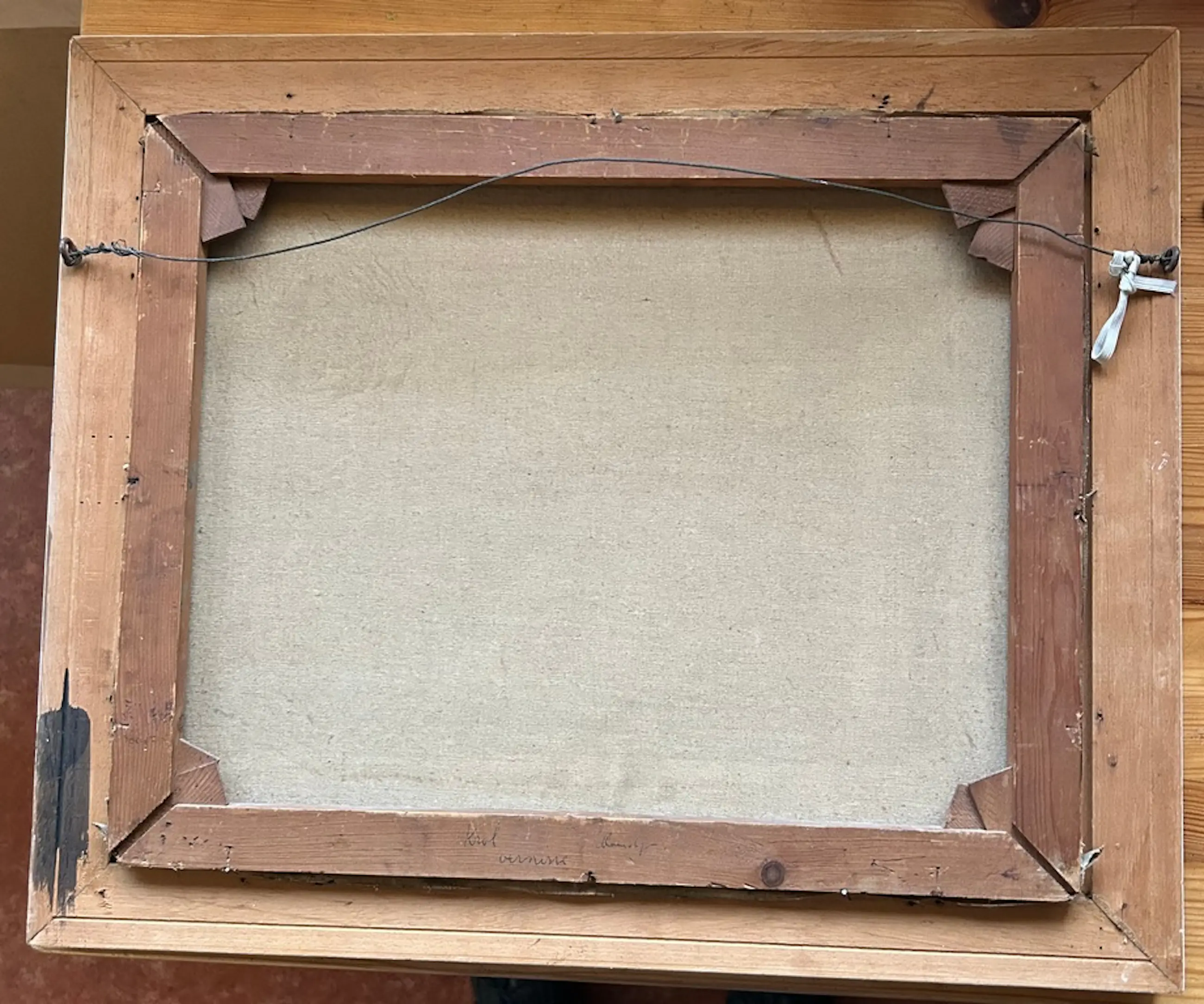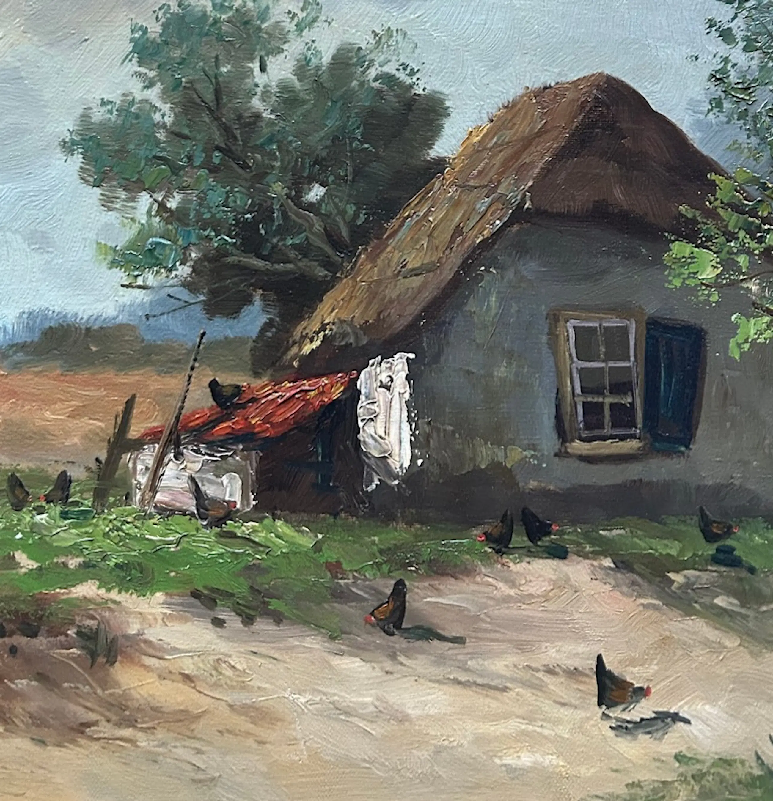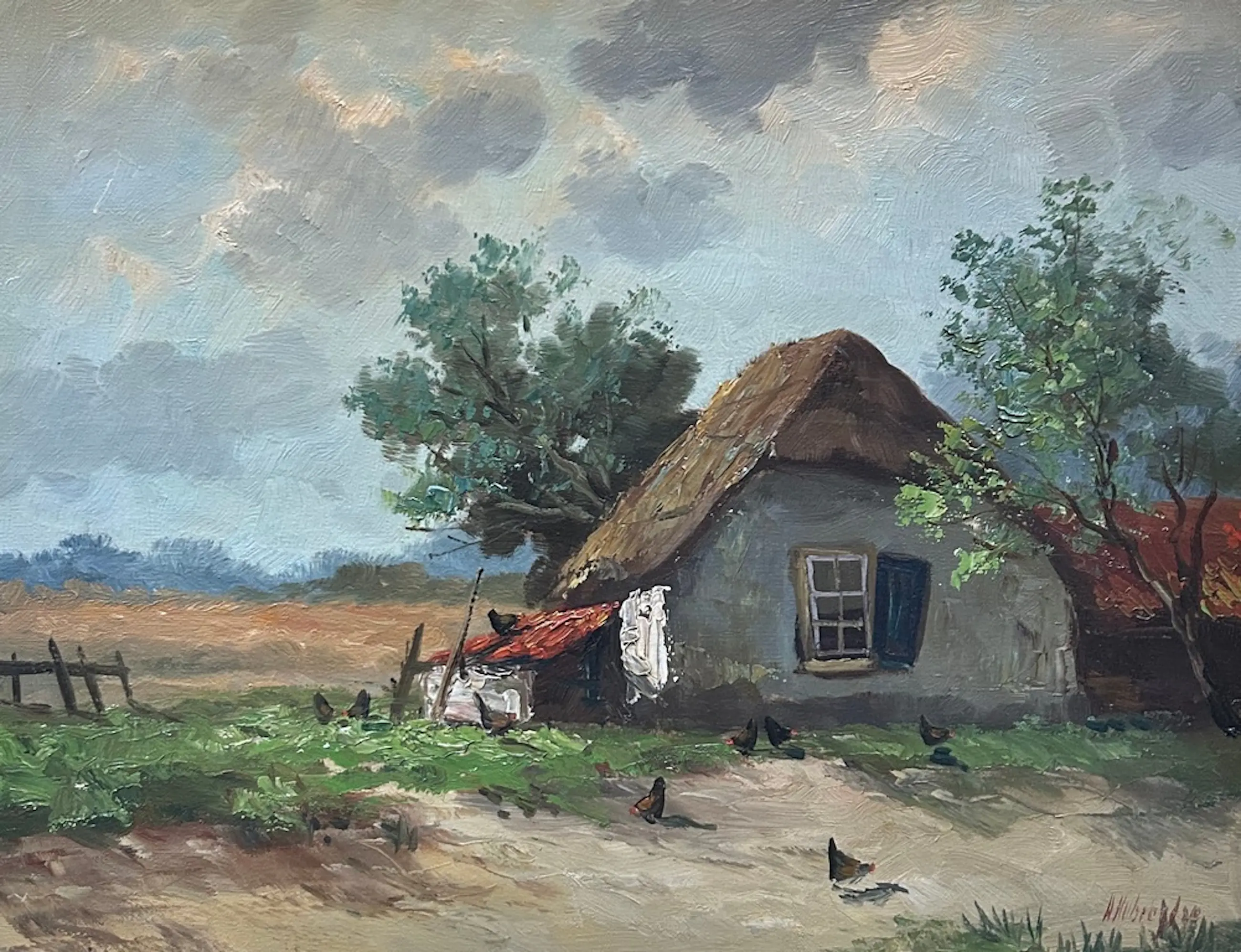 Sfeervol schilderij, olieverf op doek, rechtsonder gesigneerd. De lijst heeft wat gebruikssporen. Een onopvallend oppervlakkig krasje is nauwelijks zichtbaar.