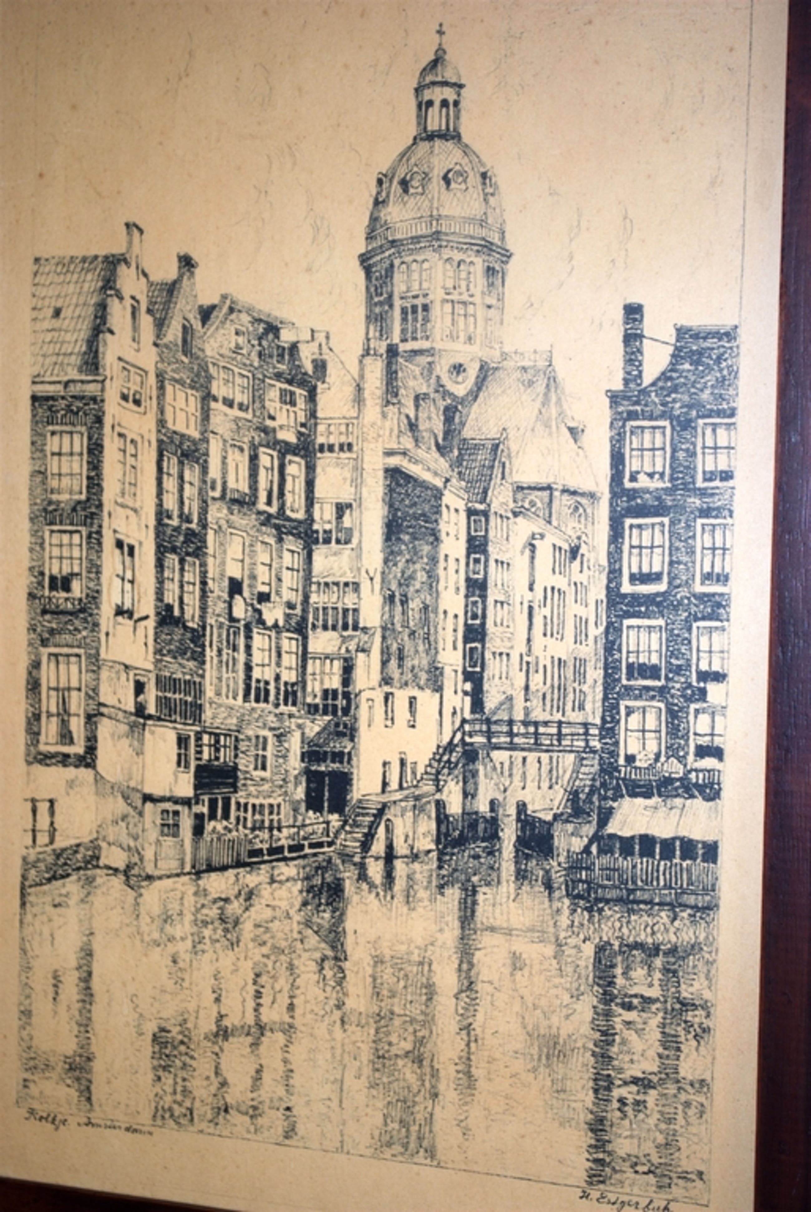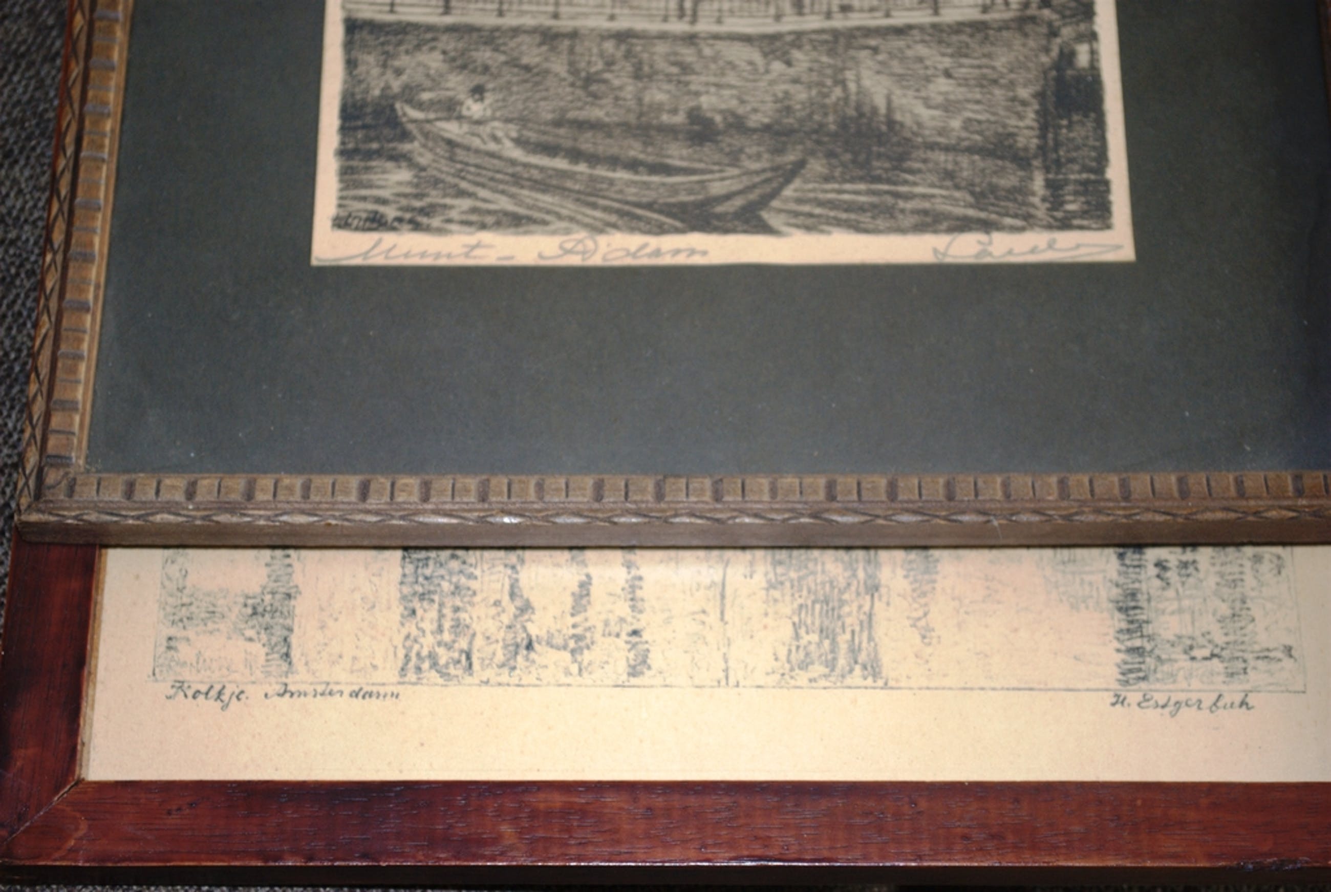 Kolkje: afbeelding 31x20 cm, in goede staat. Pseudoniem H.Estgerbuh (=Henriette Hubregtse). Achter glas in een lijst in redelijke staat, 37x25 cm. In de druk gesigneerd en beschreven.