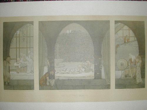 Dornröschen. 1914. Lichtdruck über Tonplatte, Triptychon.Auf festem Simili-Japan. Tonplatte insgesamt 38 mal 67,9 cm. Druckvermerk Hanfstaengl. Namen der Künstlerin in der rechten Tonplatte.Eines von nur 160 Ex. der englischen Ausgabe. Insgesamt etwas angestaubt und altersspurig, aber schön und rar. Fragen bitte vorab klären.Versand 10 Euro.Privatverkauf.