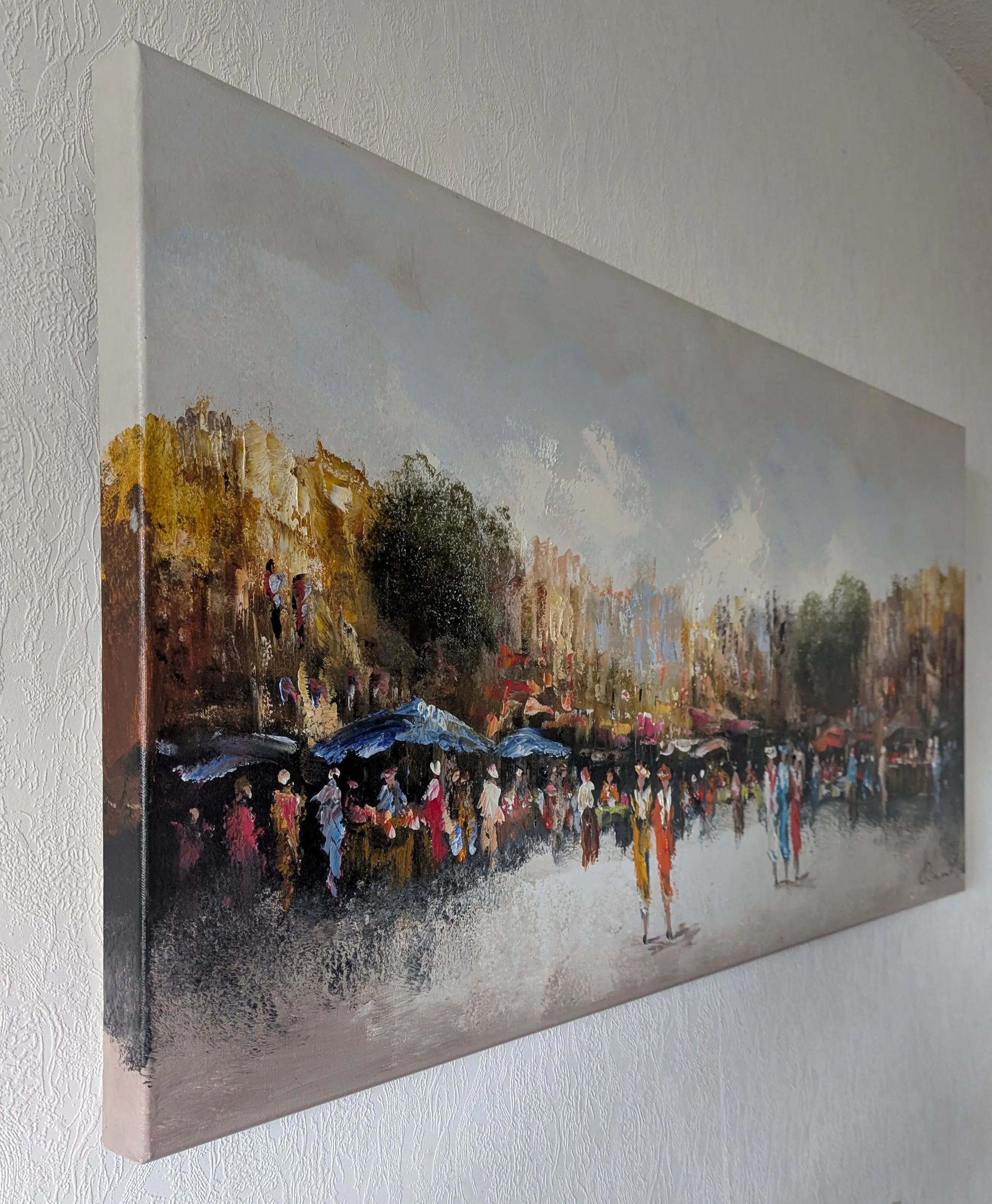 Dit schilderij van Henry Brand toont een impressionistische visie van een levendig en kleurrijk marktplein. Wat tevens de naam van het werk is. Het geheel is levendig geschilderd met kleurrijke figuren die samen in de stad flaneren.
