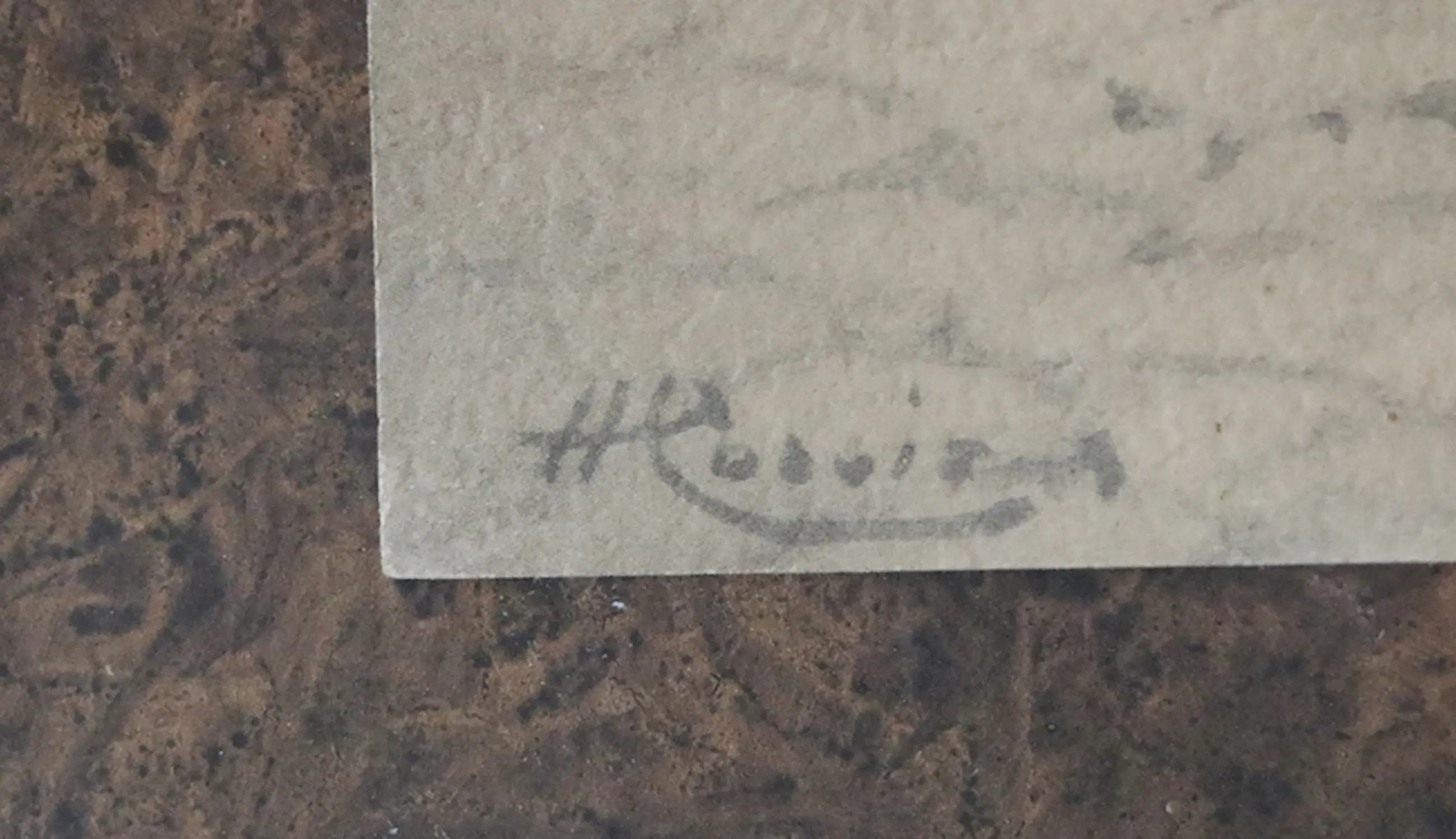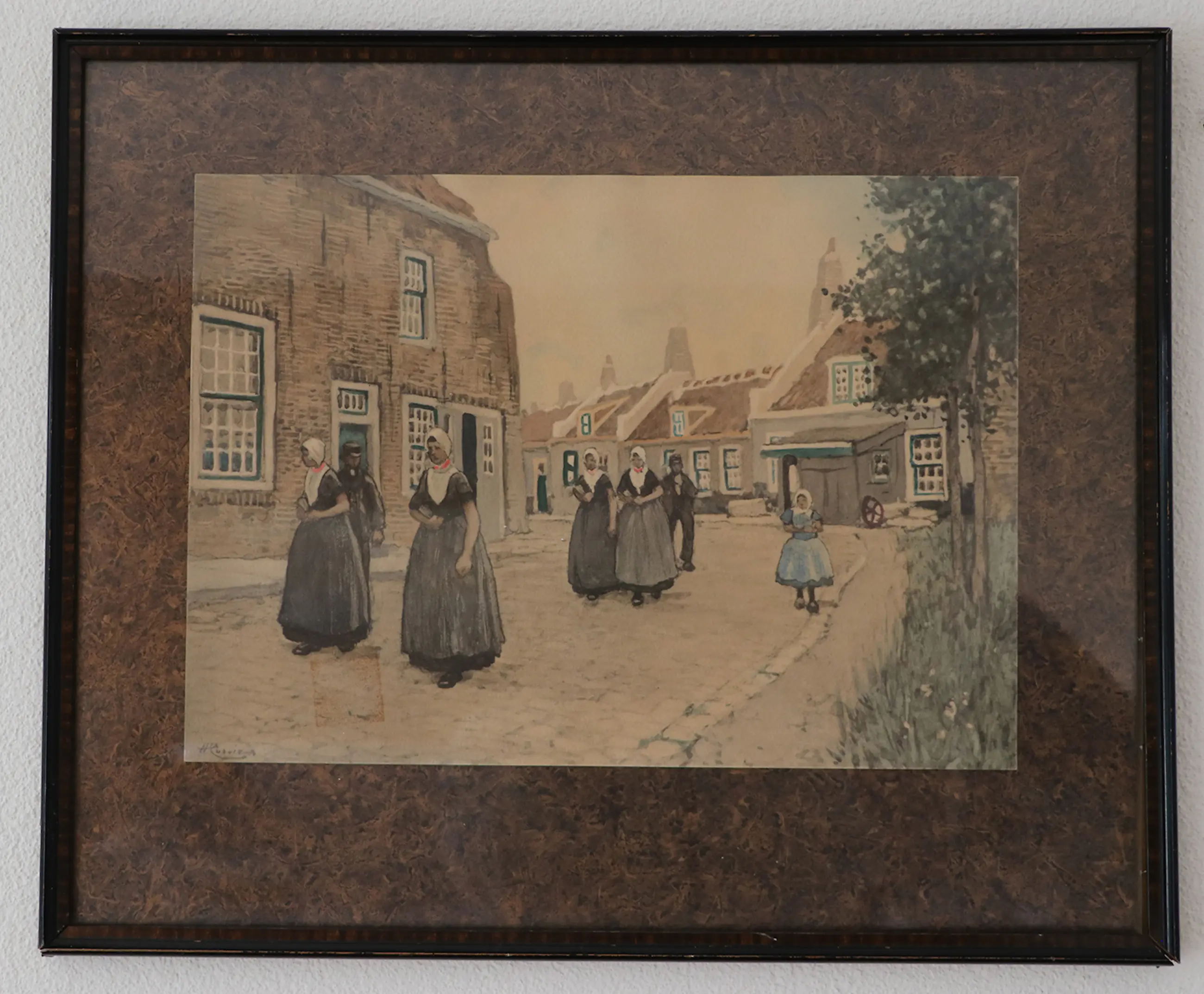 Conditie matig, heeft een vierkante vlek, doordruk (vocht?) o.i.d. onder de meest linkse vrouw in klederdracht