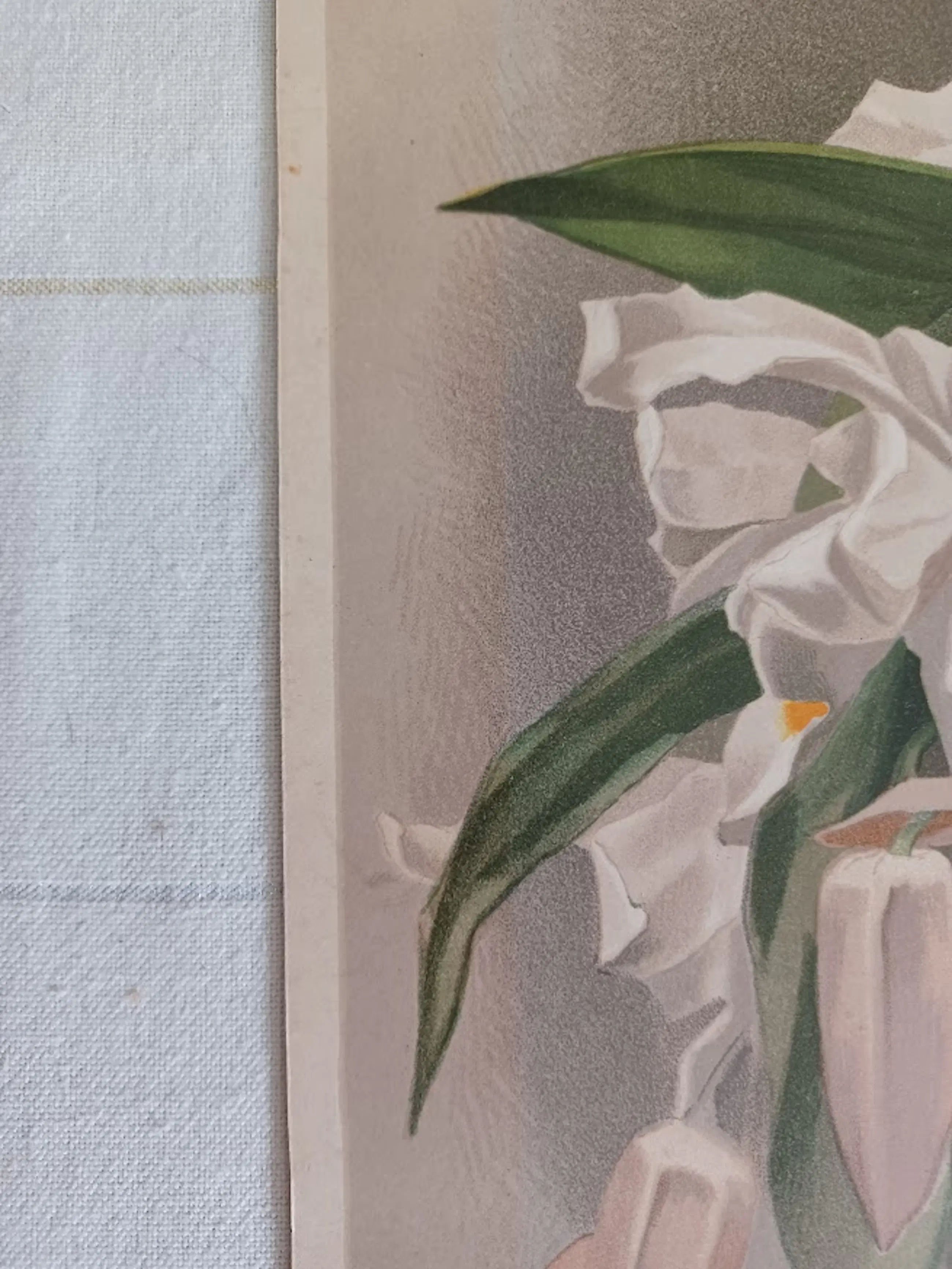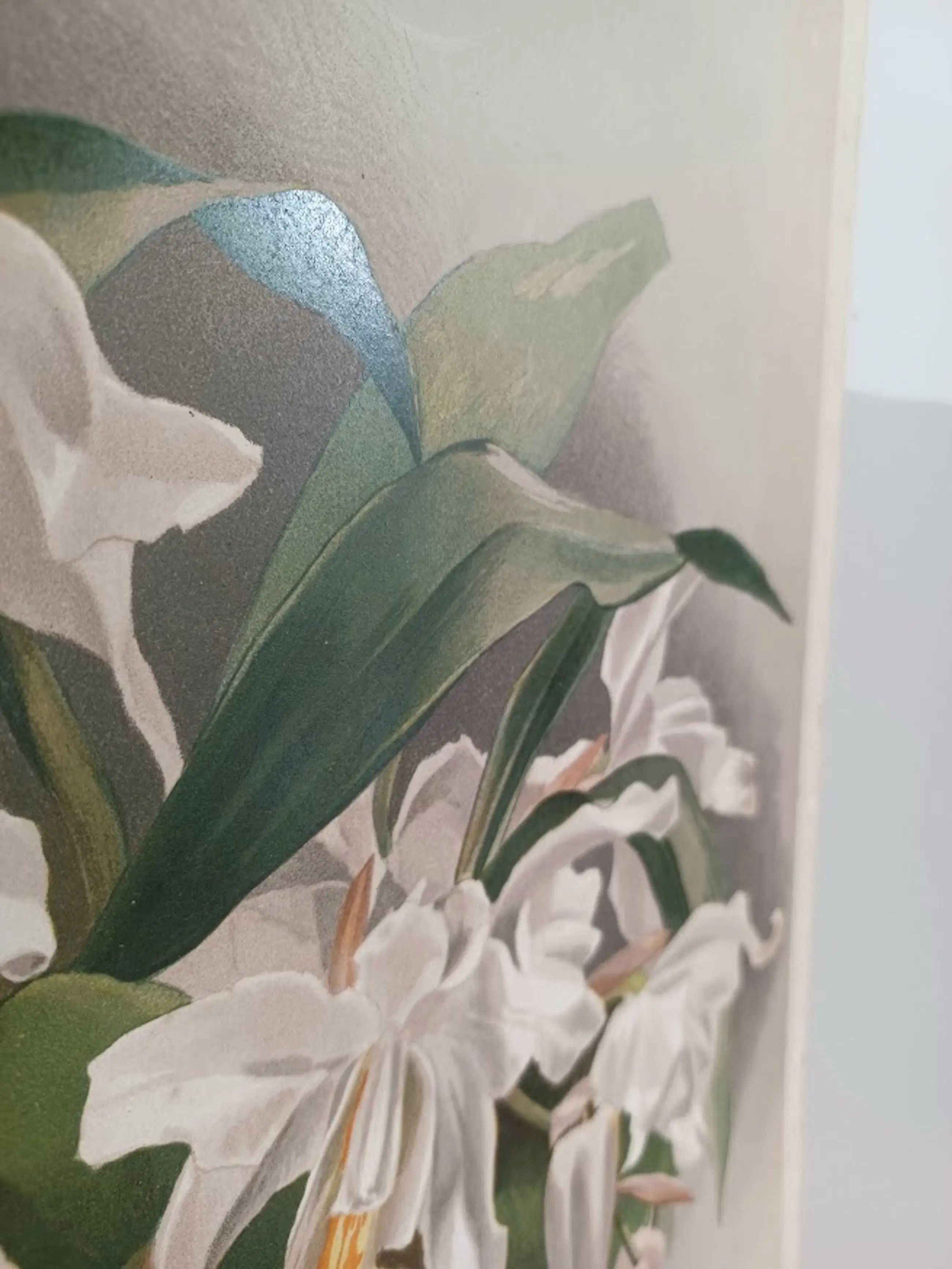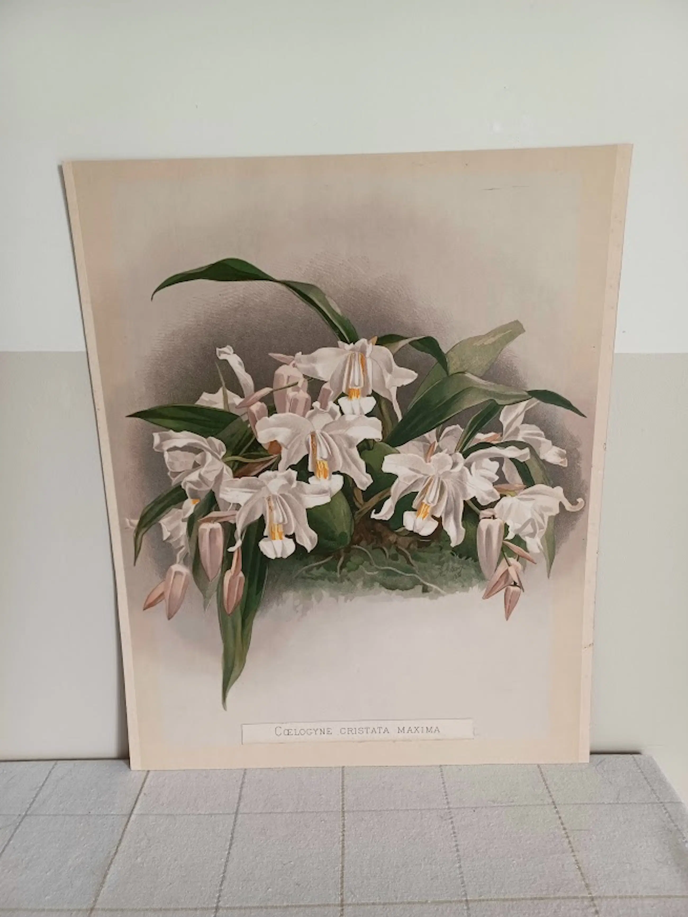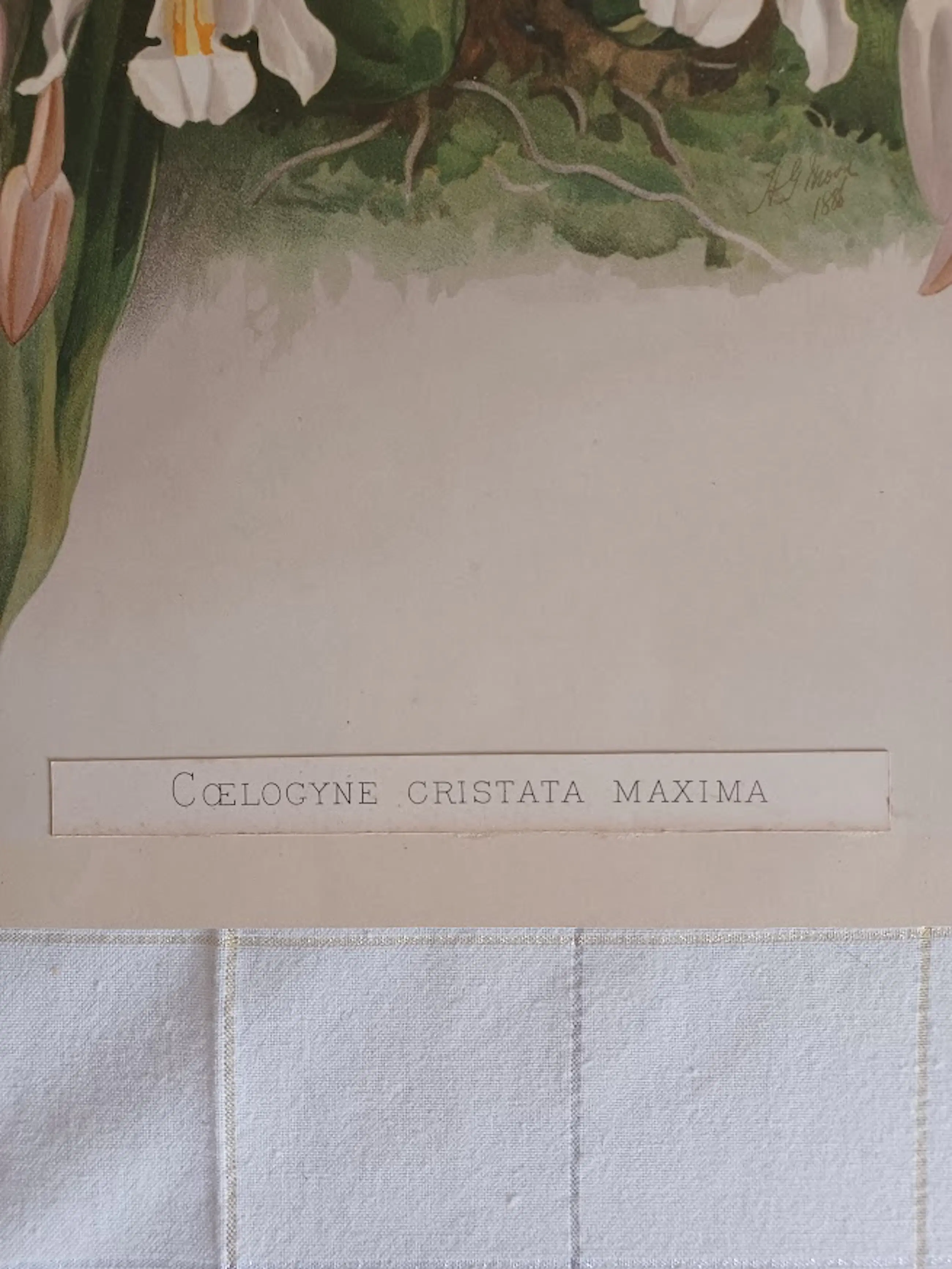 Ambachtelijke druktechniek: Geen moderne pixel- of rasterdruk, maar de authentieke 'dotted grain' (stippelstructuur) van de handmatige lithosteen. Gemonteerd tekststrookje: De naam van de orchidee is, zoals enkel bij de originele eerste editie, op een apart strookje gedrukt en met de hand op de plaat gemonteerd. De ambachtelijke tekstzetting (waaronder de 'œ' ligatuur in Cœlogyne) is duidelijk zichtbaar.