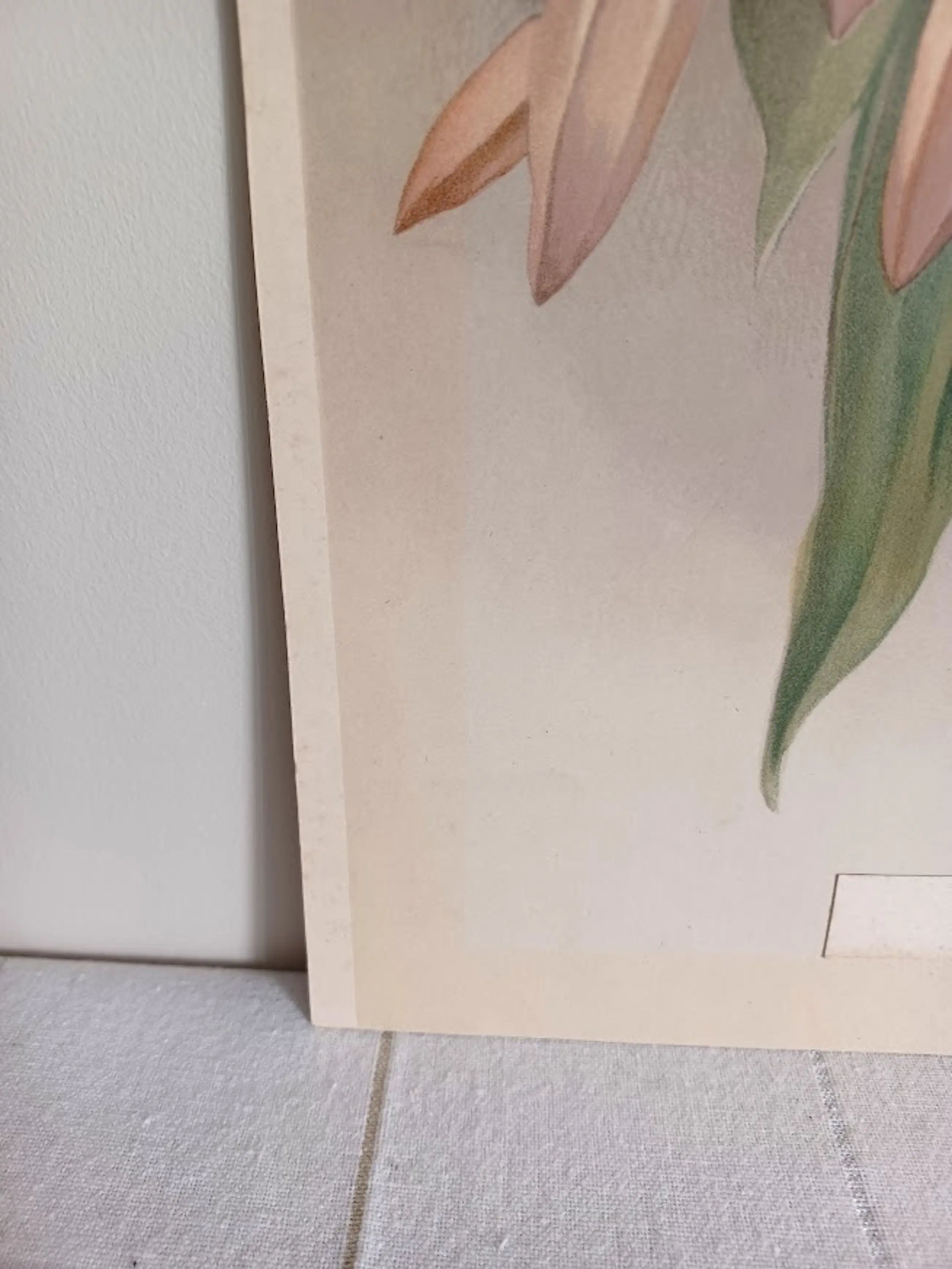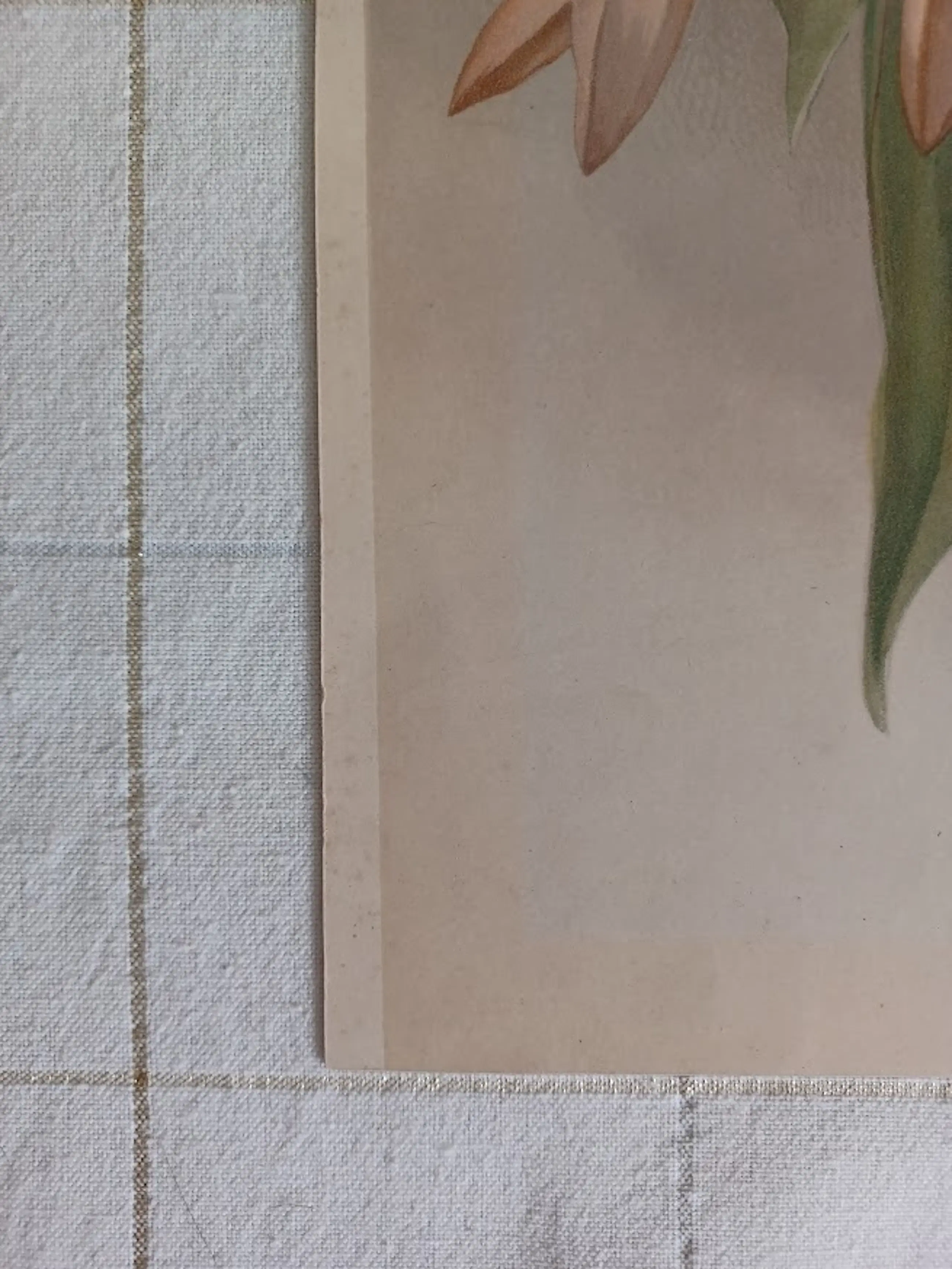 Waarom dit een gegarandeerd origineel exemplaar uit 1888 is: Tactiele gelaagdheid: De inkt ligt voelbaar op het dikke papier. Op de detailfoto's is de karakteristieke glans van de Arabische gom op de bladeren goed te zien, een procedé dat diepte geeft aan de kleuren.