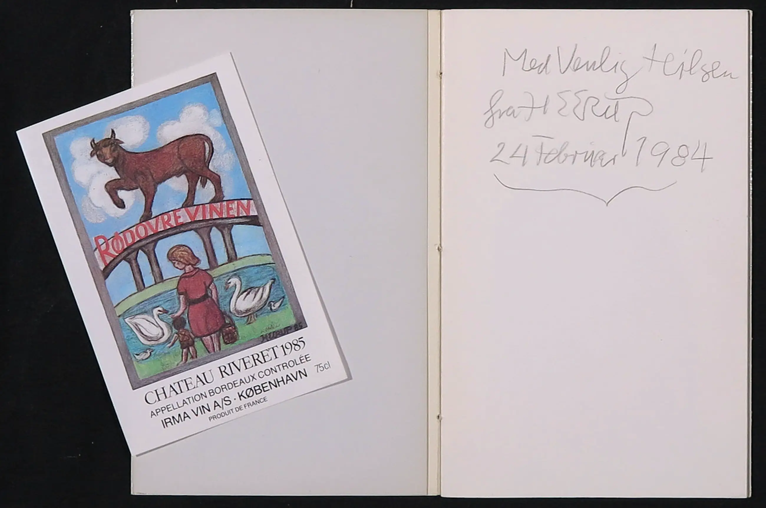 In dit boekje een wijn-etiket ontworpen door Heerup en een persoonlijke boodschap in potlood op de eerste pagina (daterende uit 1984).