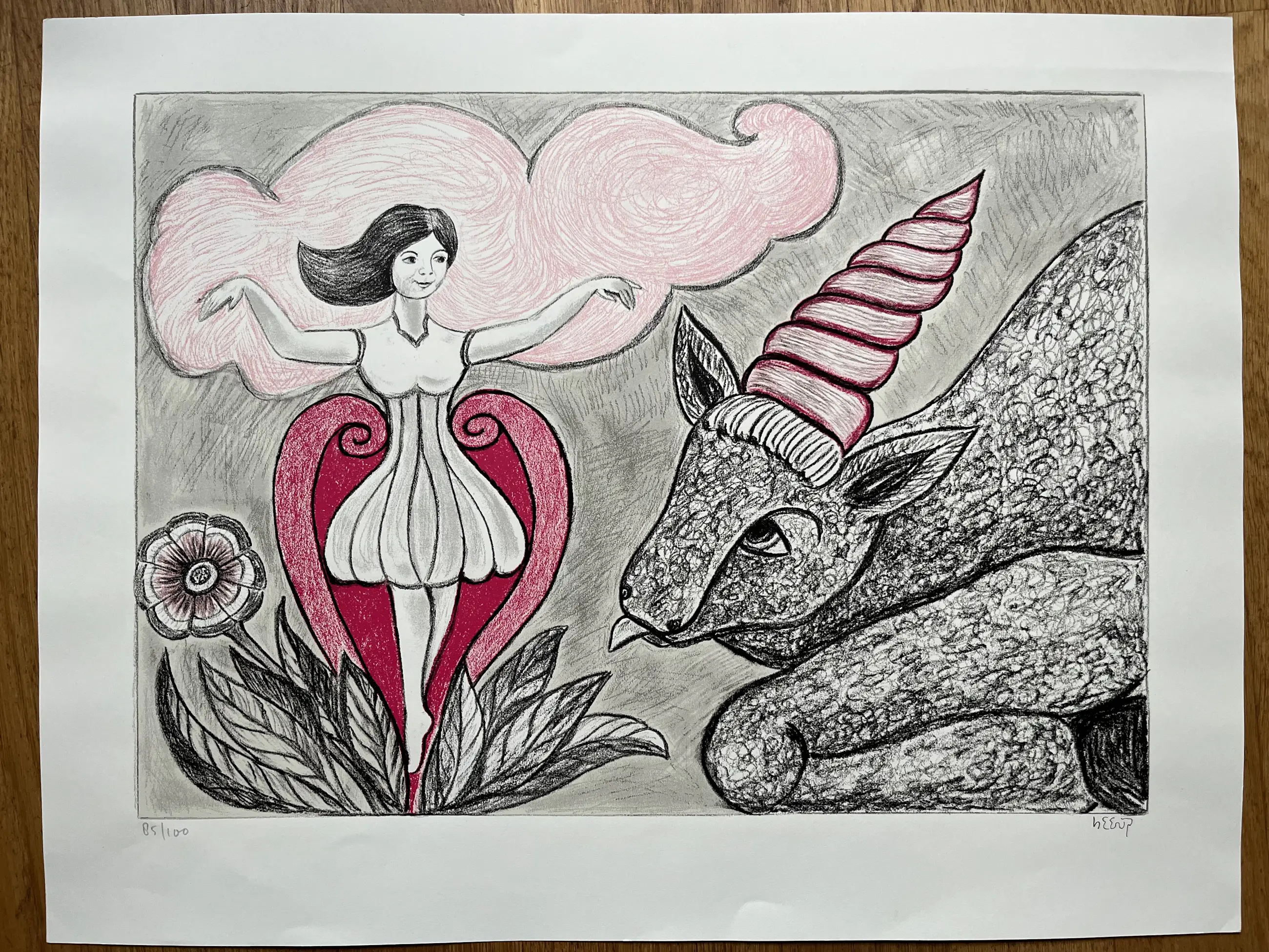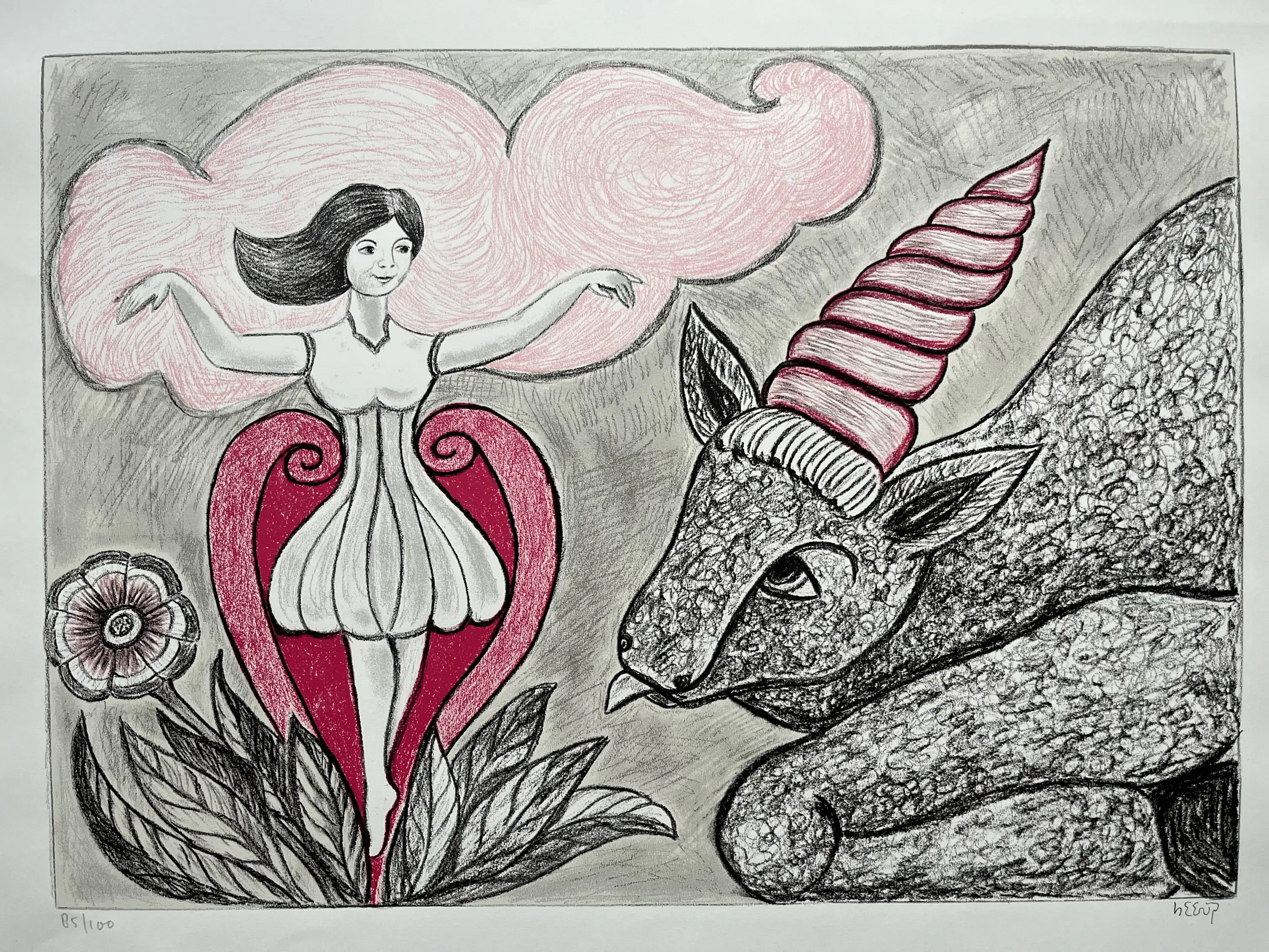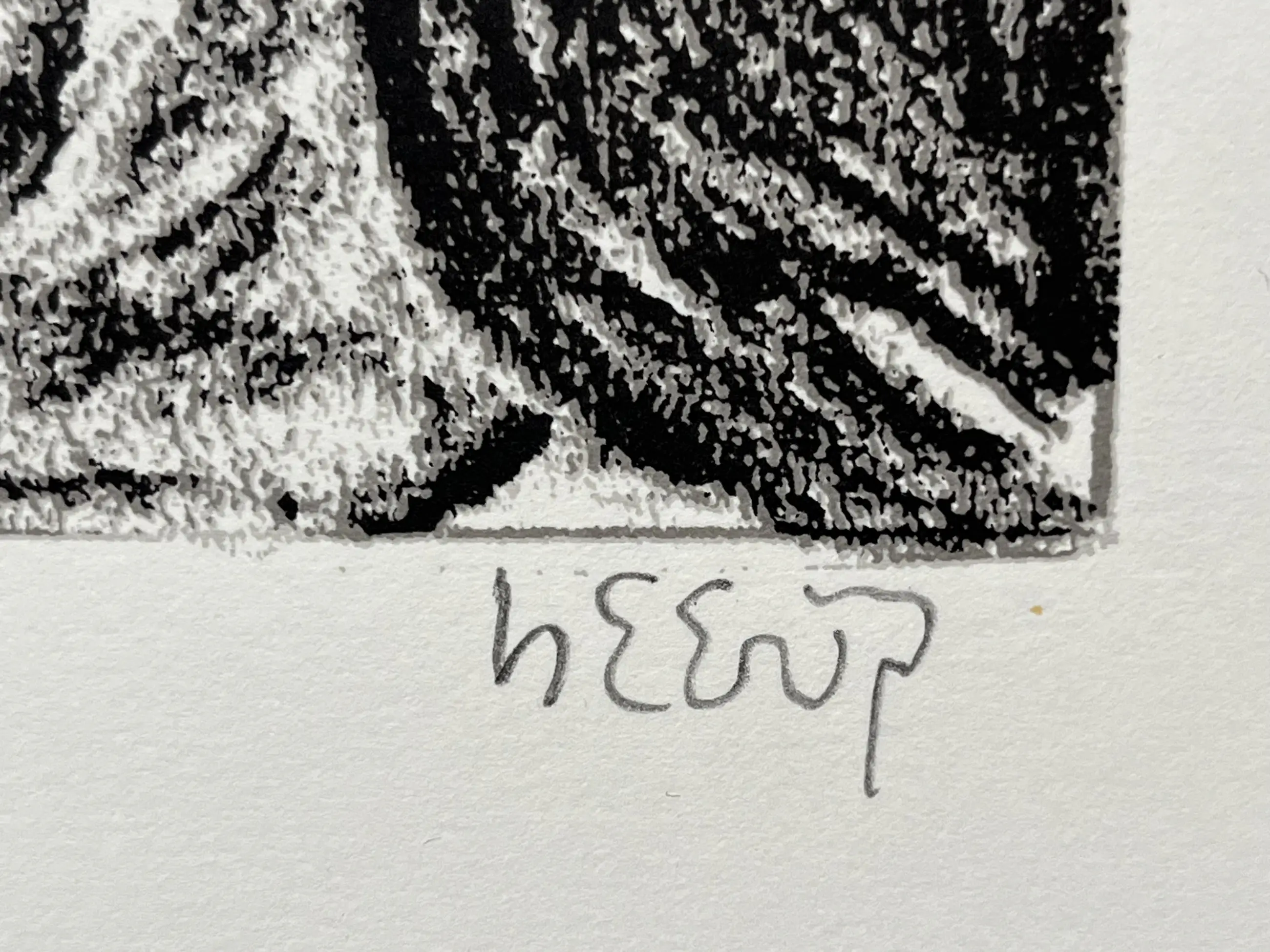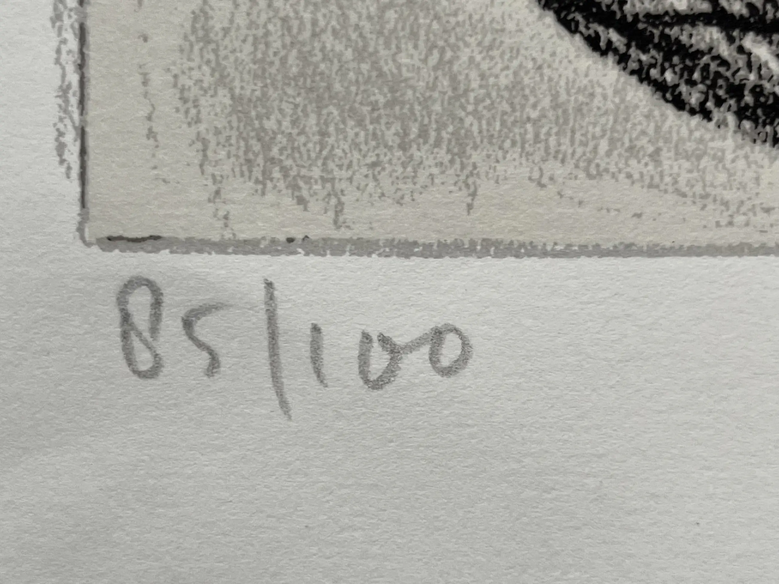 Litho uit 1986. Oplage 85/100 Boven de afbeelding zit een horizontaal vouwtje. Aan de randen (buiten afbeelding) zitten een paar lichte vouwtjes. (Zie detailfoto’s) Afmeting afbeelding 39 x 54,5 cm. Blad 50 x 65 cm.