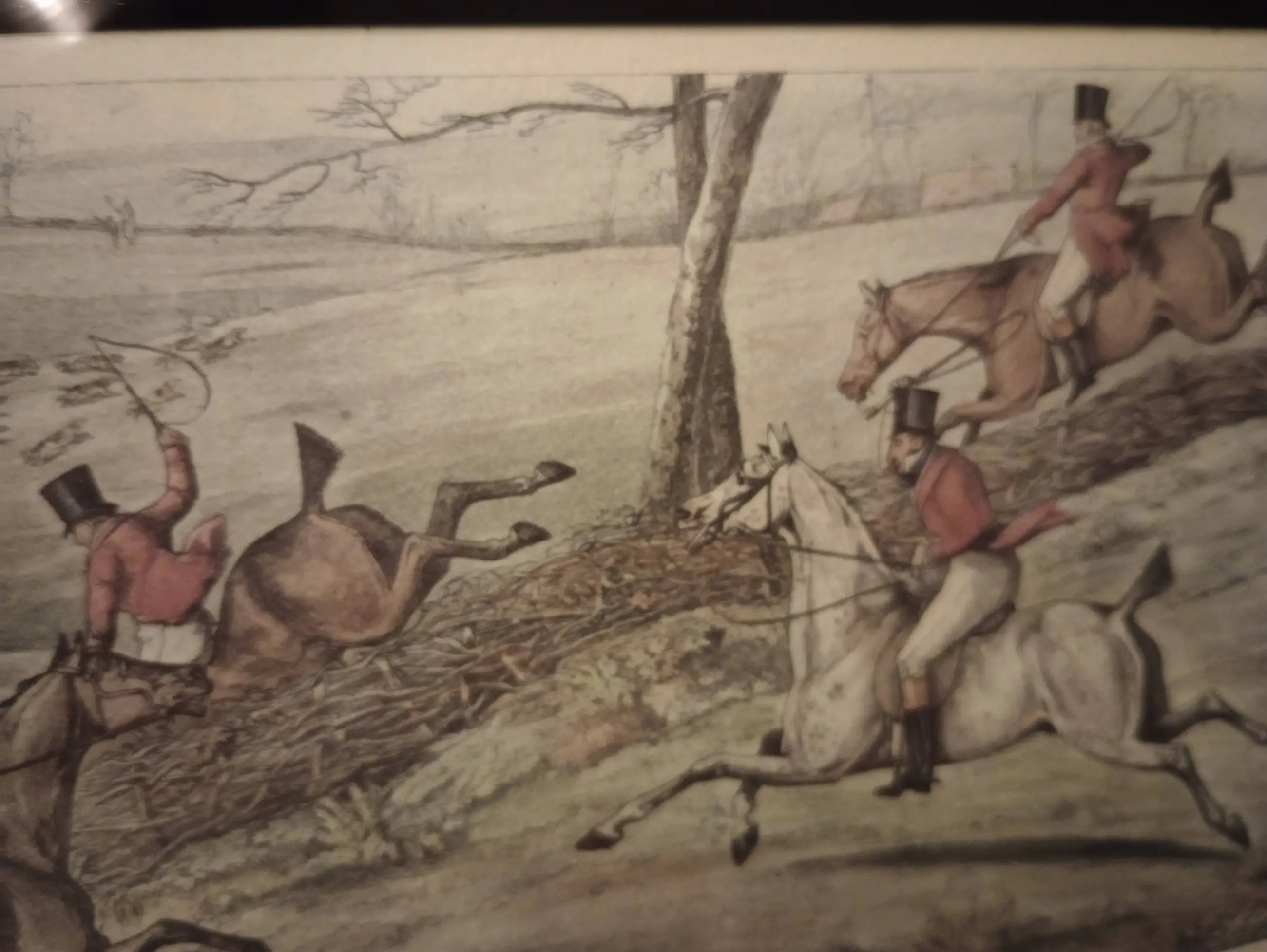 Deze ets met aquatint details is een vossenjacht gaande in het Britse platteland. Mooie details te zien. Rijder waarvan het paard vast zit in het water, springende paarden. Zeer veel details. Mooi werk.