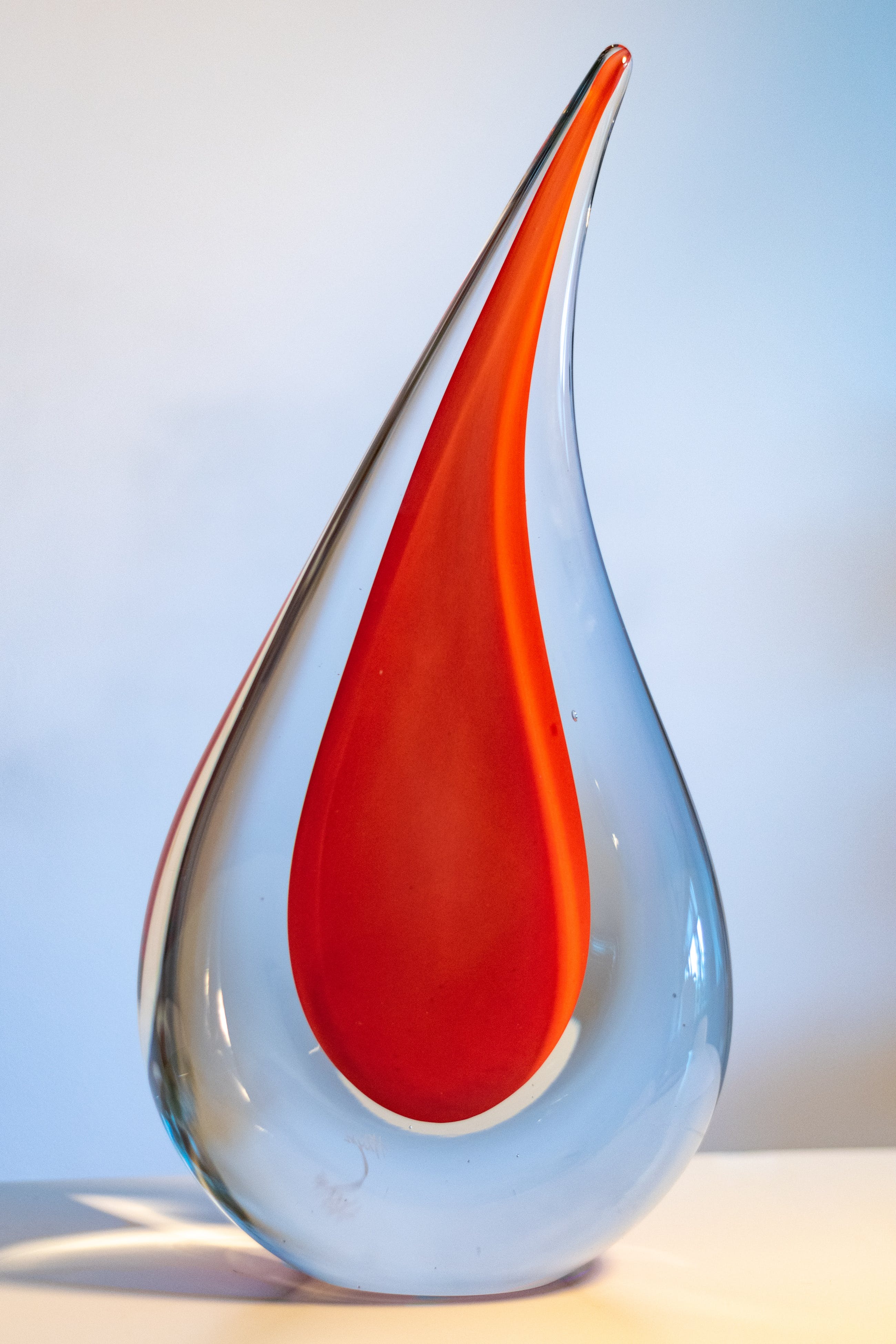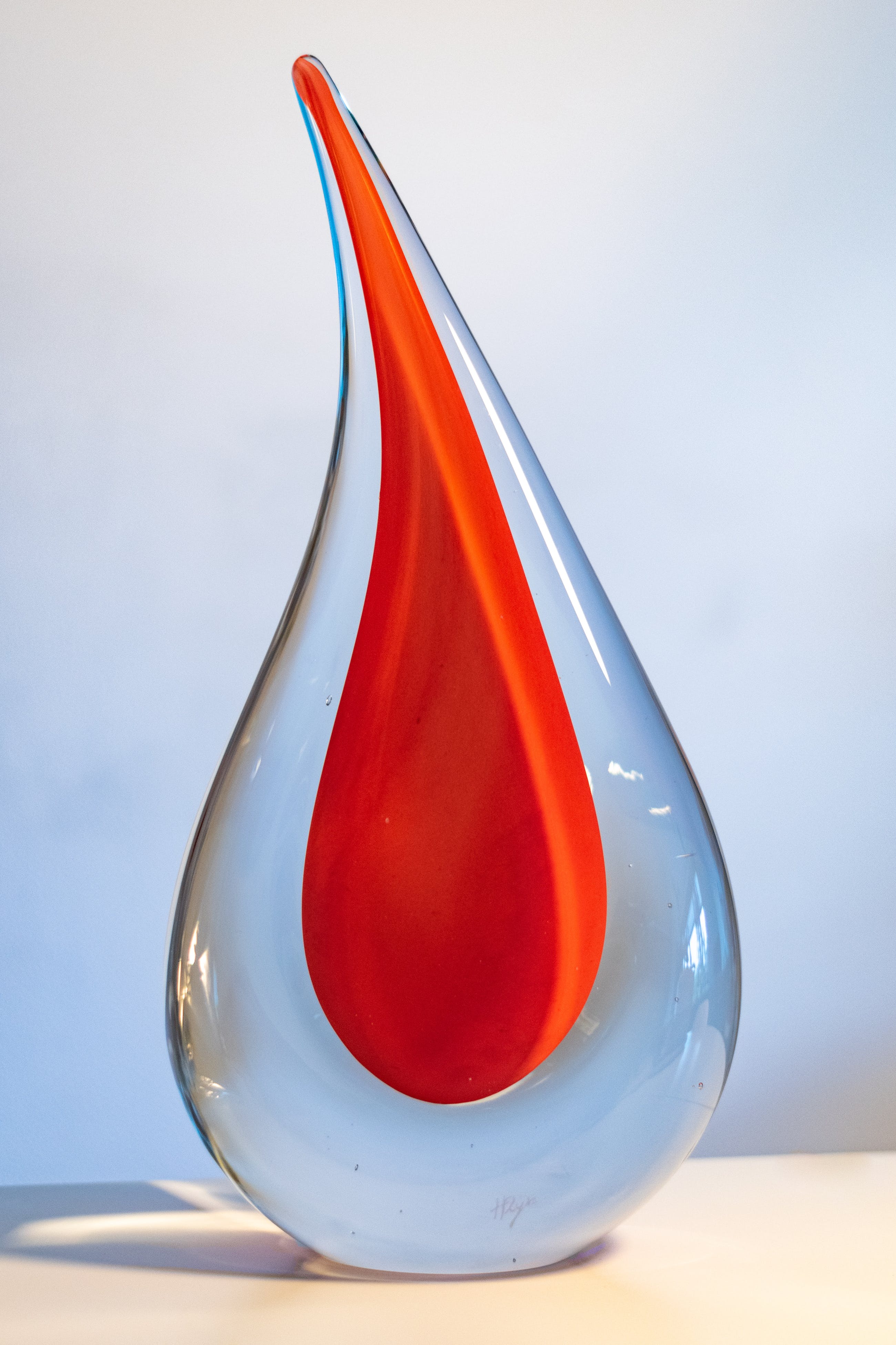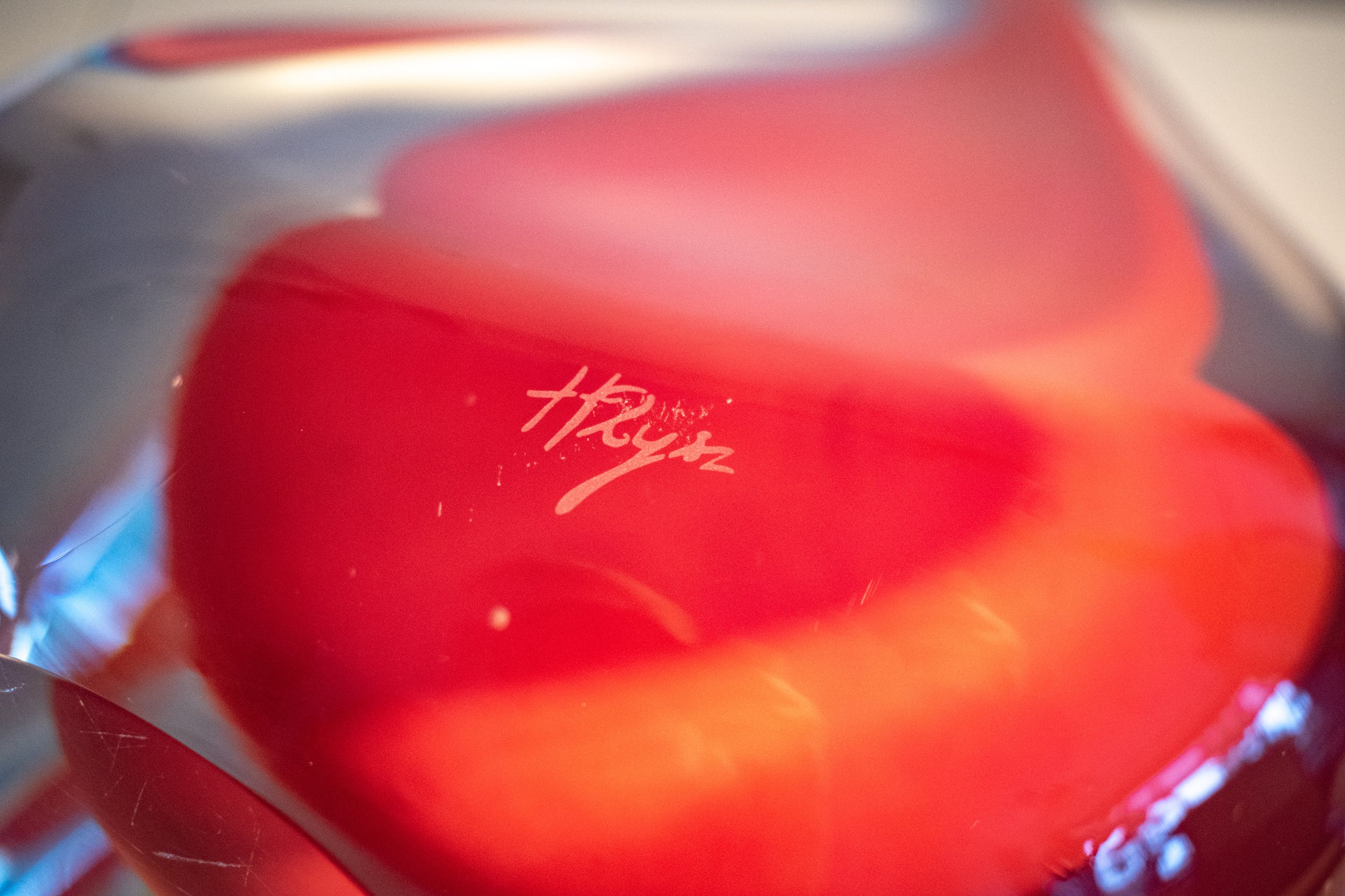 de druppel is gesigneerd met "hrysz"; dat is Henryk Rysz een bekend Boheems glaskunstenaar; heeft jarenlang bij ons in de huiskamer gestaan op een mooie lichte plek waar deze goed tot zijn recht kwam.