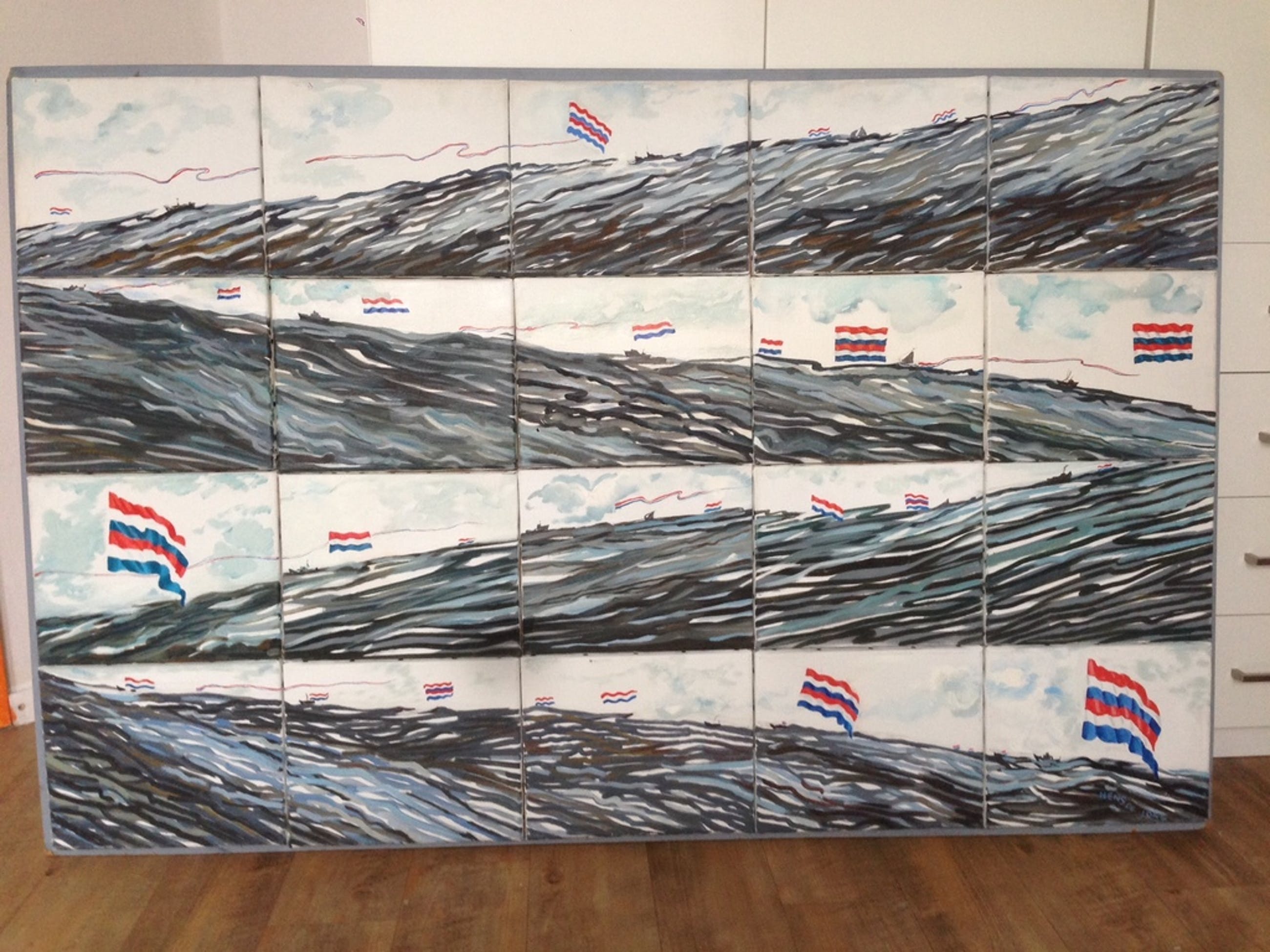 Uniek werk van Hens M. de Jong. Het werk bestaat uit 20 kleine doeken die samen een groot werk vormen.
