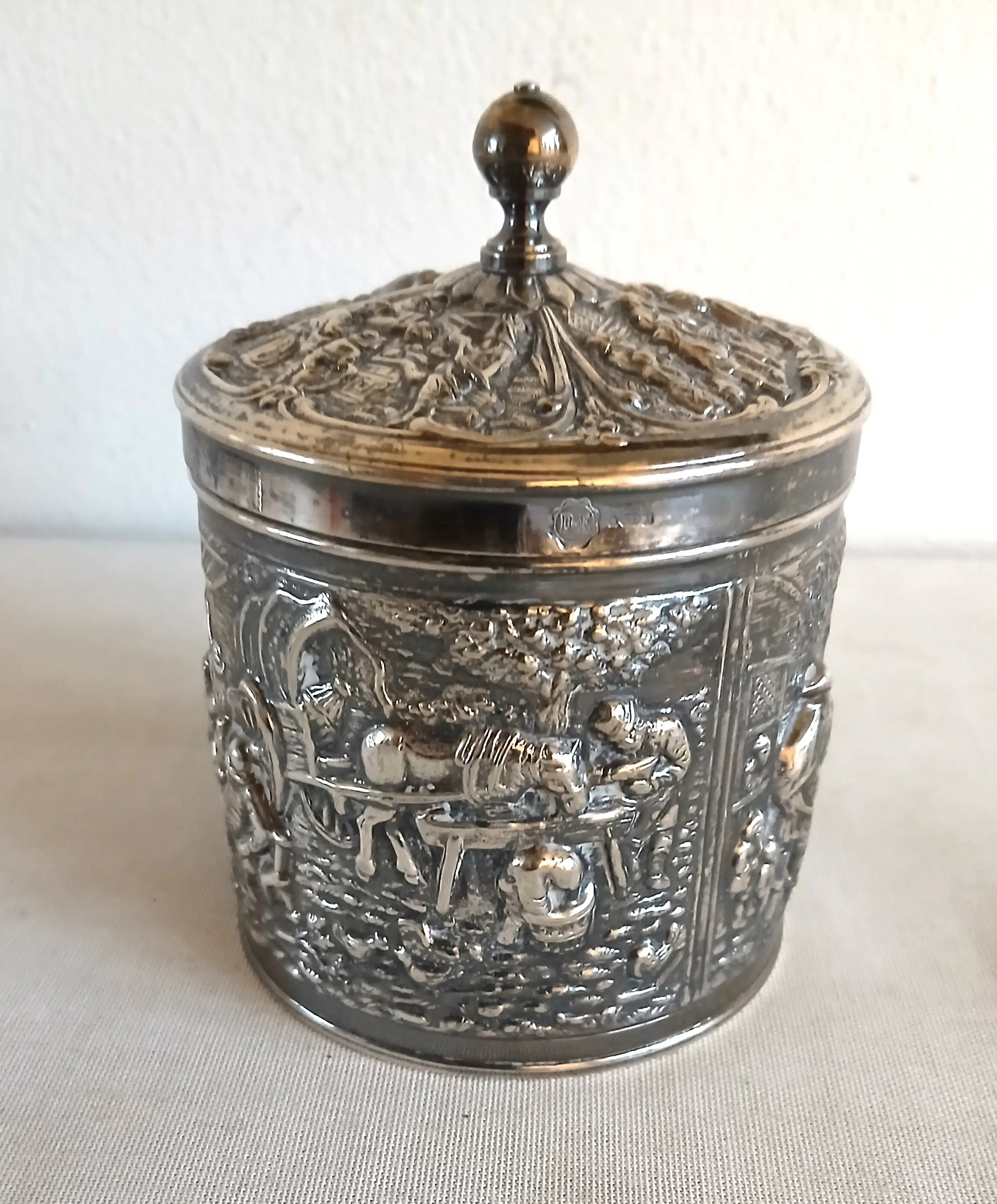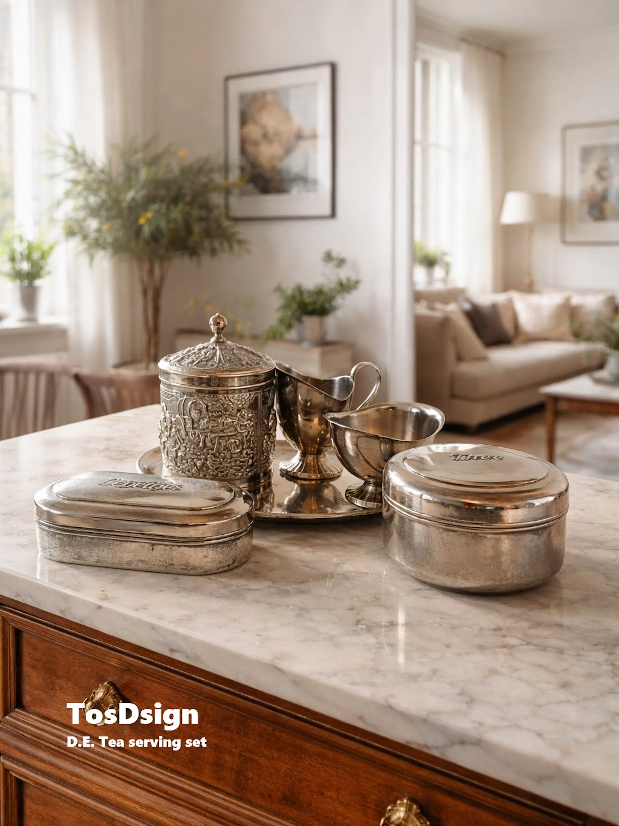 Vierdelig verzilverde D.E. Serveerset met extra lepel-, thee doosje en bakje. Zie de impressiefoto/voorbeeld van de serveerset in een passende wooninrichting (*wordt gratis aangeboden en meegezonden door TosDsign). D.E. Serveerset is gemerkt en authentiek. Ontwerper: Herbert Hooijkaas Gemerkt: HH Zilvergradatie: 90 Prachtige verzilverde Douwe Egberts (DE) serveerset ontworpen door de bekende Nederlandse ontwerper Herbert Hooijkaas. Deze objecten dateren uit de jaren 1950–1960 en werden destijds uitgegeven als luxe verzamelobjecten door Douwe Egberts.