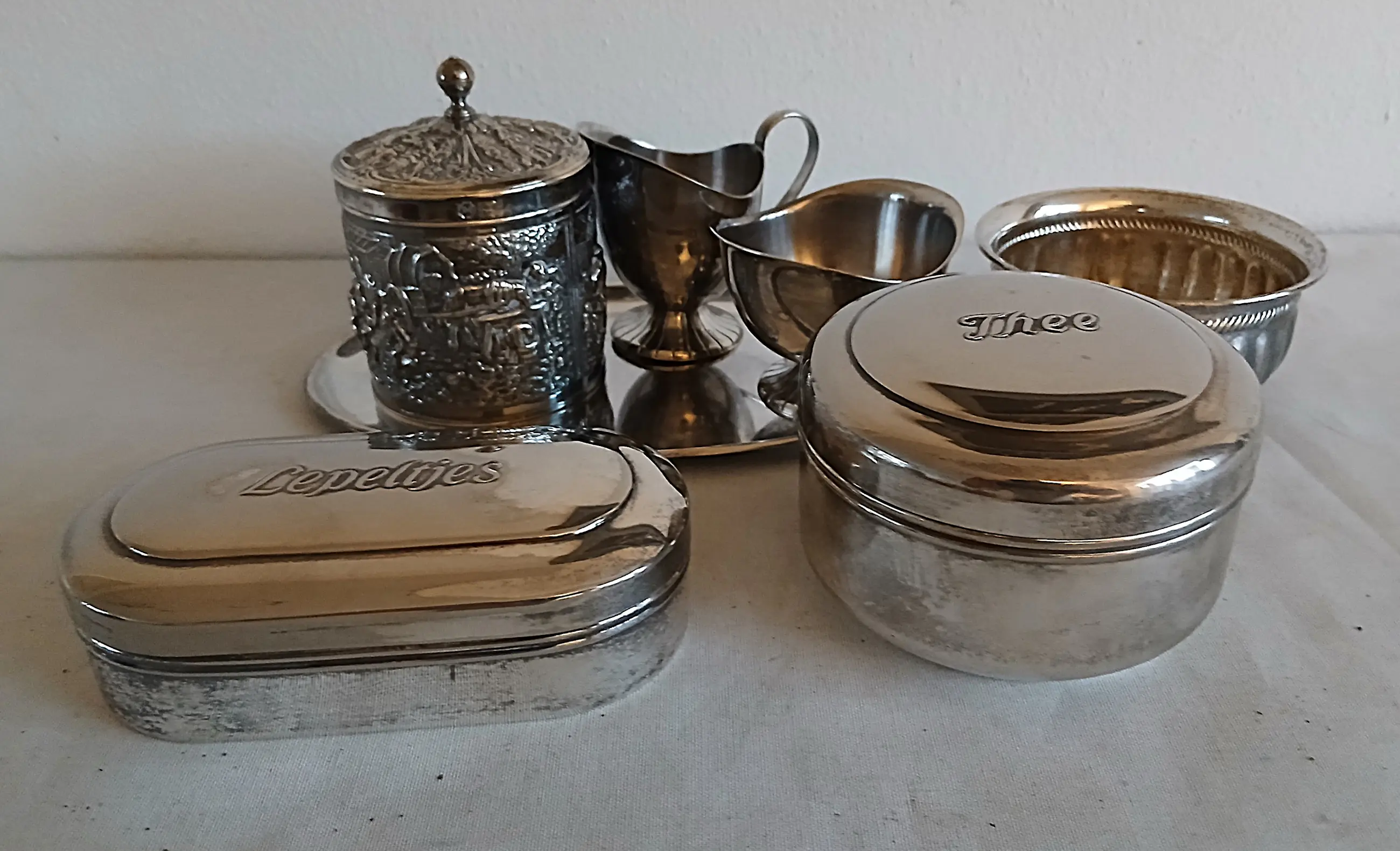 Overige toebehoren Lepelbakje 1: Hoogte ± 5 cm / Lang ± 14–20 cm / Breed ± 7,5 Theebakje 2: Hoogte ± 7 cm / Diameter± 10,5 cm Bakje 3: Hoogte ± 5,5 cm / Diameter± 10 cm De toebehoren is nog in prima bruikbare staat (gebruiksporen door de tijd en los scharniertje lepeldoosje)