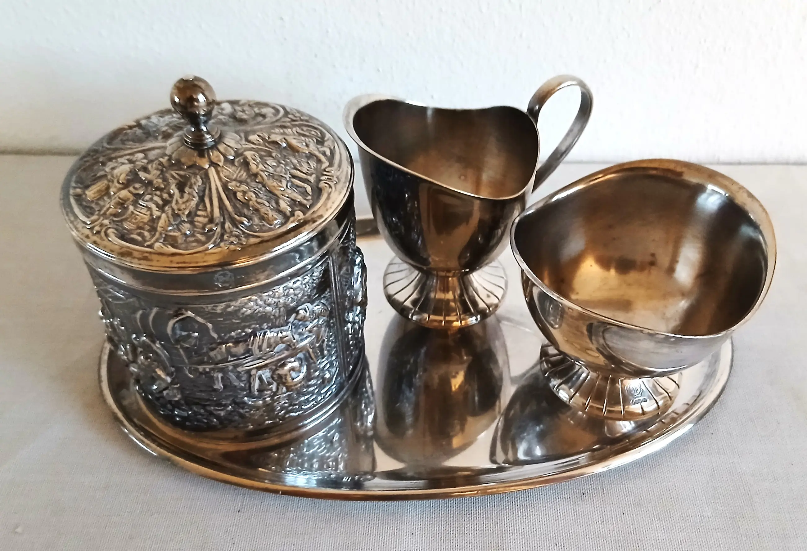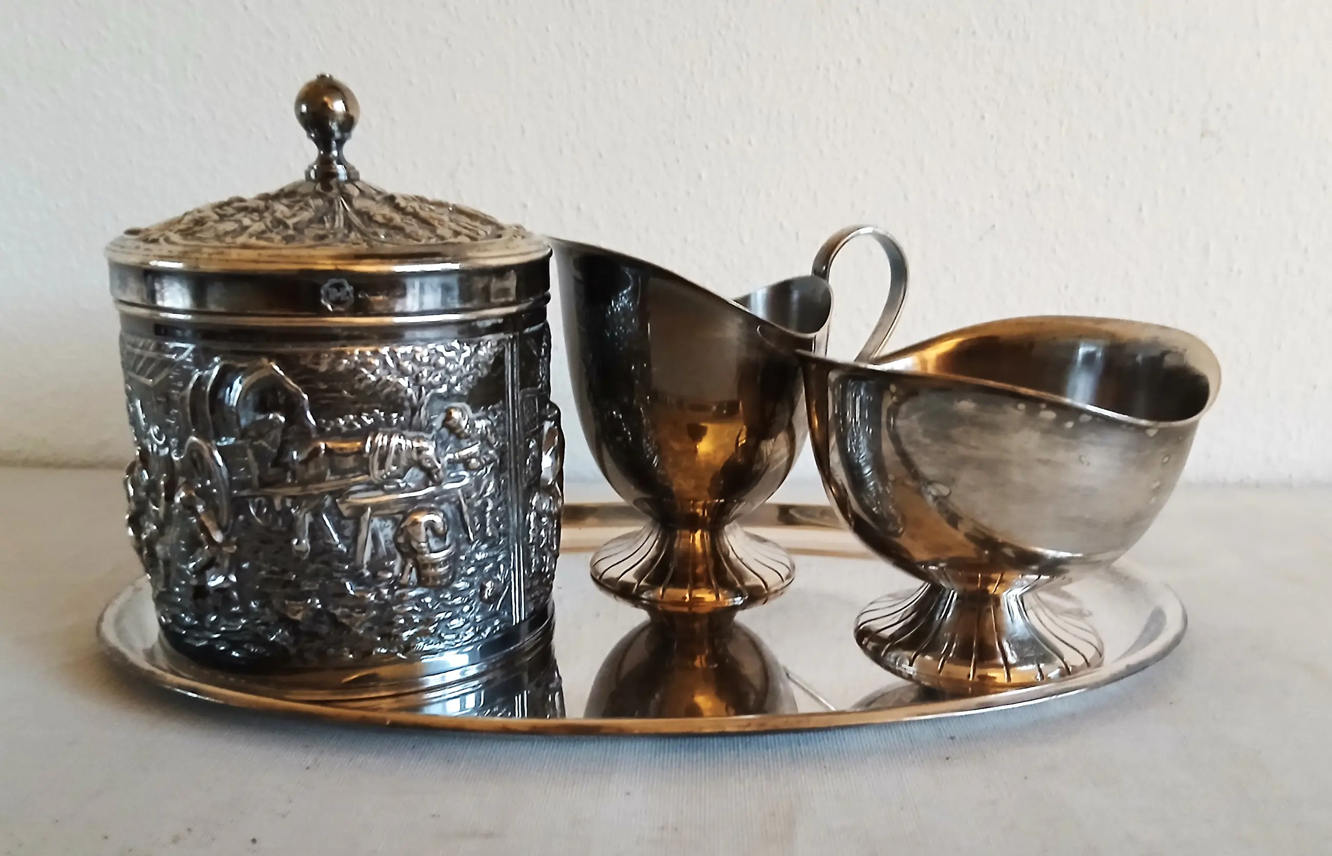 De D.E. serveerset is nog in prima bruikbare staat (gebruiksporen door de tijd, maar geen deuken).
