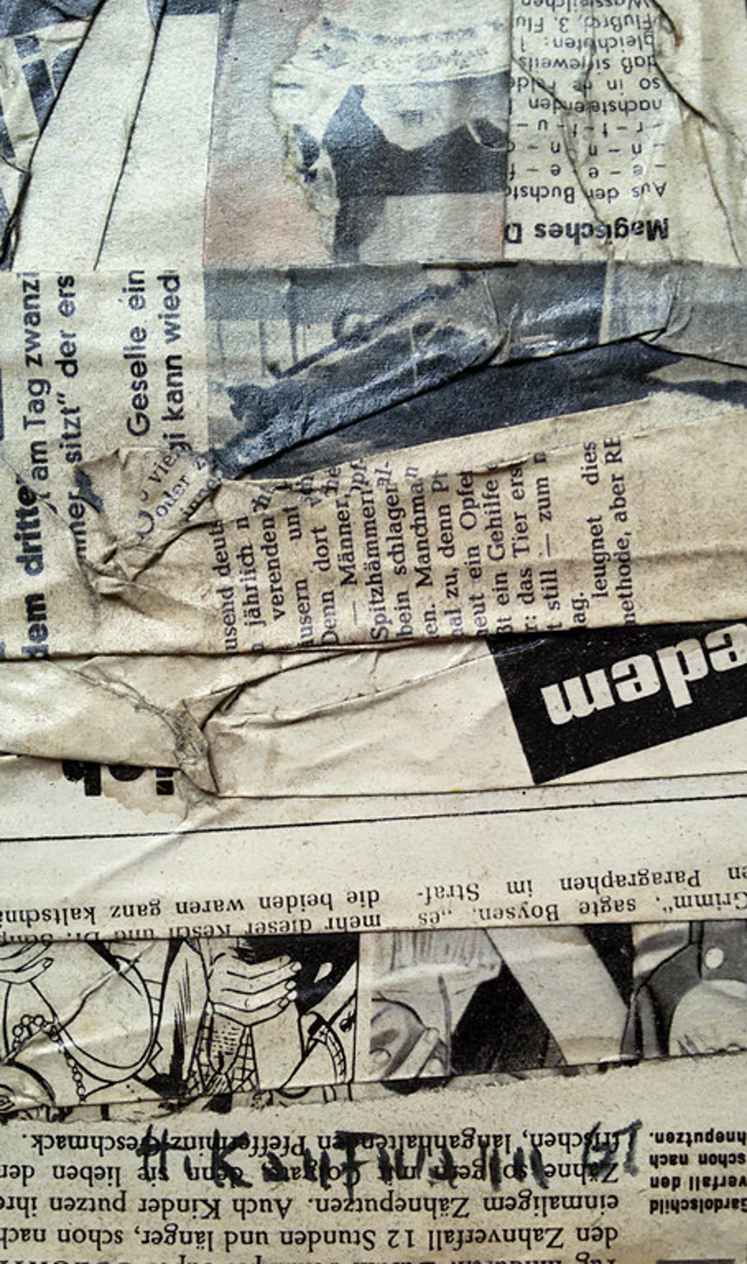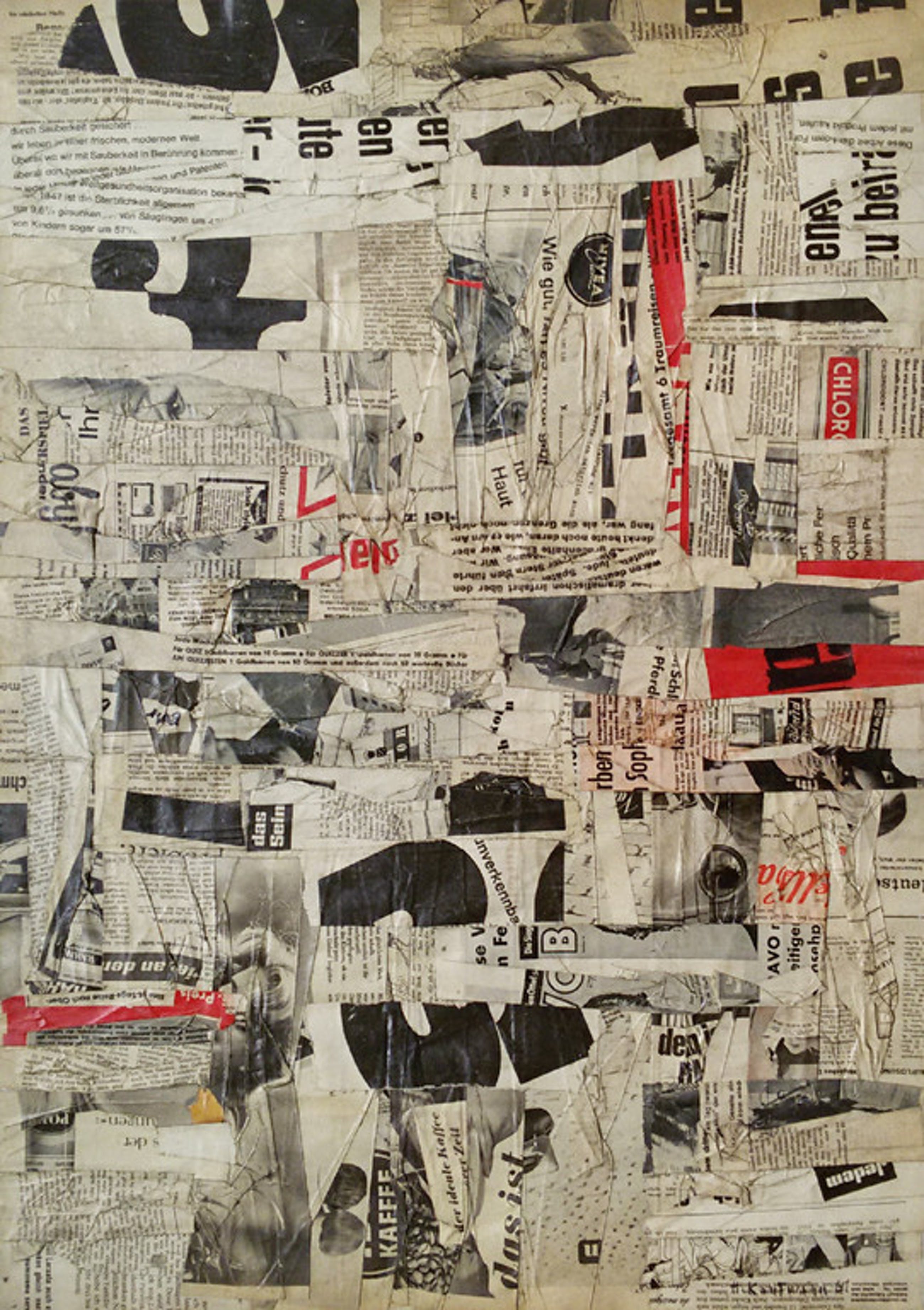 Apart, karakteristiek werk van de Duitse kunstenaar Herbert Kaufmann. Gelakte collage van krantenknipsels op papier, met zwart potlood gesigneerd en gedateerd (‘61), in verso met potlood getiteld. In zeer goede conditie.