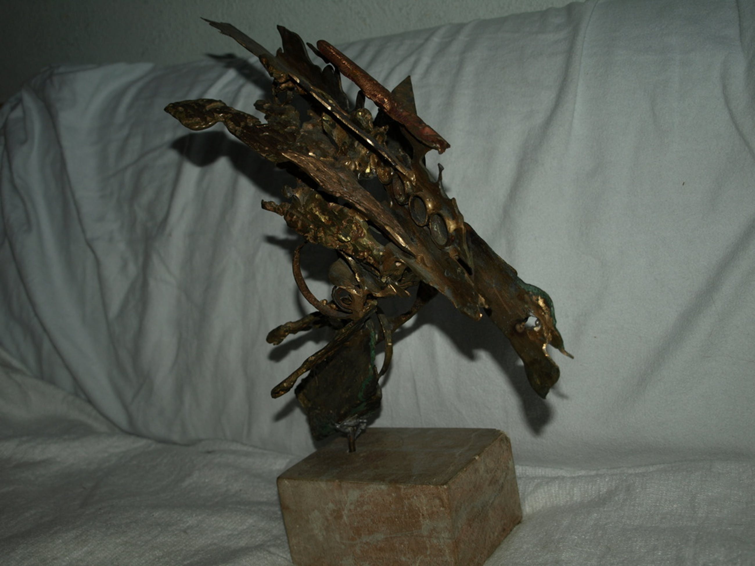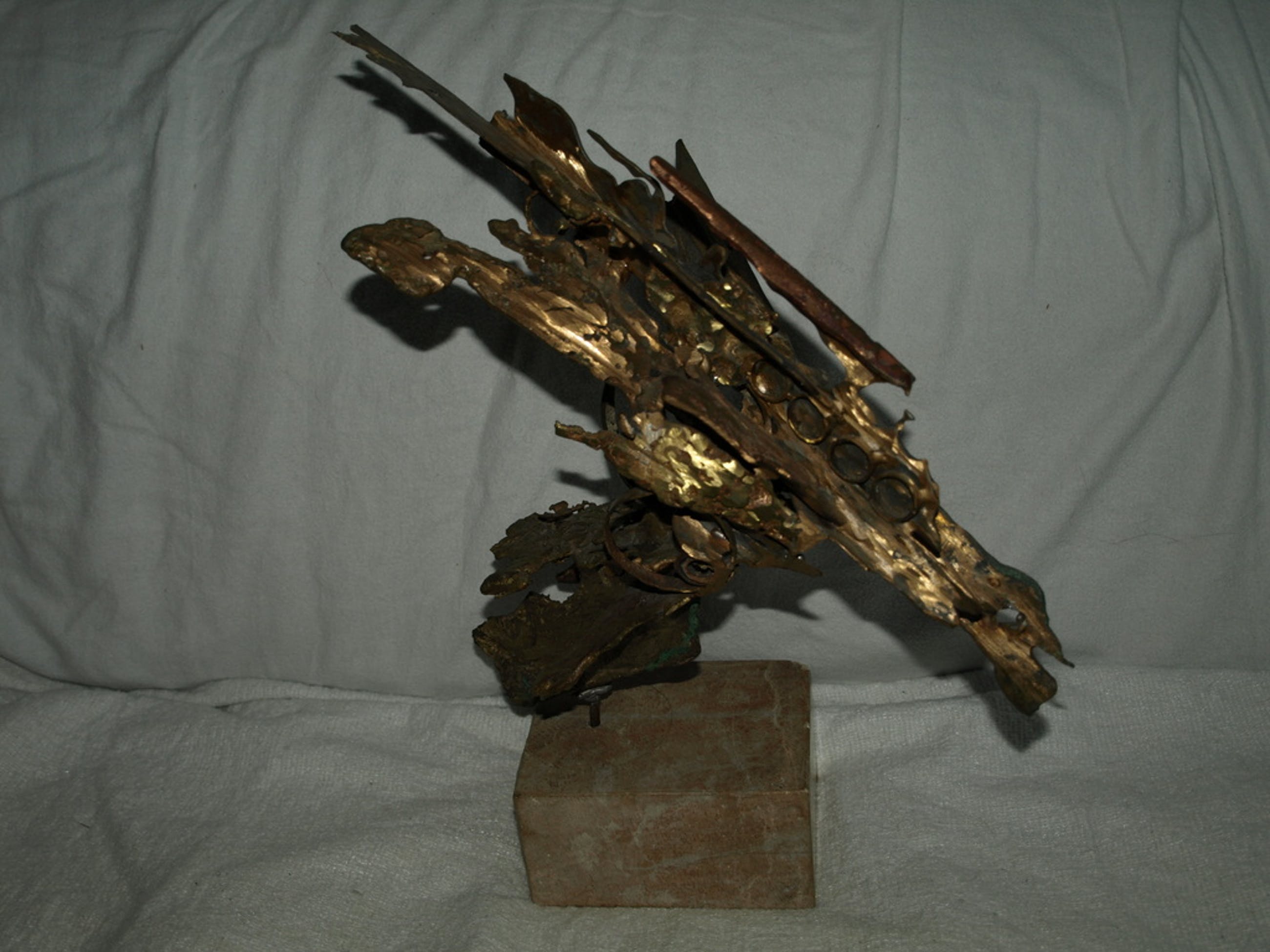 Het unieke abstracte werk is gemaakt van brons en ‘vergulde’ metalen en bevestigd op een stenen sokkel.