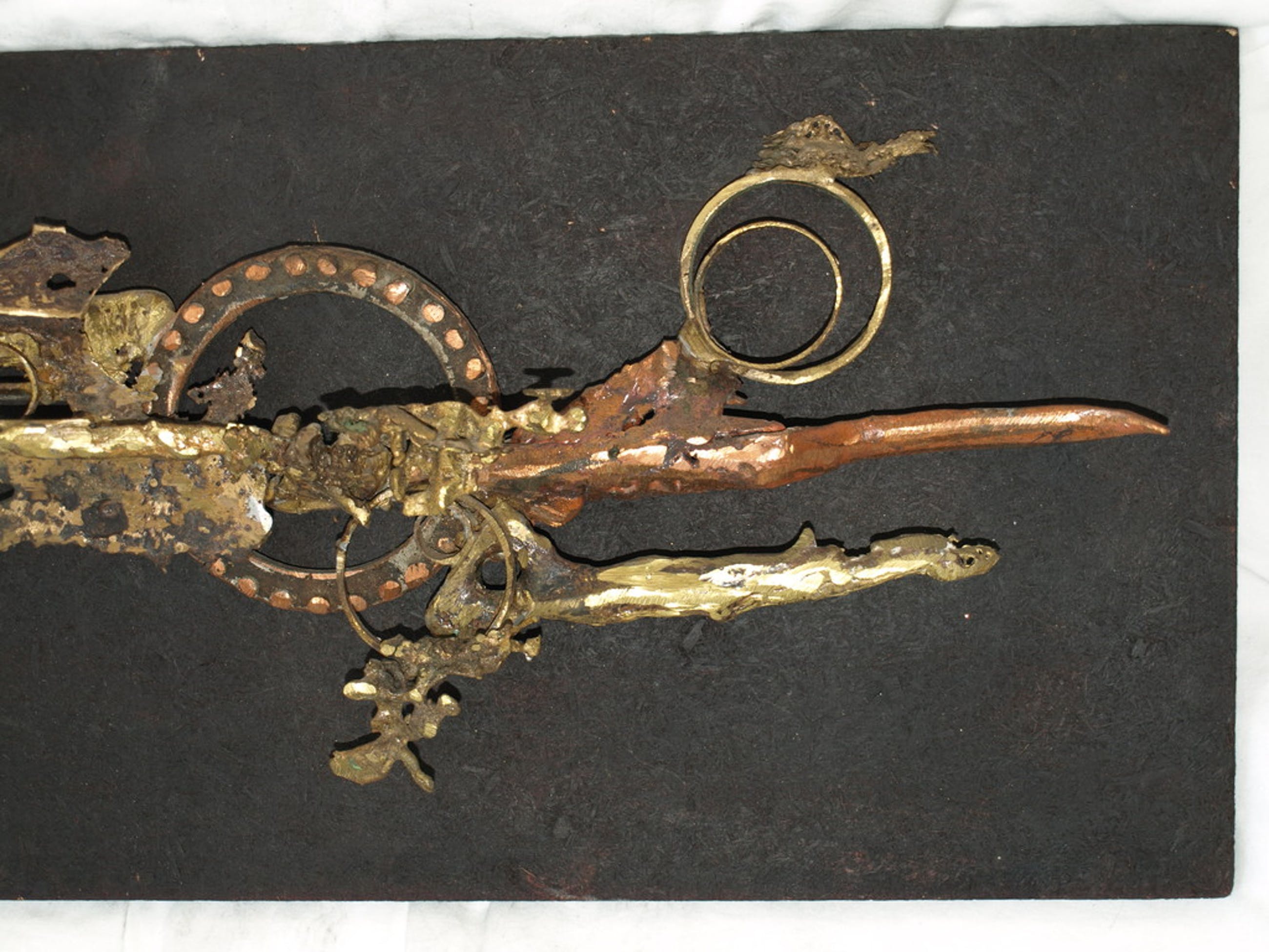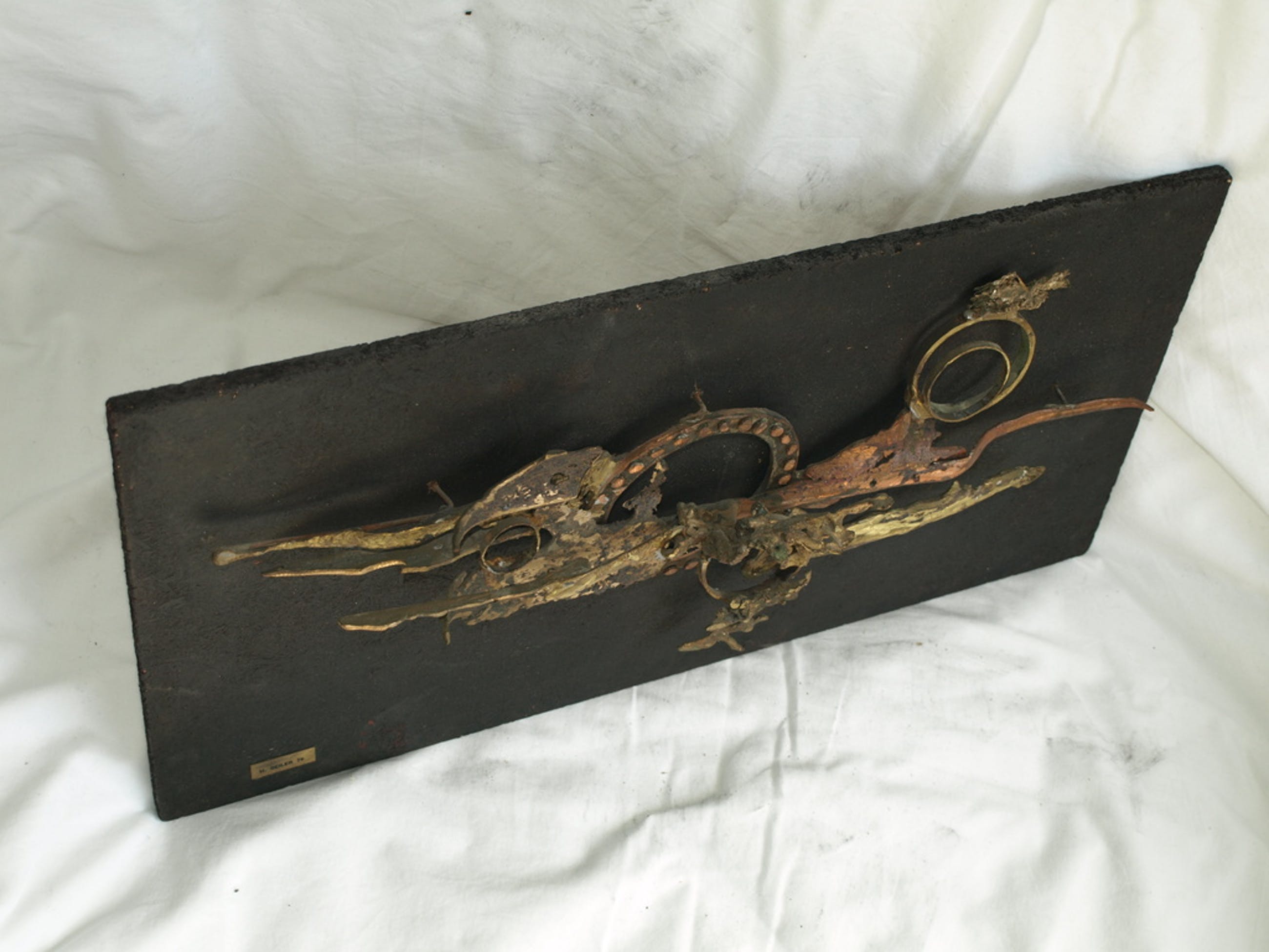 Het unieke abstracte werk is gemaakt van brons en ‘vergulde’ metalen en bevestigd op een zwart geschilderd paneel.