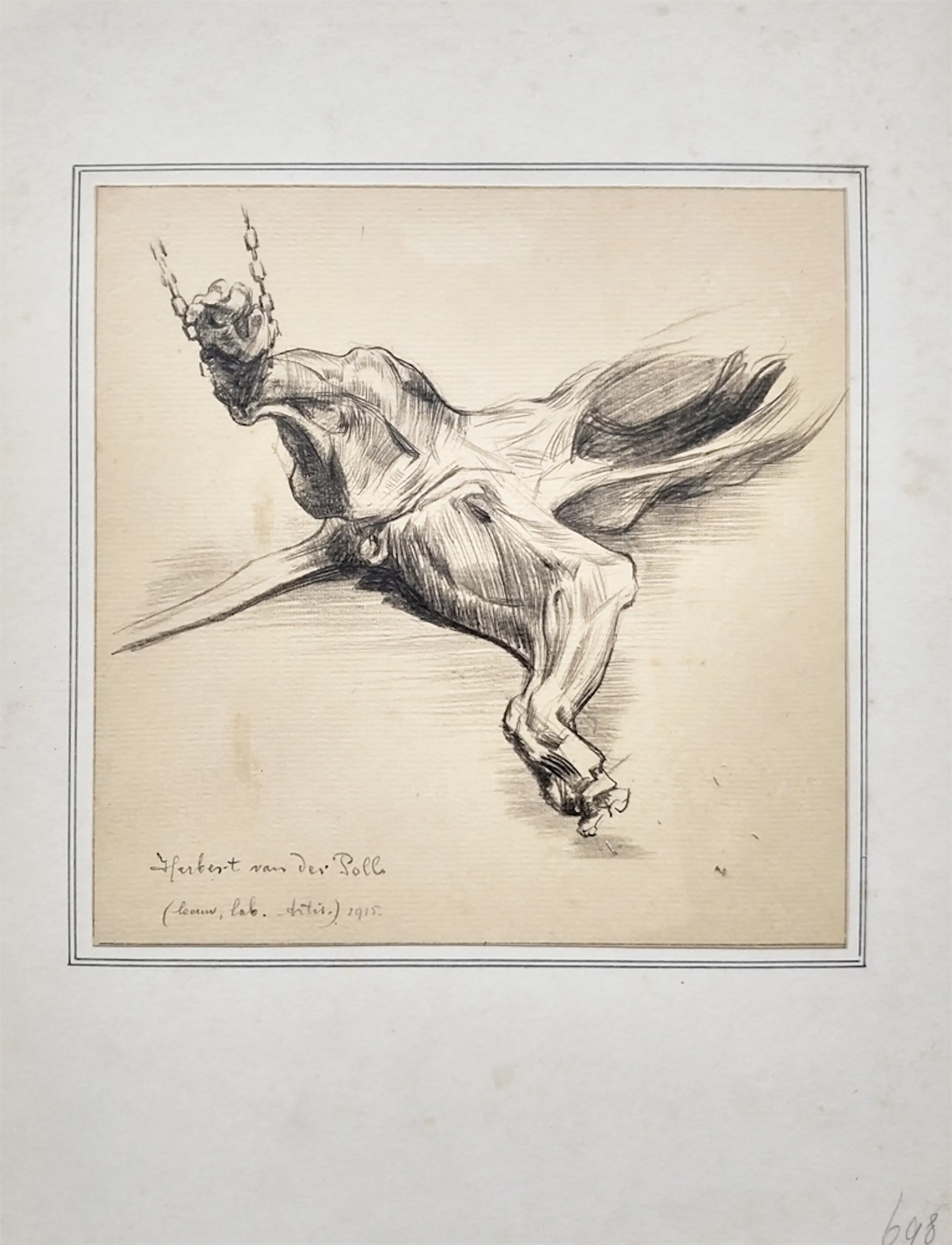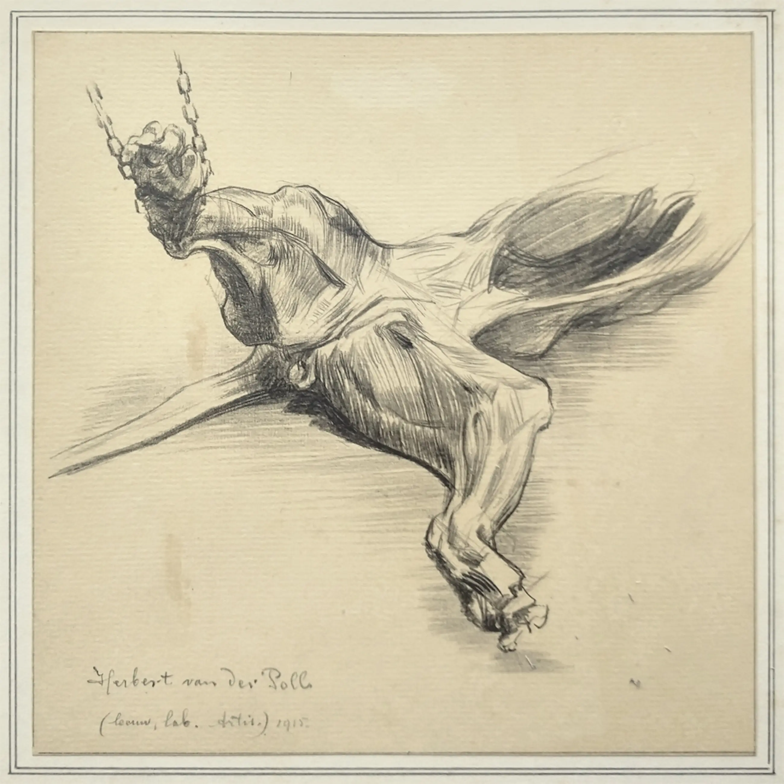 Tekening van een vastgeketende leeuw. De tekening is uit 1915 en voluit gesigneerd. Het blad meet 32 centimeter hoog en 24 centimeter breed.