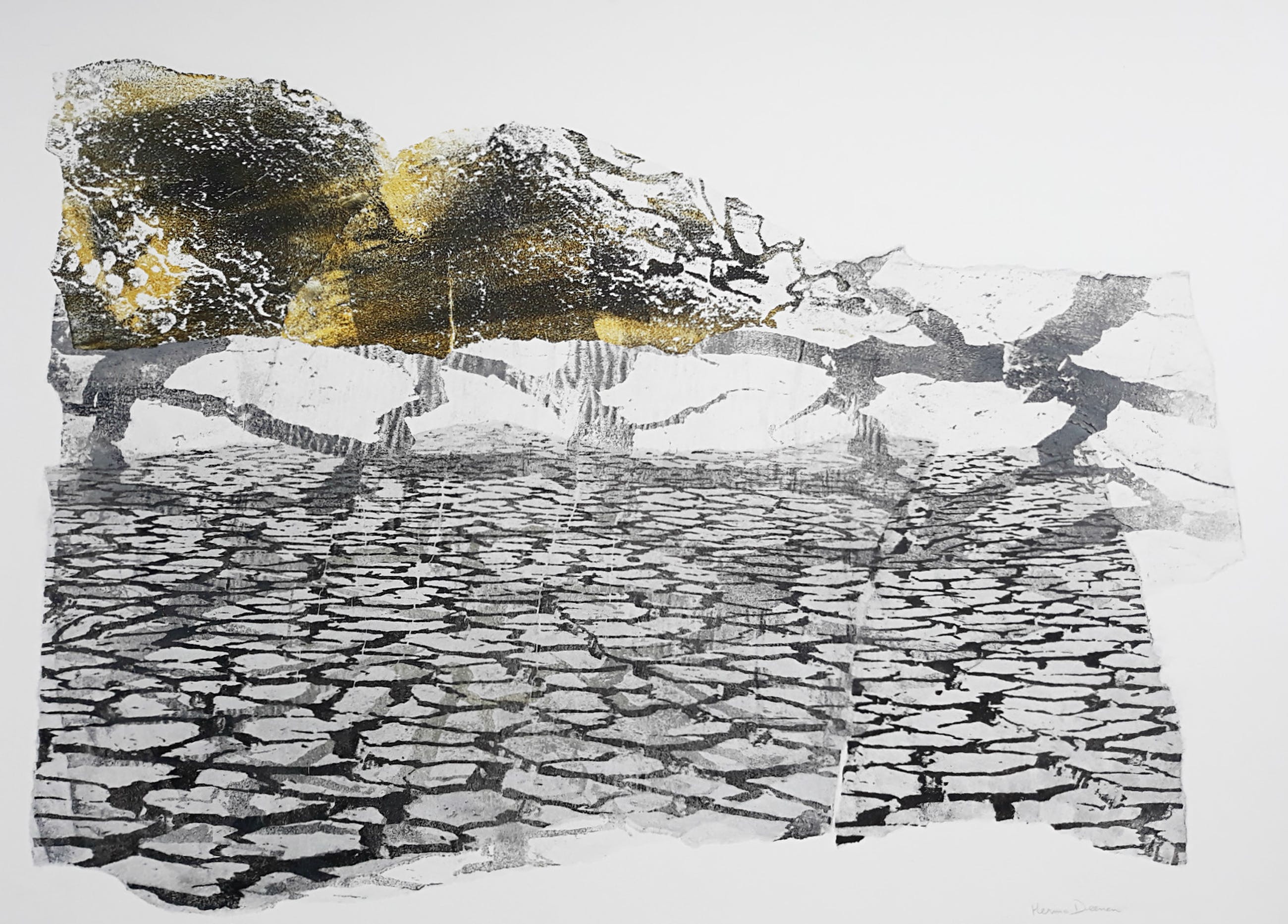 Semi-abstract landschap van Herma Deenen. Polymeerdruk op geschept papier, netjes gemonteerd op stijf dik papier/glad karton, met potlood gesigneerd. Afkomstig uit de kunstcollectie van ABNAMRO; in zeer goede conditie.