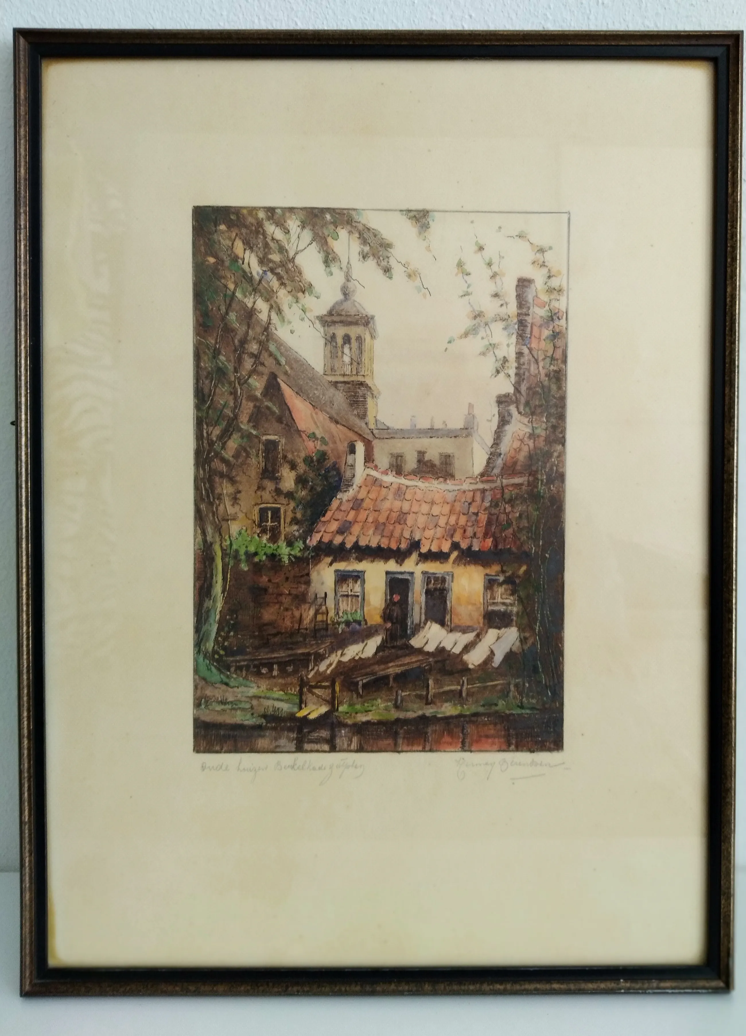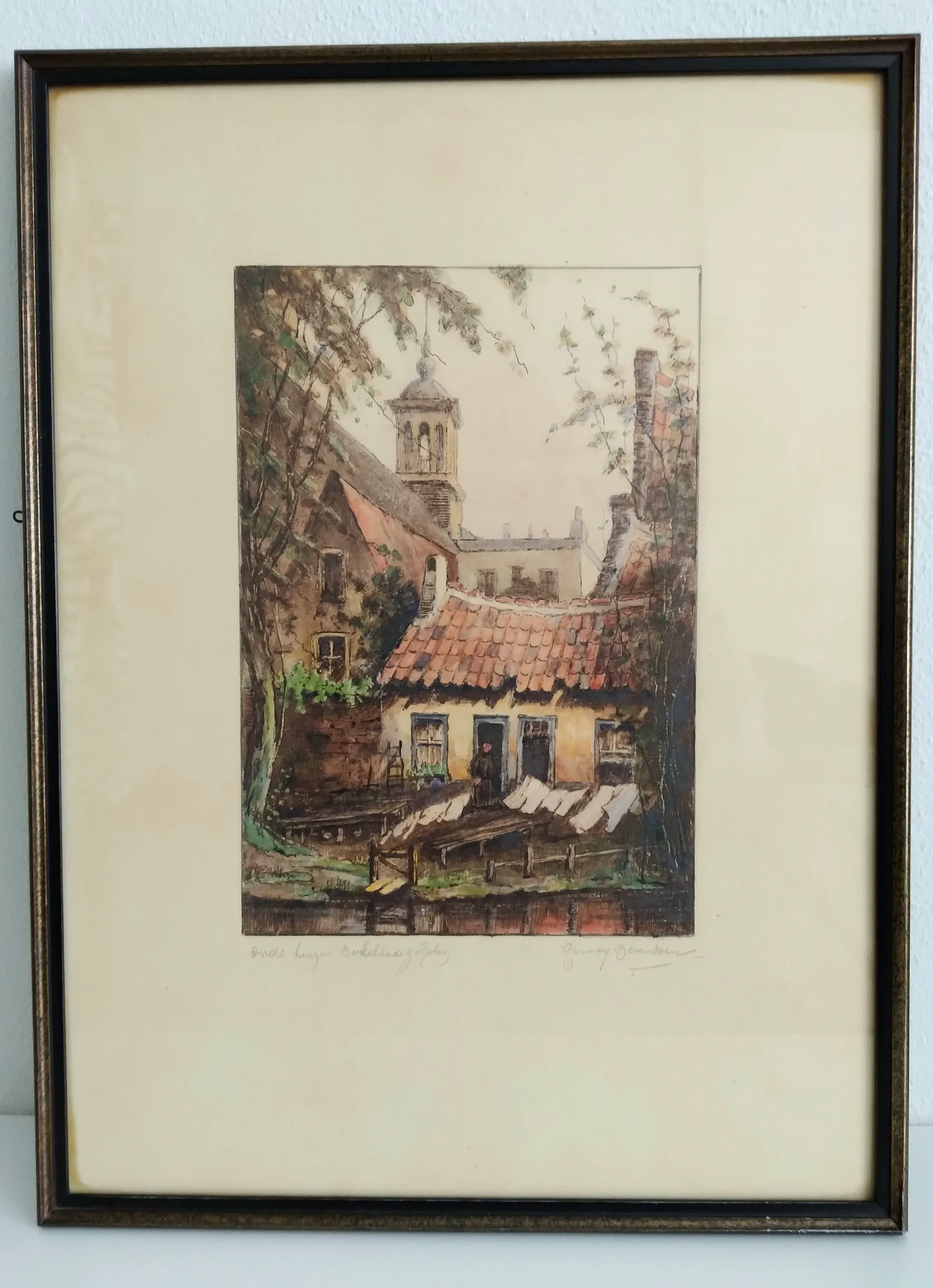 'Oude huizen Berkelkade Zutphen' is de titel van deze sfeervolle aquarel, gemaakt door H. Berendsen. Deze oude huizen staan naast de kerk in Zutphen.