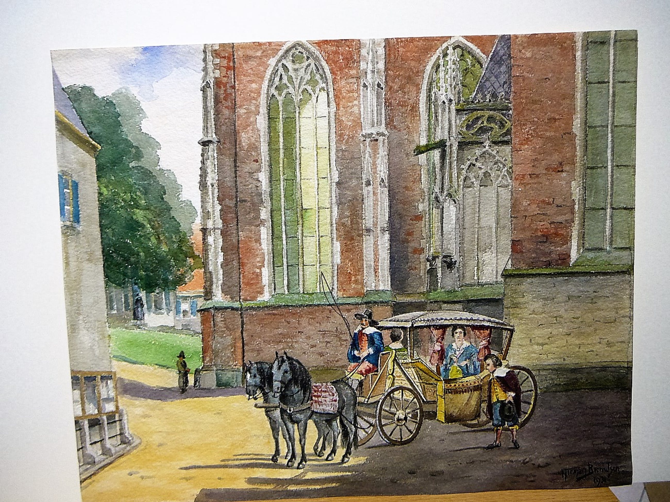 Zeer mooie aquarel van Herman Berendsen 1869-1948 Voorstellende rijtuig met 2 paarden met personen voor een kerk Herman Berendsen woonde in zutphen in de spittaalstraat D53a vemoedelijk is dit bij de kerk van Zutphen