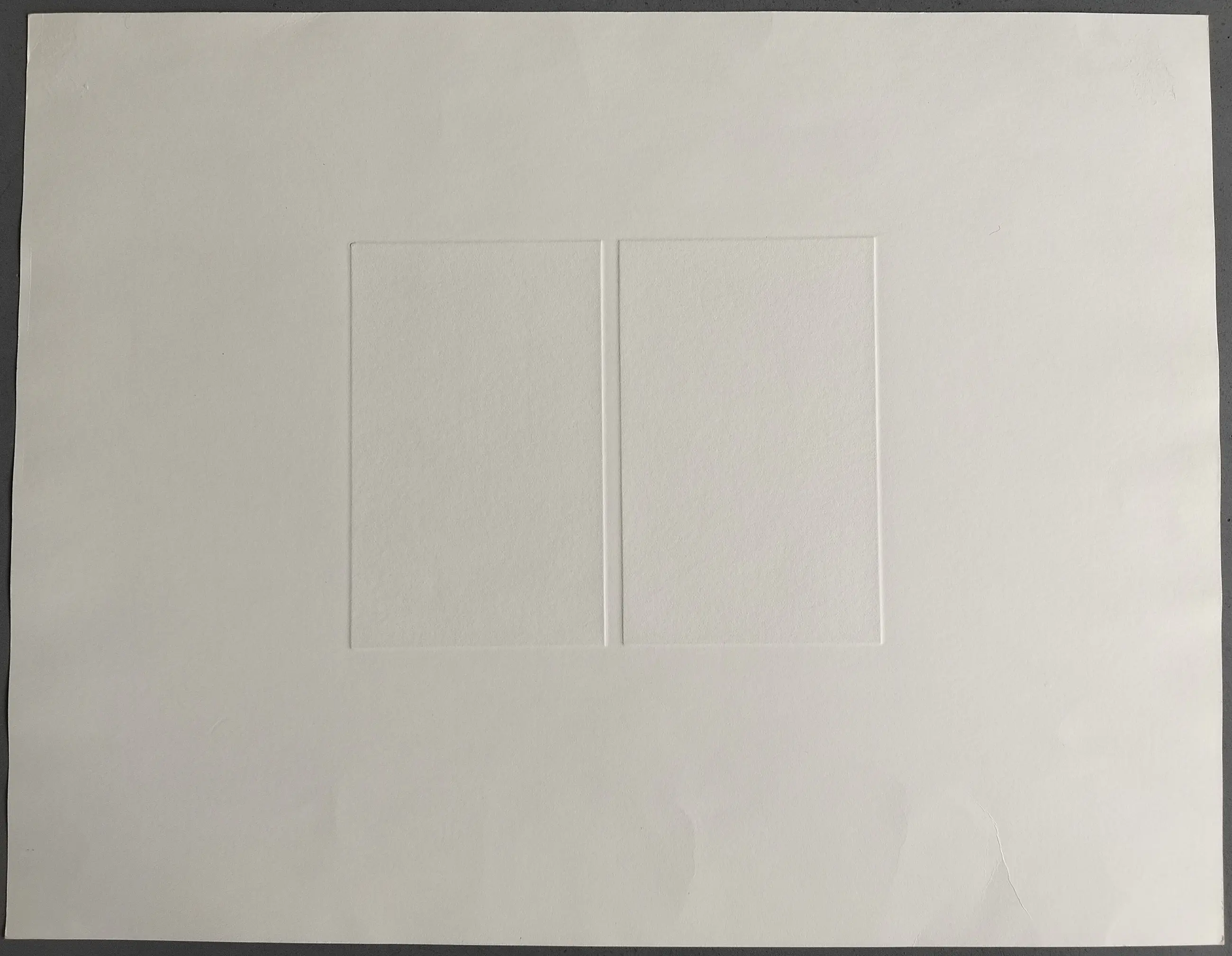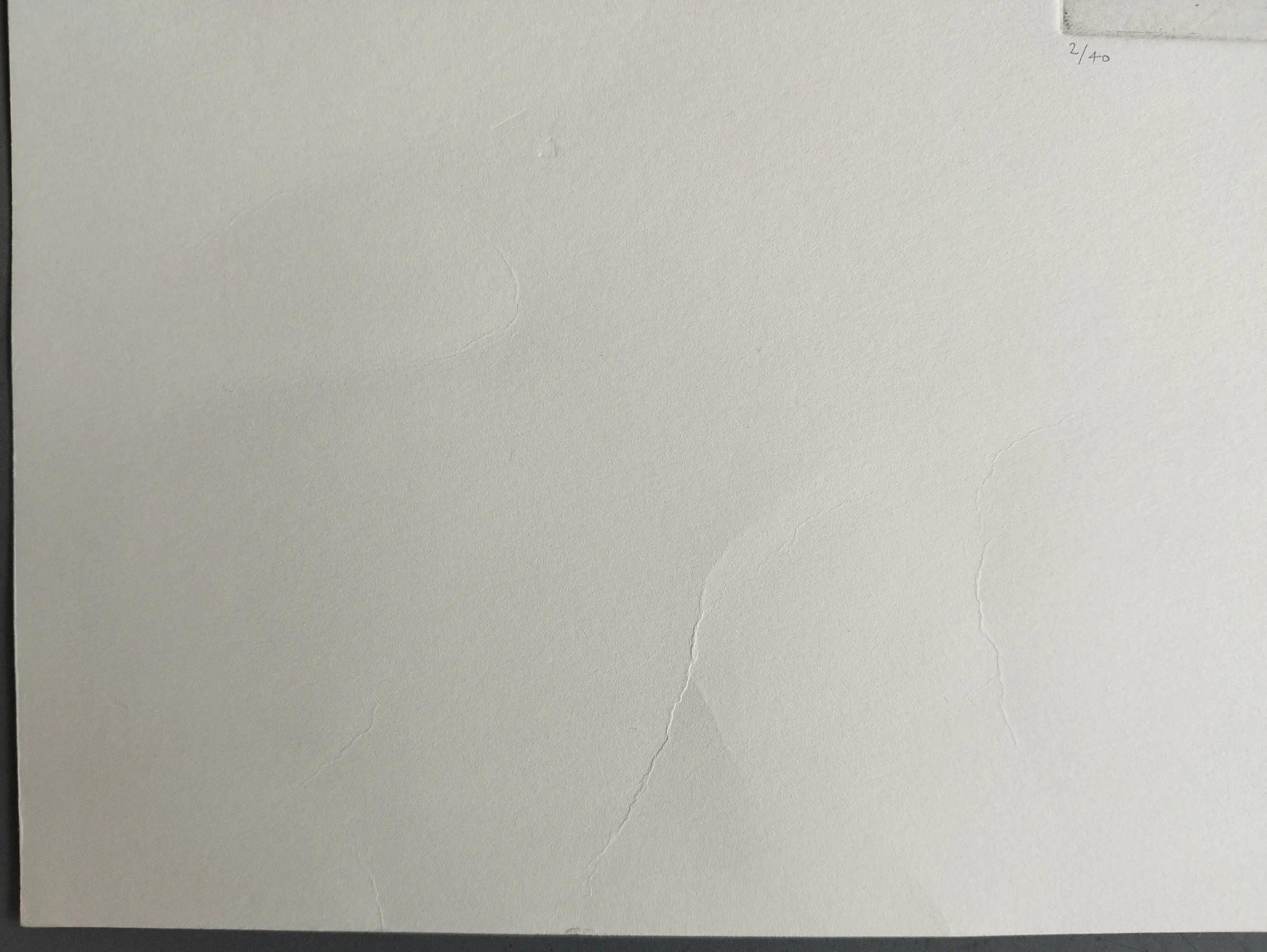 In de rechter onder hoek zit een vouw. Op een aantal plaatsen zijn lichte kreukjes / vouwtjes / deukjes in de wit marge te zien en onder de linker ets 2 donkere stipjes. Op de achterzijde is op 2 plaatsen papierverlies zichtbaar door het verwijderen van tape. Verder is het werk in prima staat.