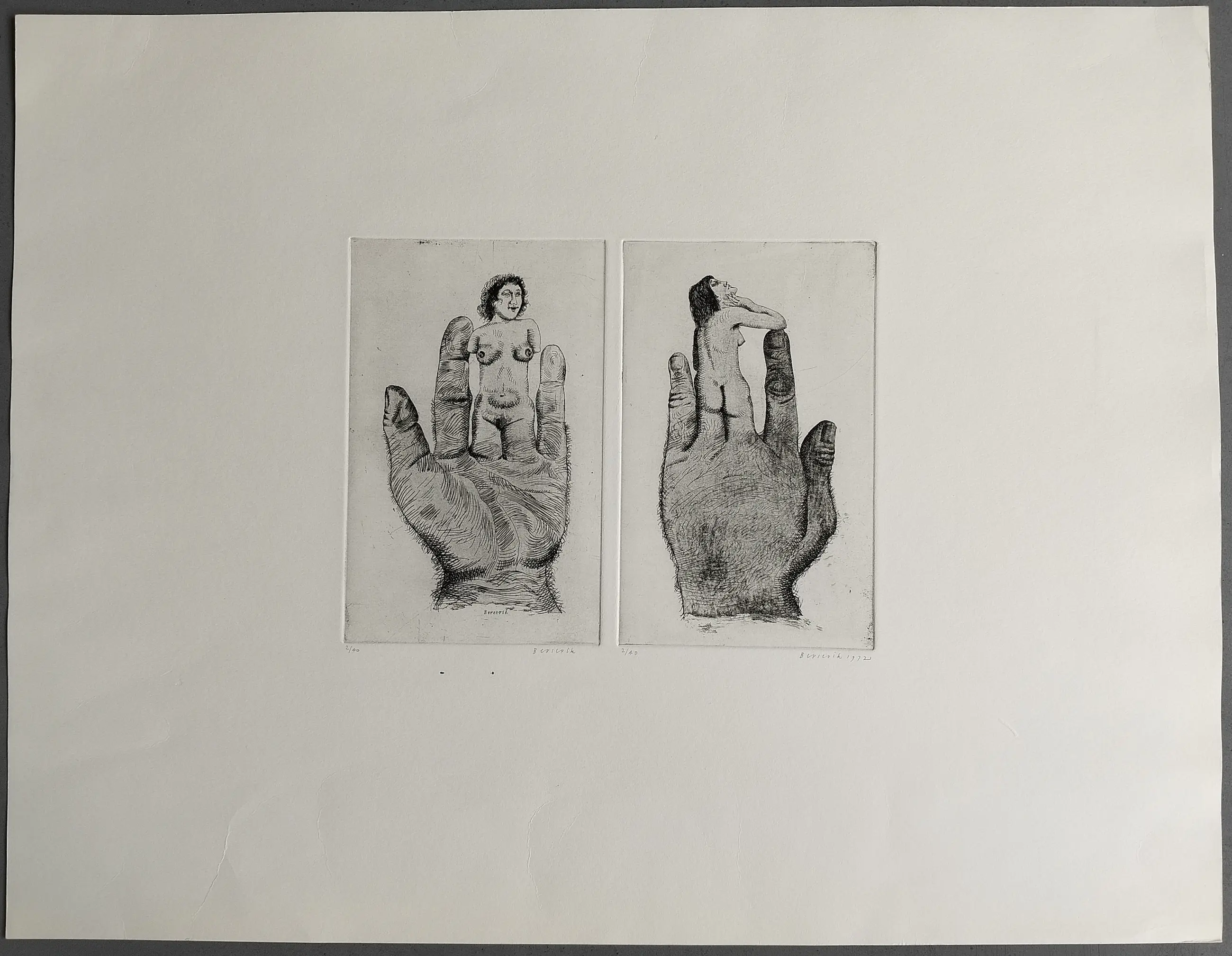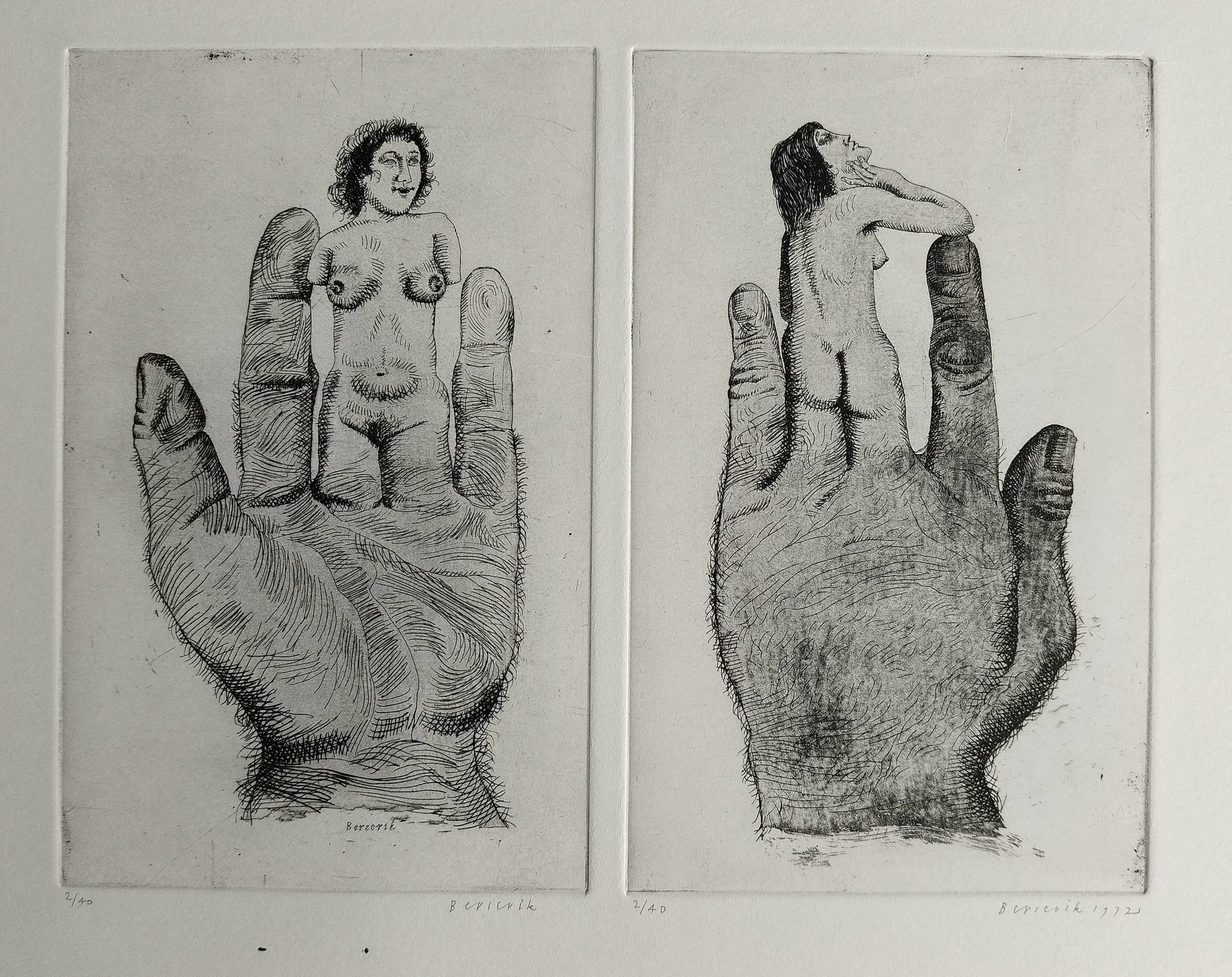 Herman Berserik (1921-2002) 2 gesigneerde etsen uit 1972 op 1 blad papier. Rechts 2x gesigneerd in potlood en 1 x gedateerd met 1972 Links 2x oplage 2/40. Afmeting werk 2x 21.5 x 13.5 cm (hxb) Afmeting papier 50 x 64.5 cm (hxb)