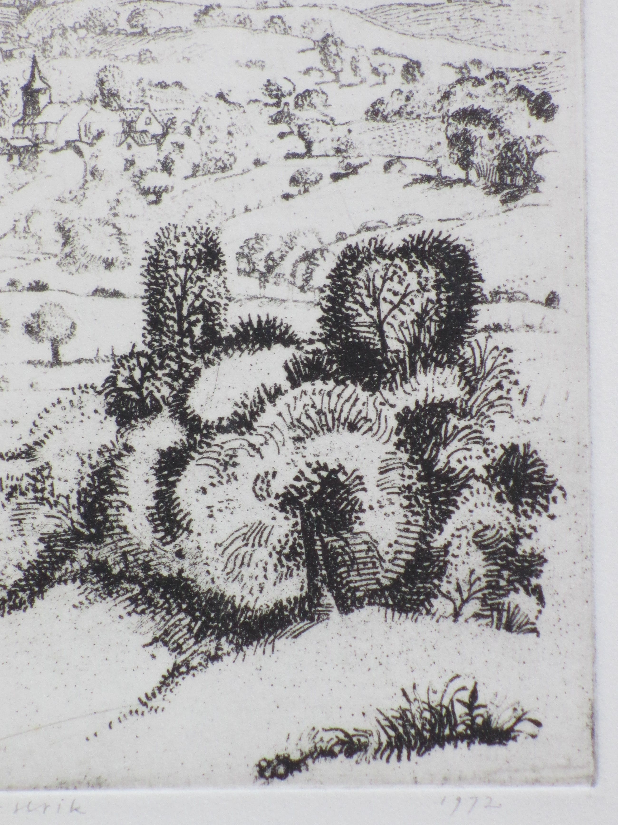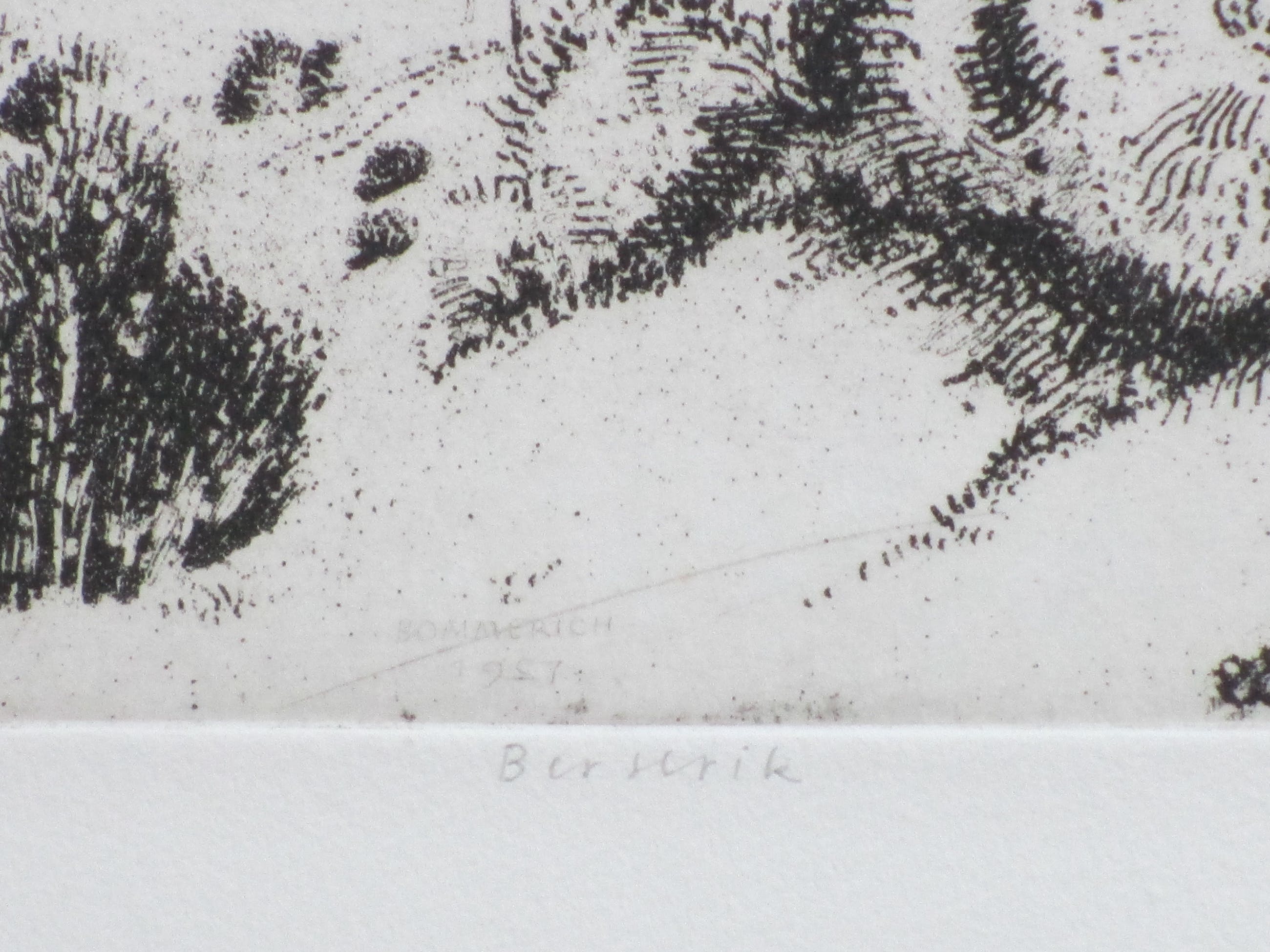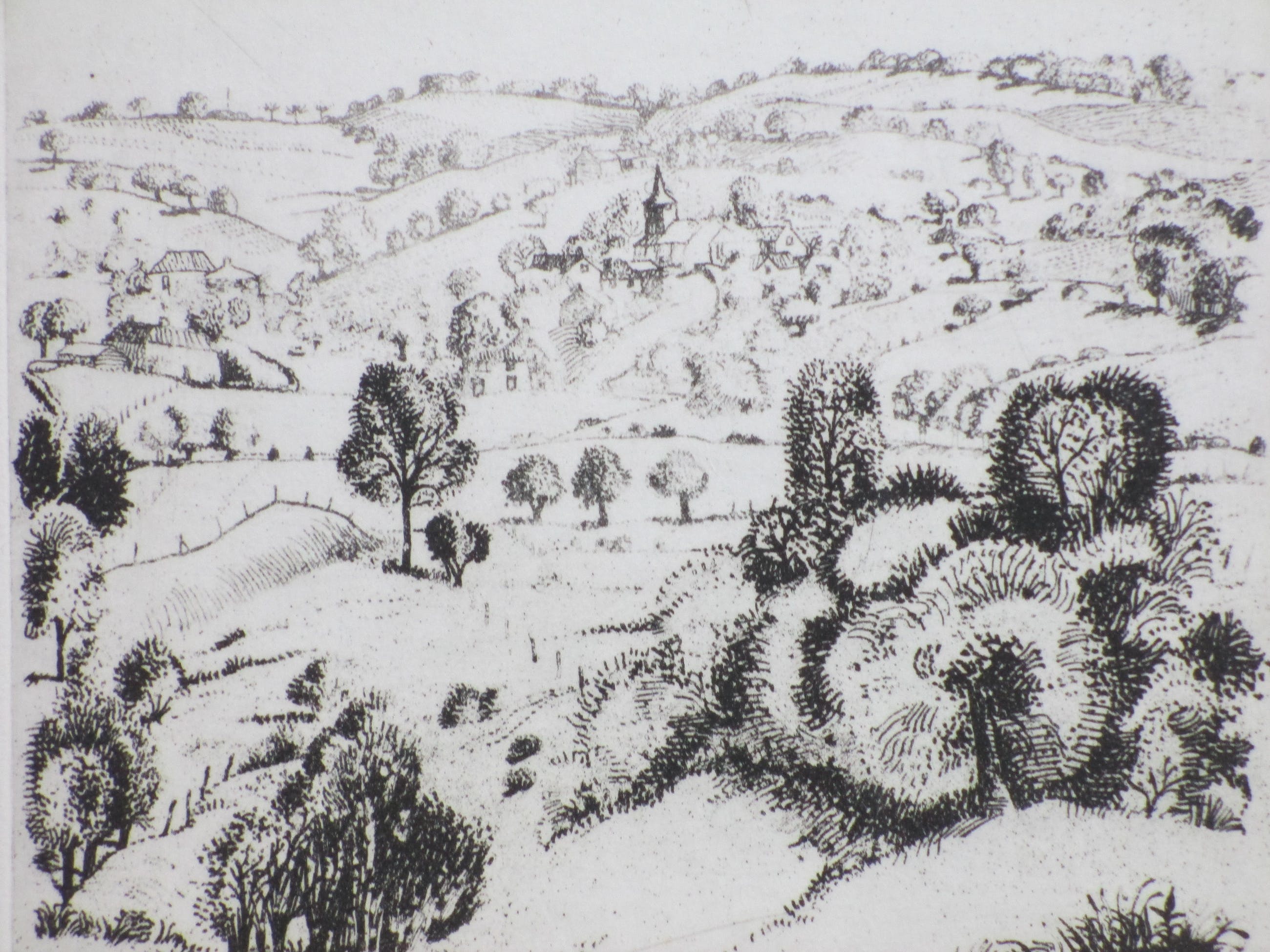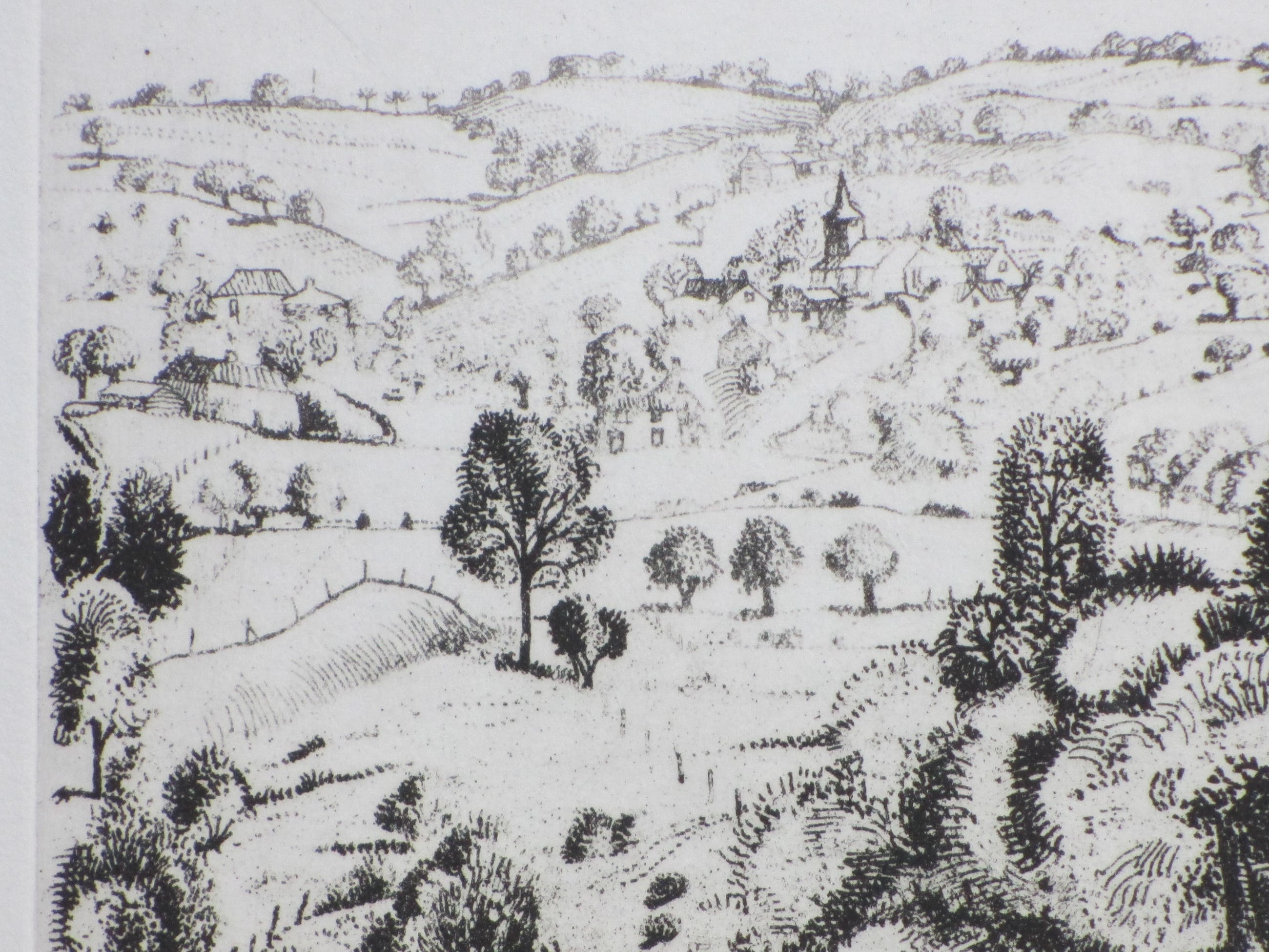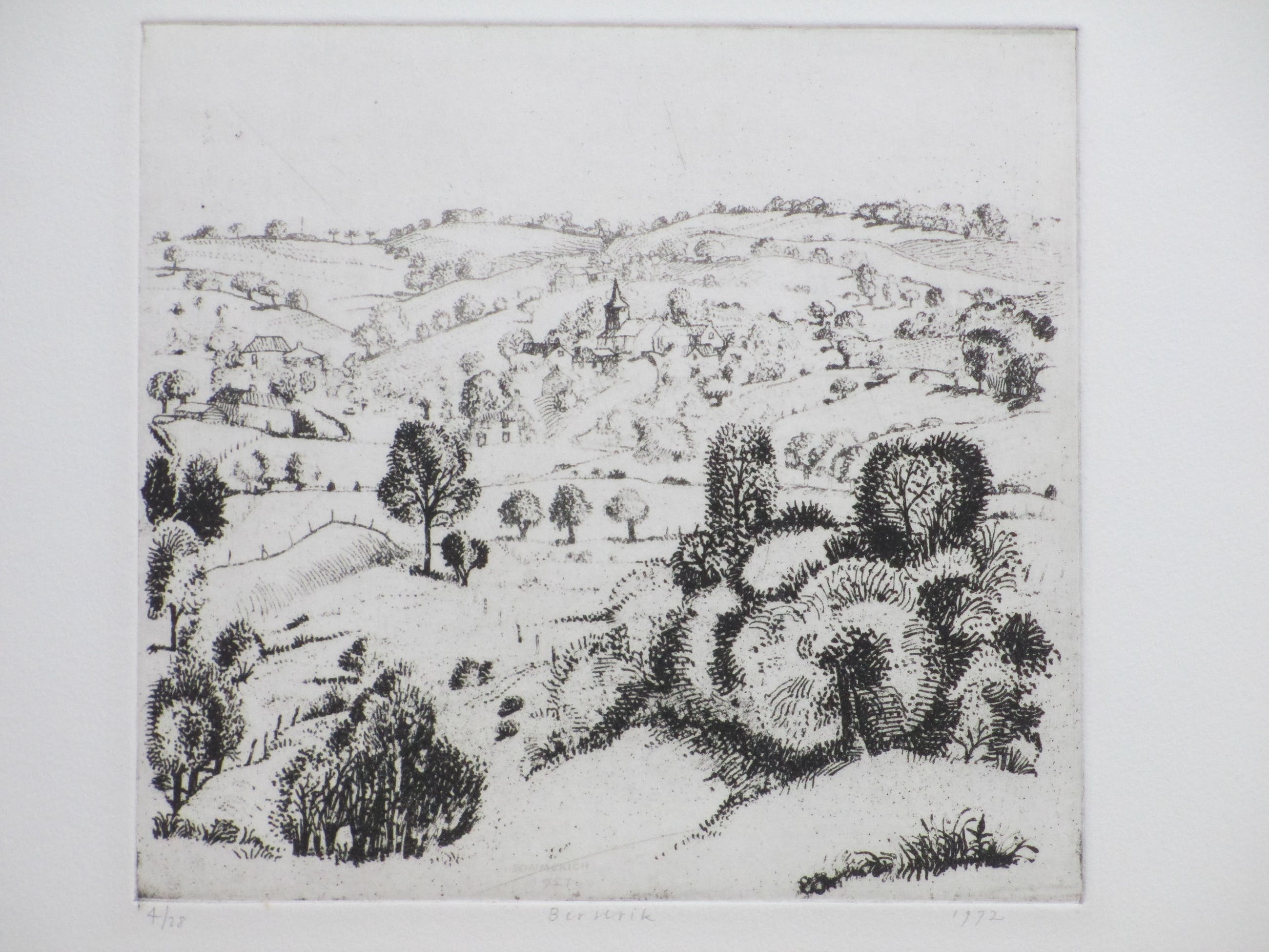 Ets door Herman Berserik Voorstelling van een Frans landschap met hoeven en kerk Losbladig, beeldmaat 20x21, bladmaat 32x38 Gesigneerd in potlood m.o.: 'Berserik' Gedateerd in potlood r.o.: '1972' Genummerd in potlood l.o.: '4/28' Authenticiteit volledig gegarandeerd