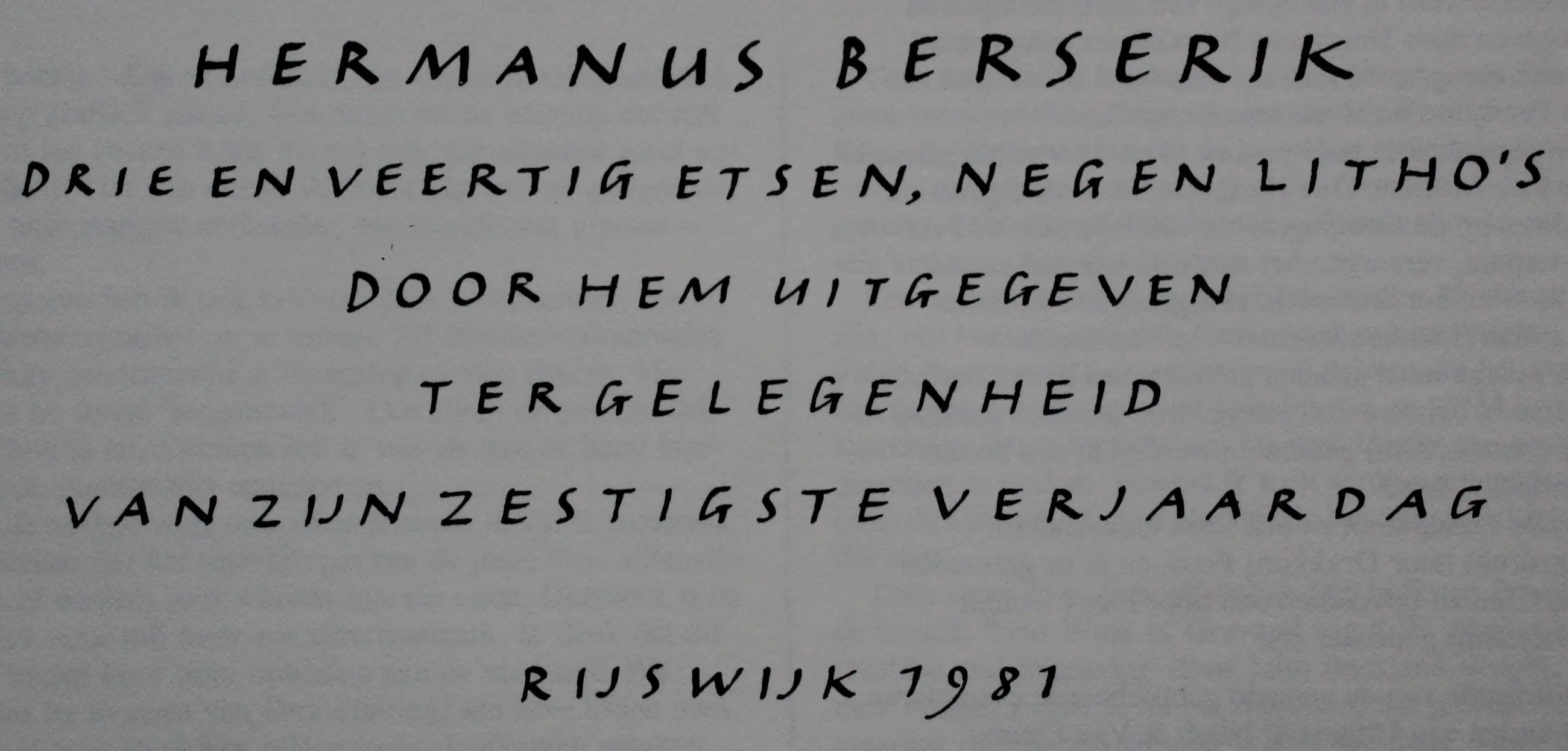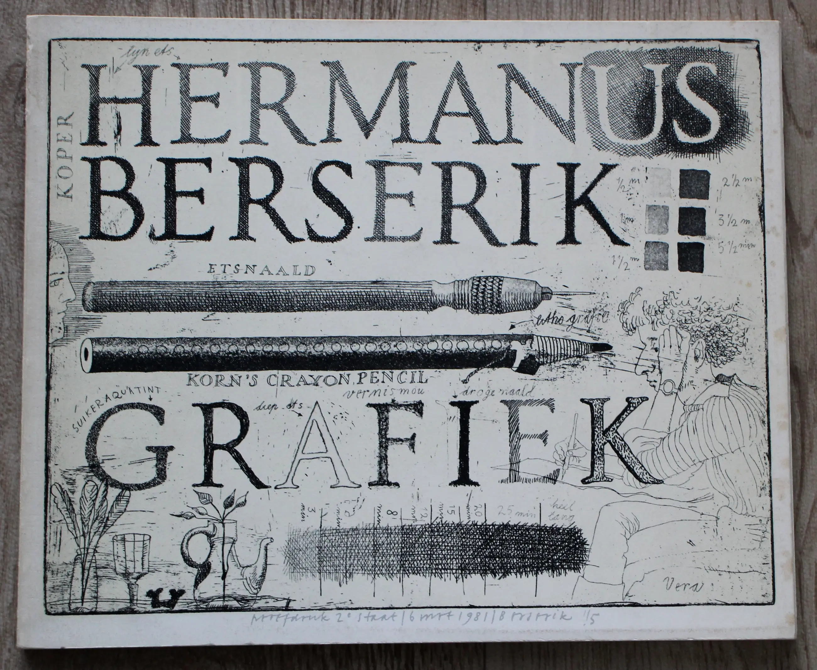 Boekje van Herman Berserik met afbeeldingen van 43 etsen, 9 litho's, door hem uitgegeven ter gelegenheid van zijn 65e verjaardag. Jaar: 1981. Proefdruk 2e staat. Afmetingen boekje: H20 x b23.5cm. Het boekje is op de voorkant gesigneerd door de kunstenaar. De authenticiteit van het aangeboden werk wordt volledig gegarandeerd. Een certificaat van echtheid kan, op aanvraag, worden gemaild.