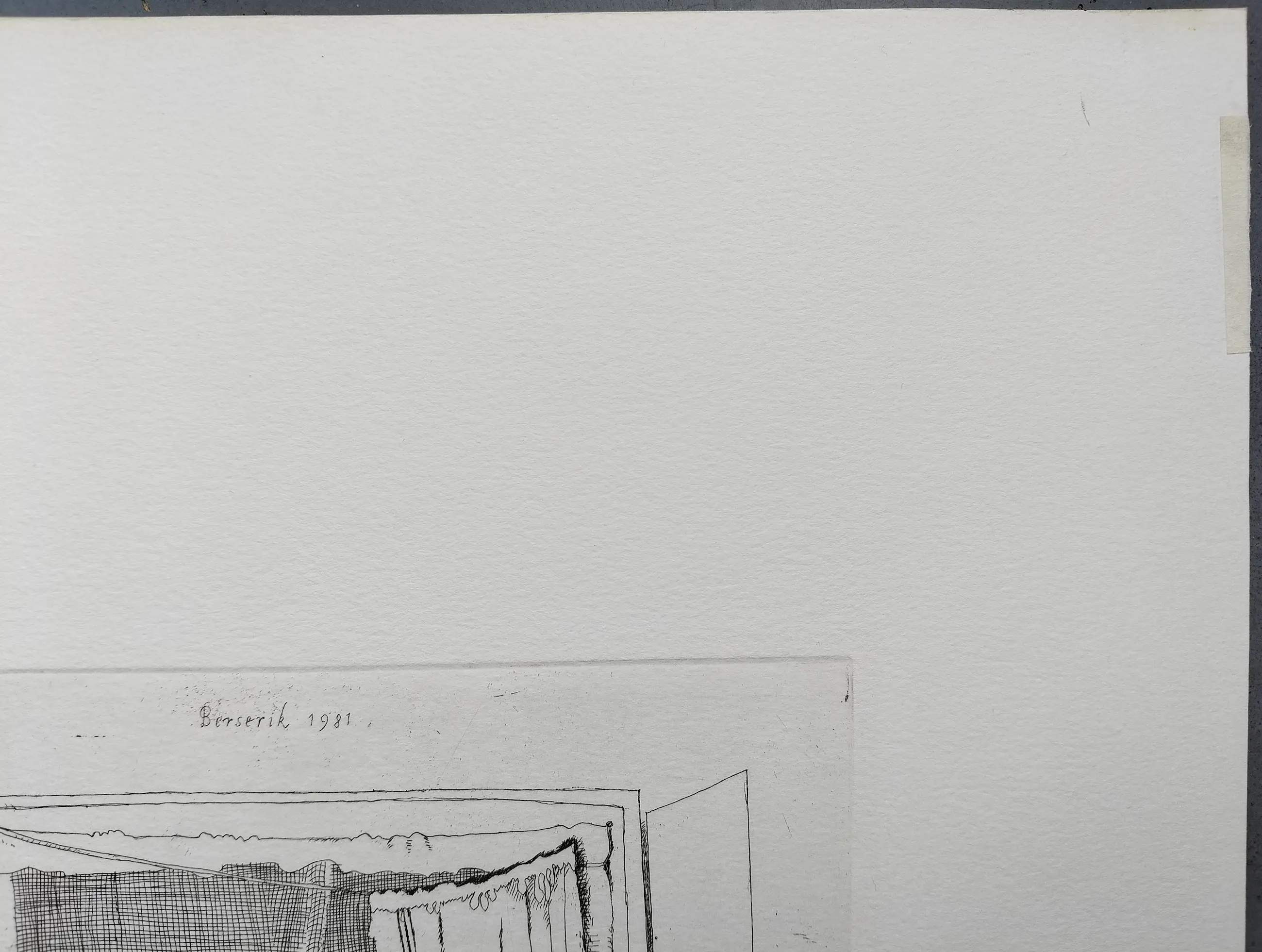 Er zitten 3 stukjes tape op het papier geplakt en aan de bovenrand van het papier is een lichte verkleuring en een klein streepje zichtbaar. Rechtsonder is het papier een stukje kleiner. Verder is de ets in prima staat.