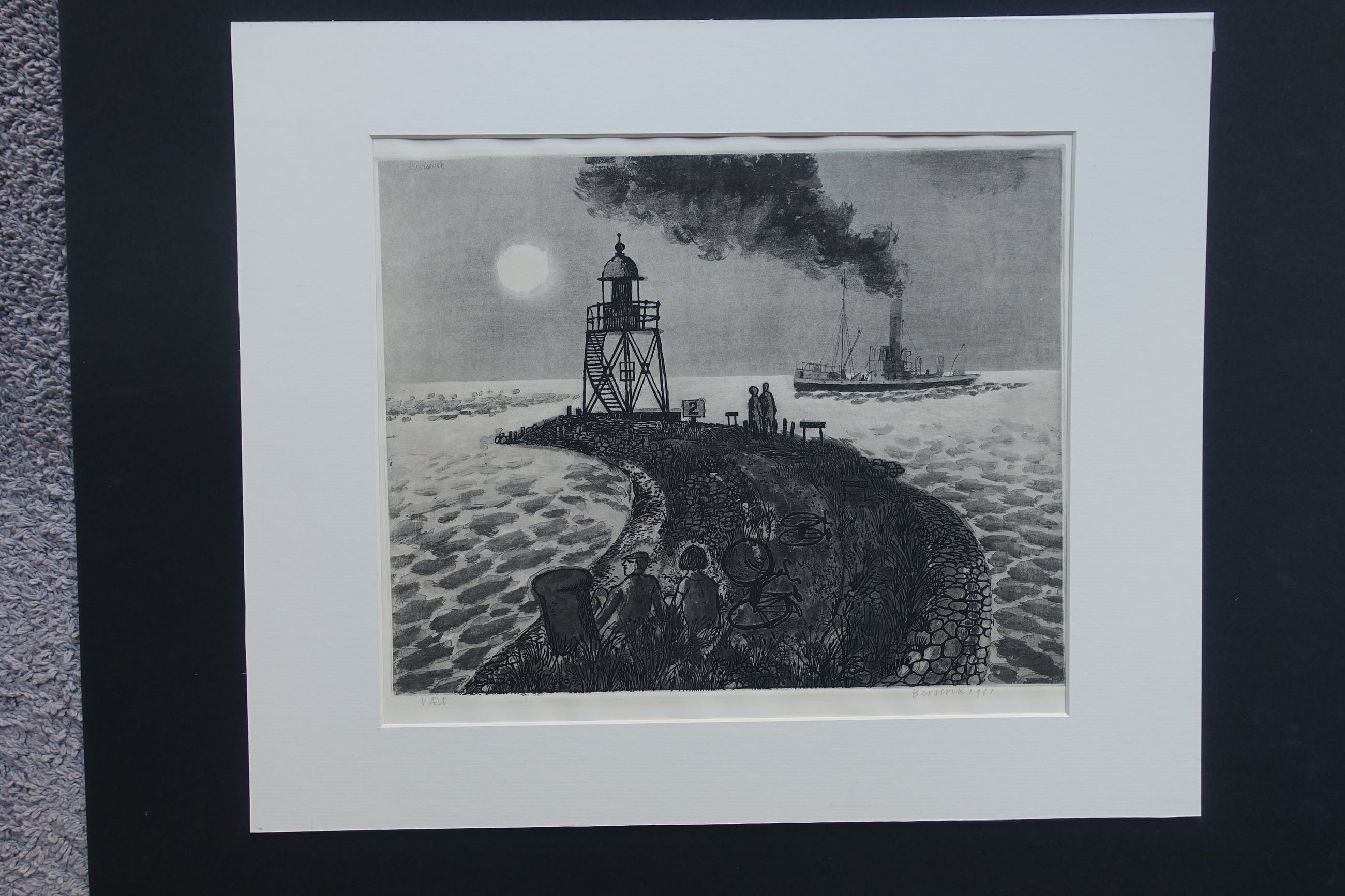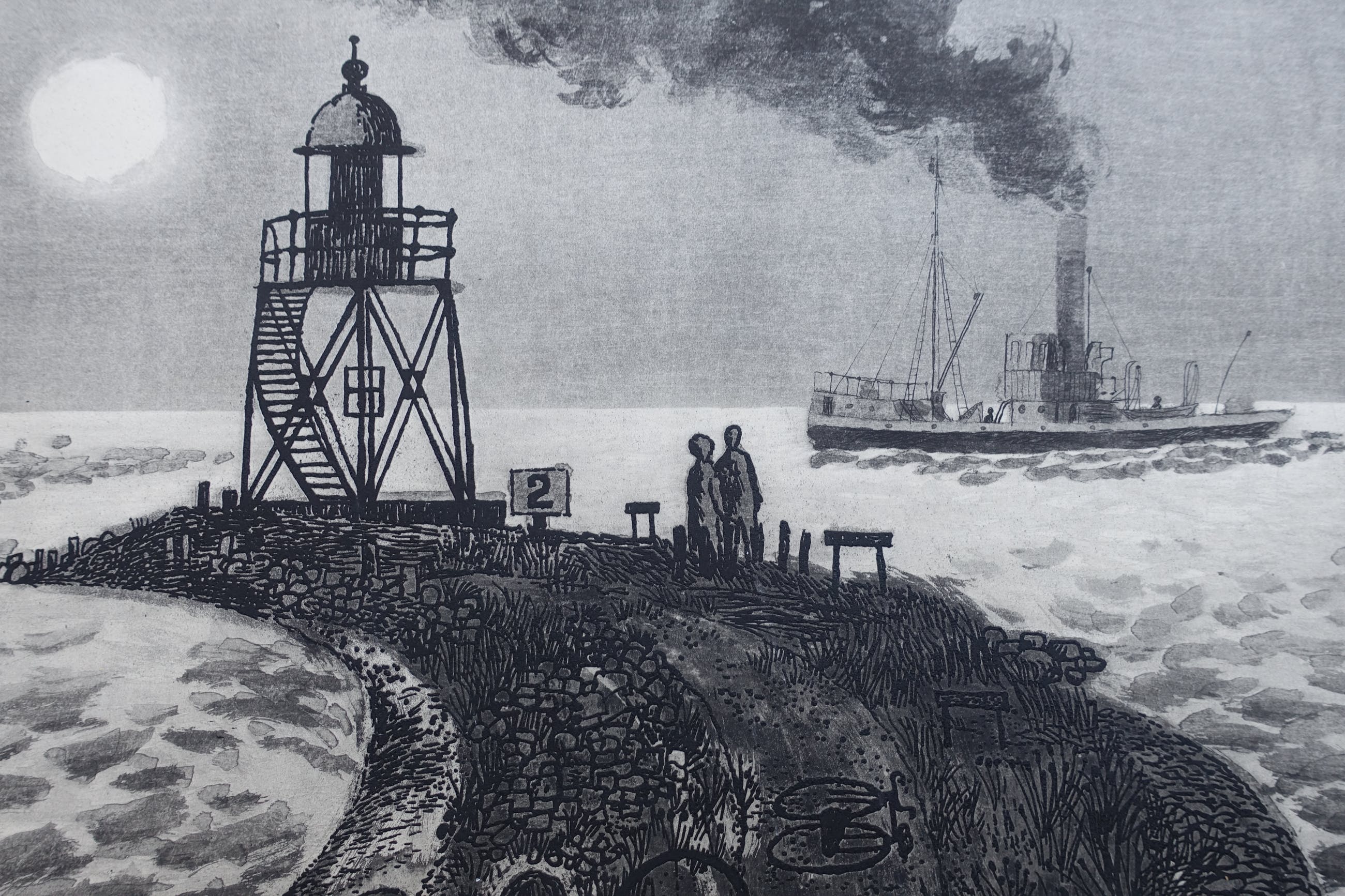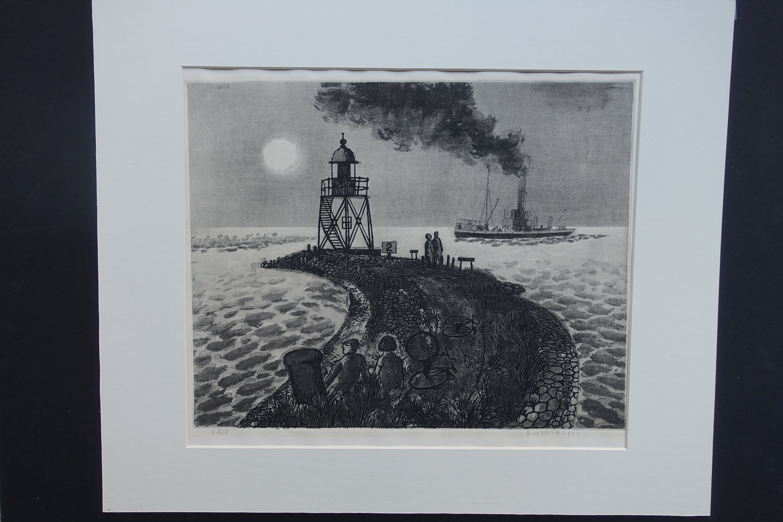 Havenhoofd met stoomboot en wandelaars op de strekdam is een bekende prent uit de zestiger jaren. Gesigneerd en gedateerd met potlood en l.bov. berserik in de plaat. Onderdeel van het VAEVO programma ( Vereniging tot bevordering van het Aethetische Element in het Voortgezet Onderwijs). Ets/aquatint in zeer goede conditie.