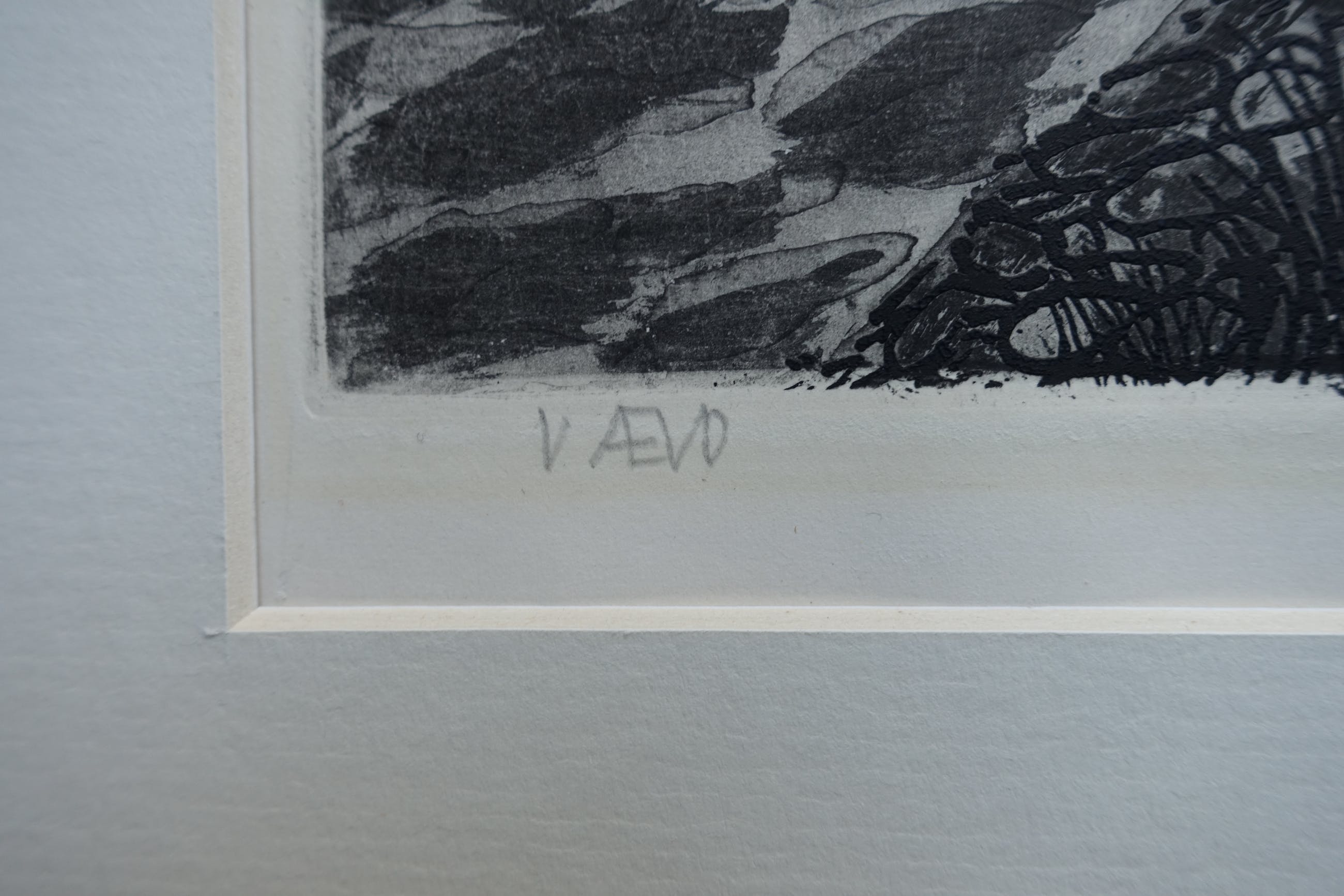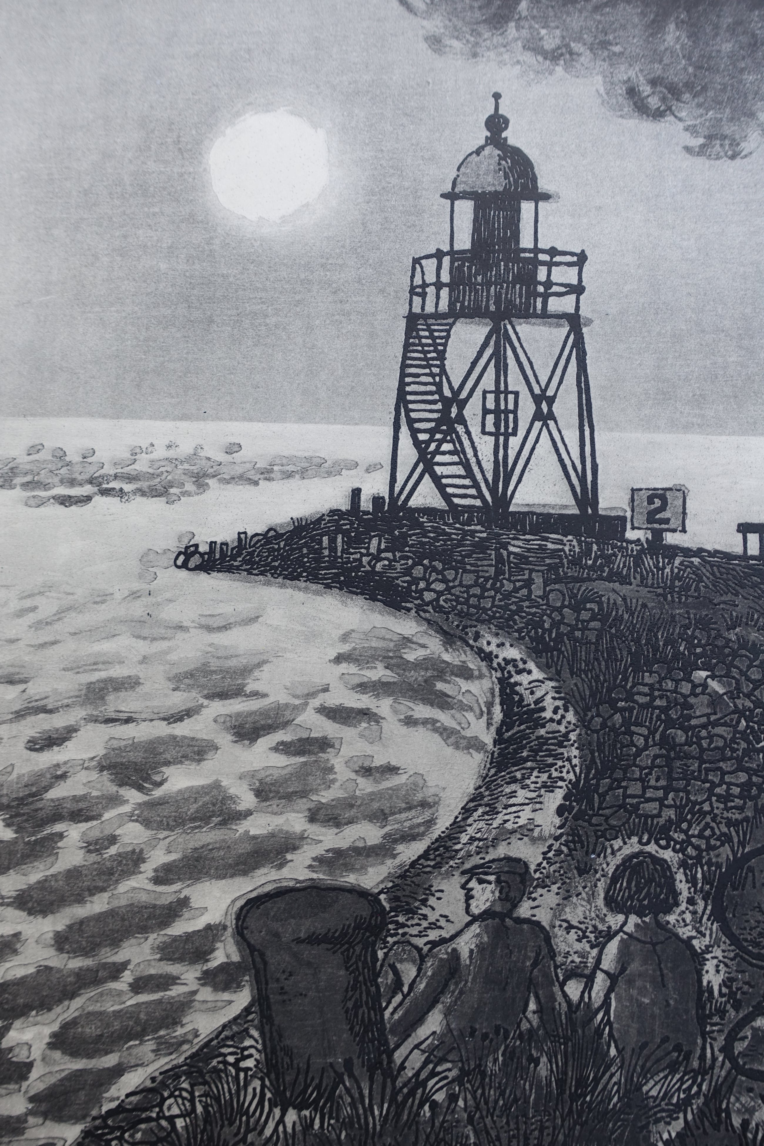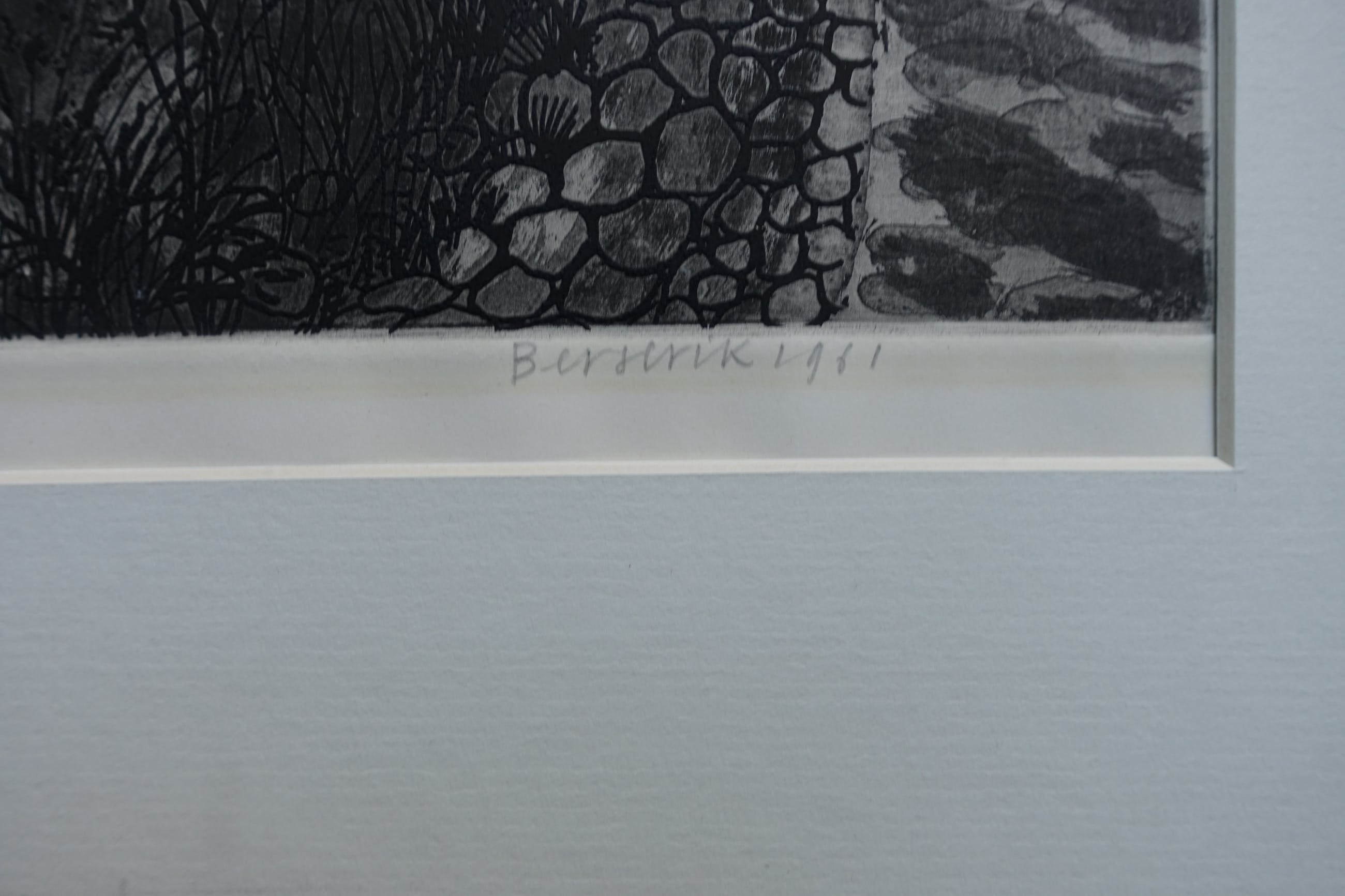 Havenhoofd met stoomboot en wandelaars op de strekdam is een bekende prent uit de zestiger jaren. Gesigneerd en gedateerd met potlood en l.bov. berserik in de plaat. Onderdeel van het VAEVO programma ( Vereniging tot bevordering van het Aethetische Element in het Voortgezet Onderwijs). Ets/aquatint in zeer goede conditie.