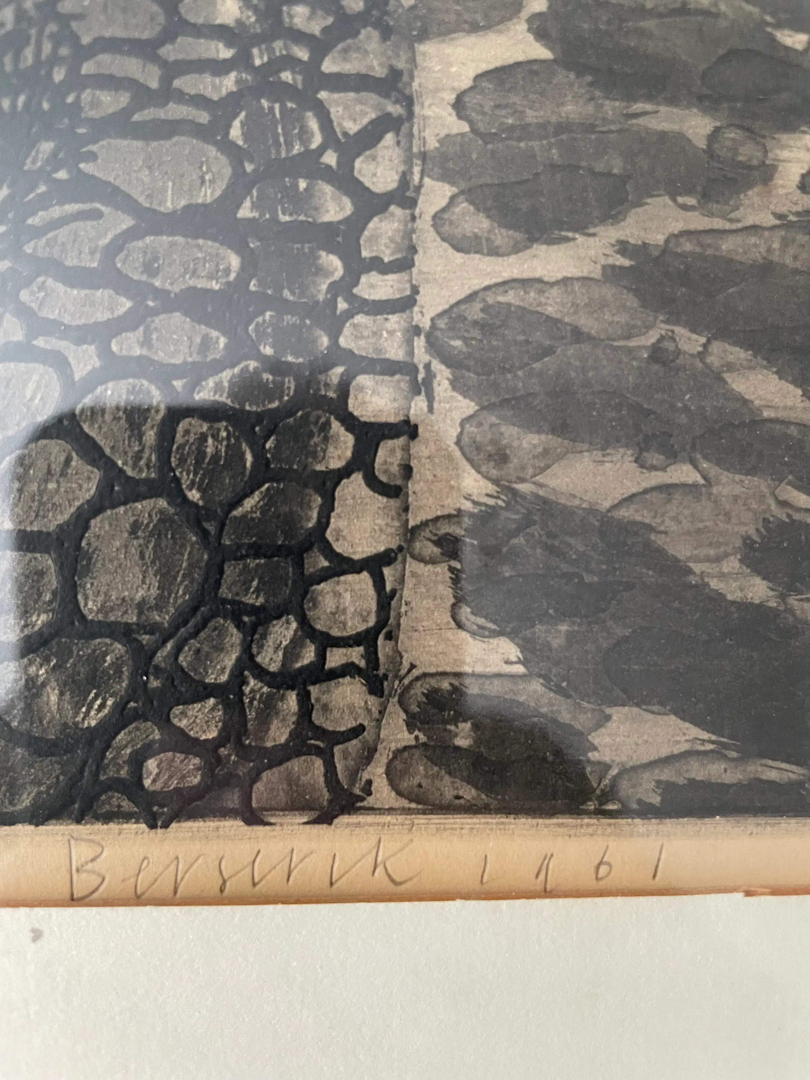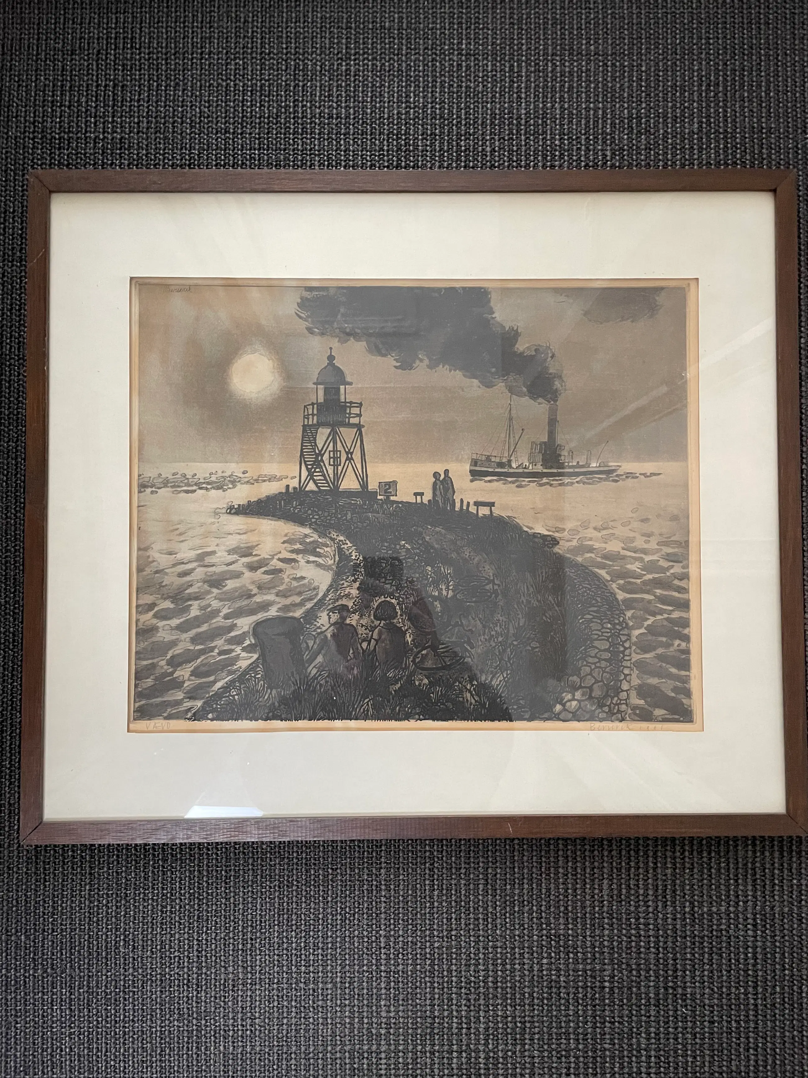 Ets "Op de Pier" van Herman Berserik uit 1961. Linksboven gesigneerd in de plaat 'Berserik'. Met potlood VAEVO (Vereniging tot Bevordering van het Aesthetisch Element in het Voortgezet Onderwijs) linksonder. Met potlood gesigneerd en gedateerd door de kunstenaar rechtsonder.