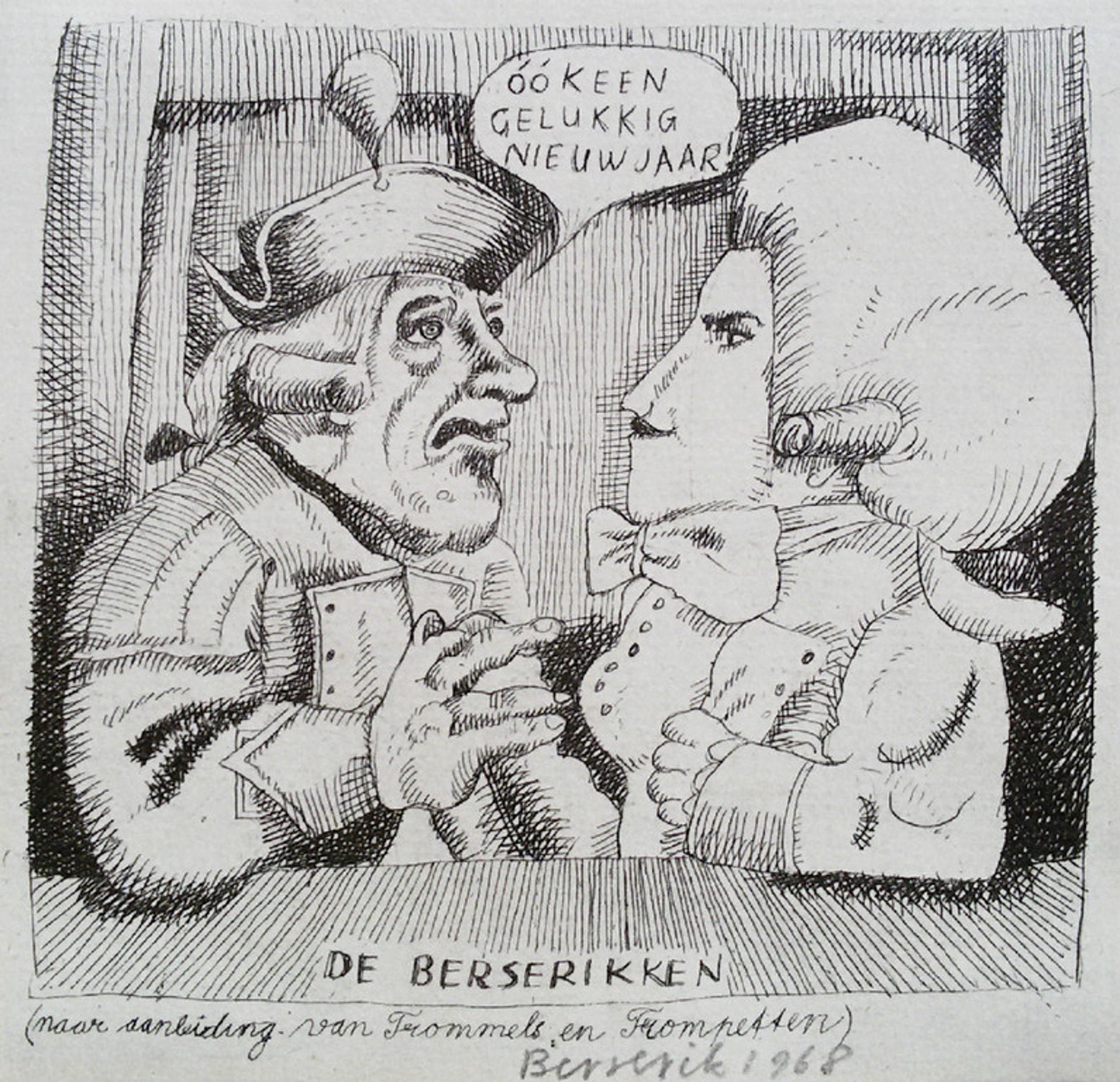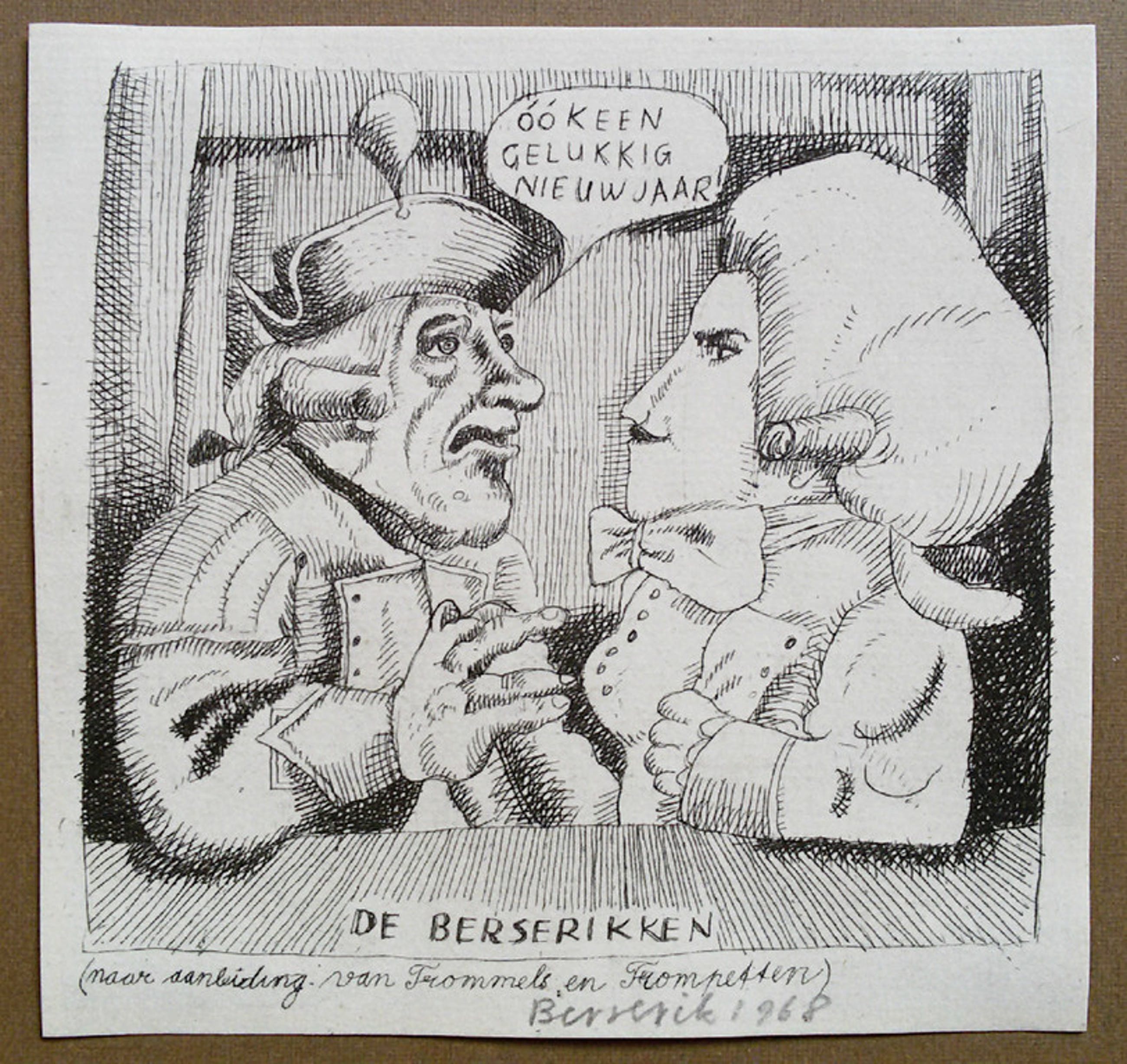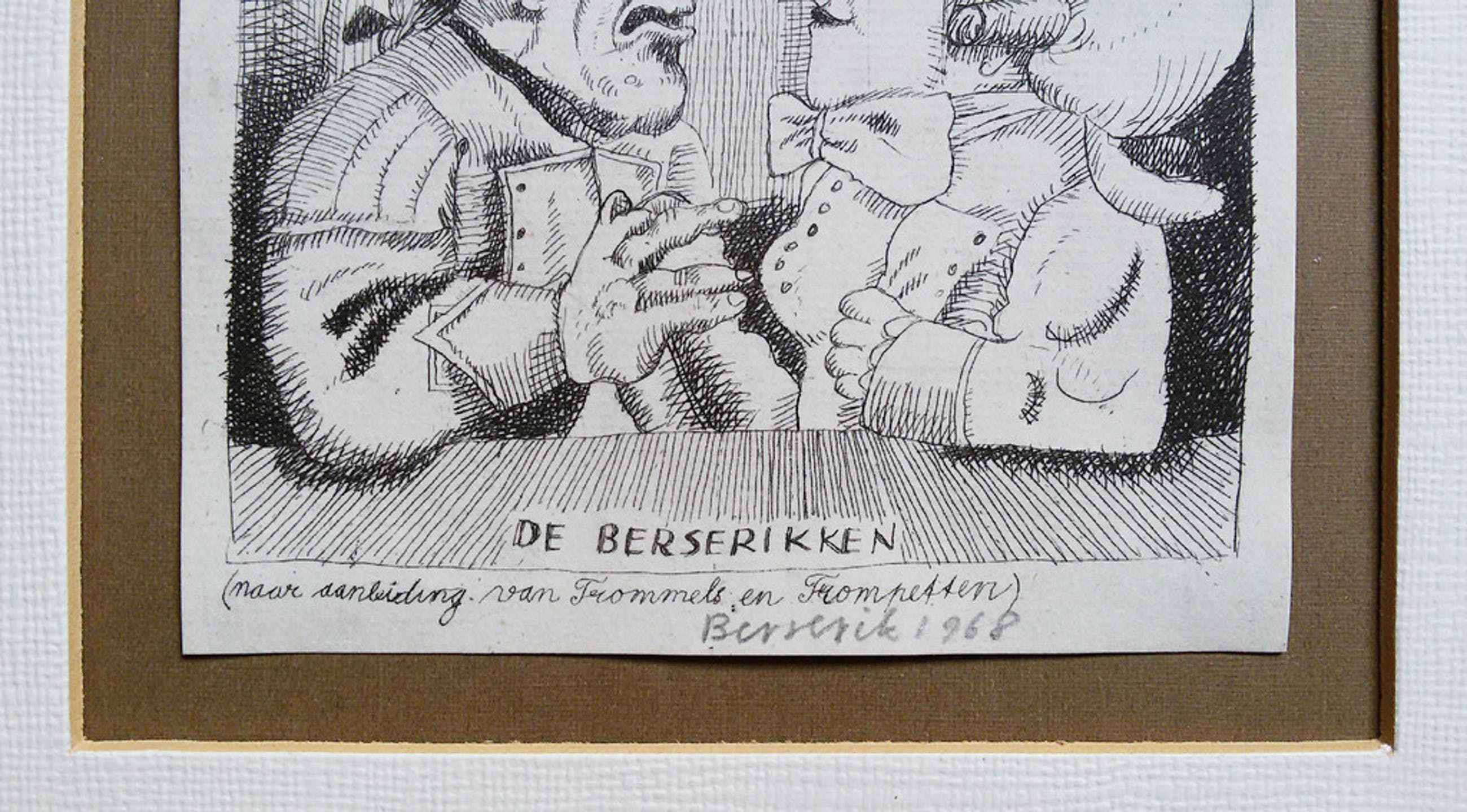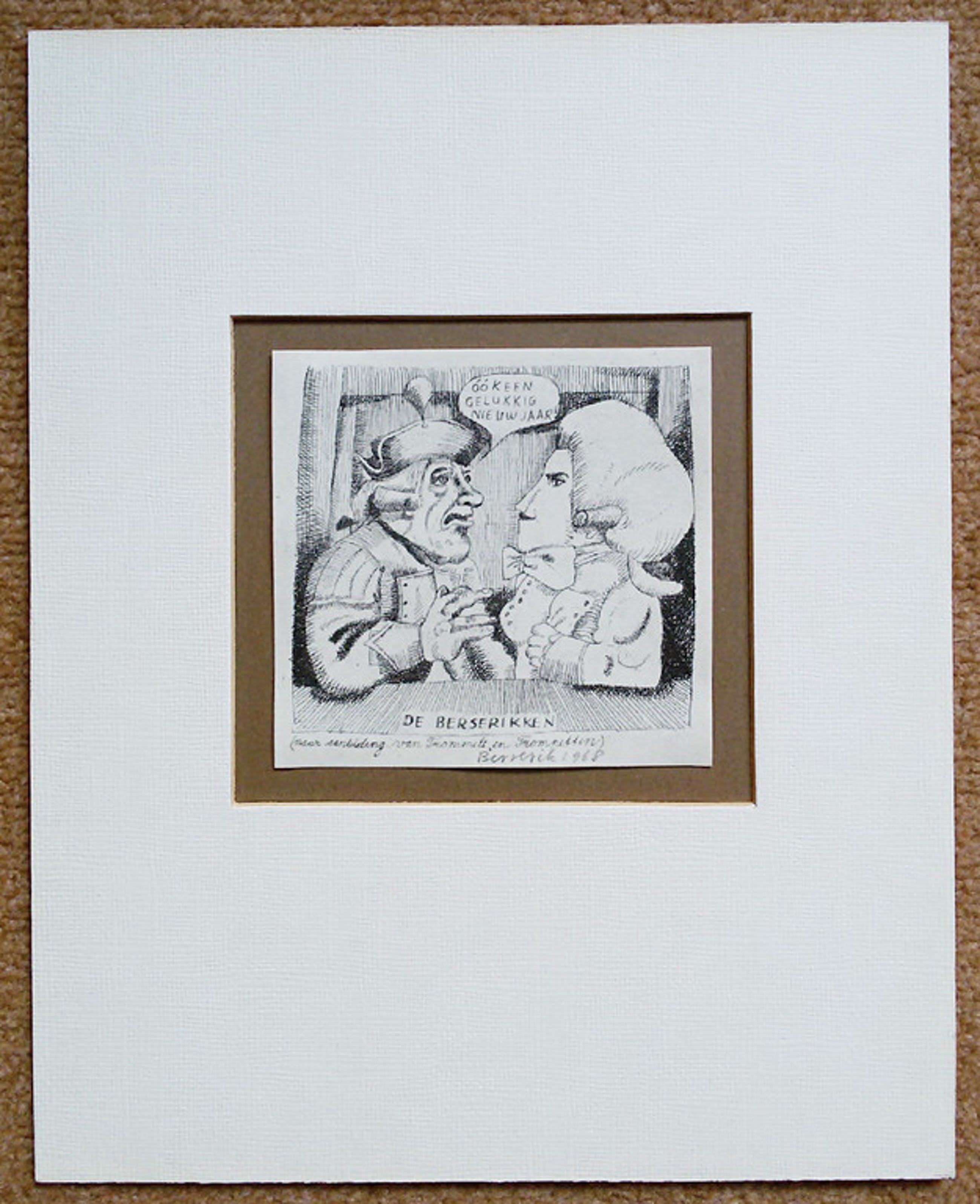 Leuk etsje van Herman Berserik. Etsblad is gemonteerd op dik bruin papier, het geheel gevat in een passe-partout. Met potlood gesigneerd en gedateerd, en in de plaat getiteld plus andere annotaties. In goede staat.