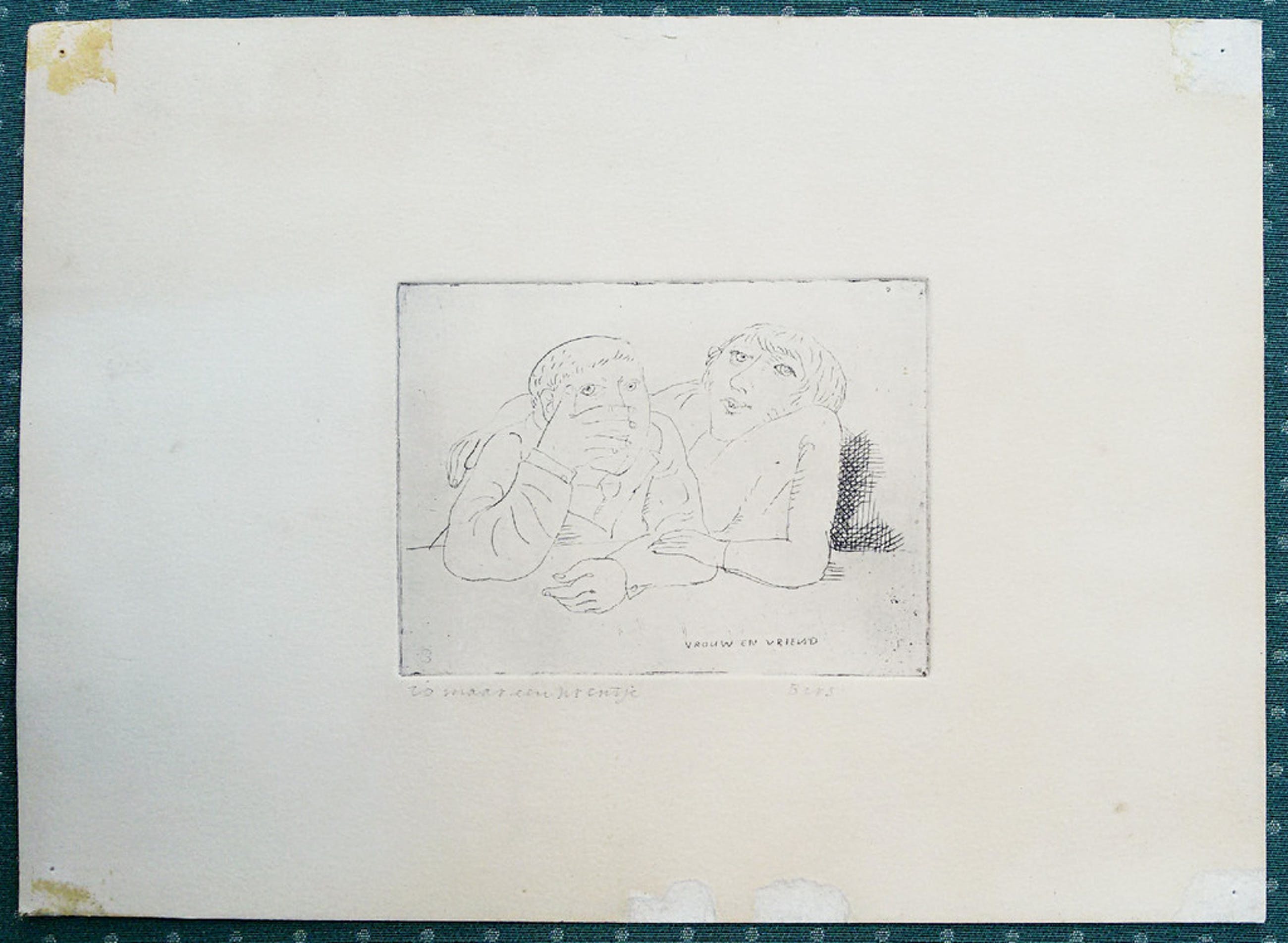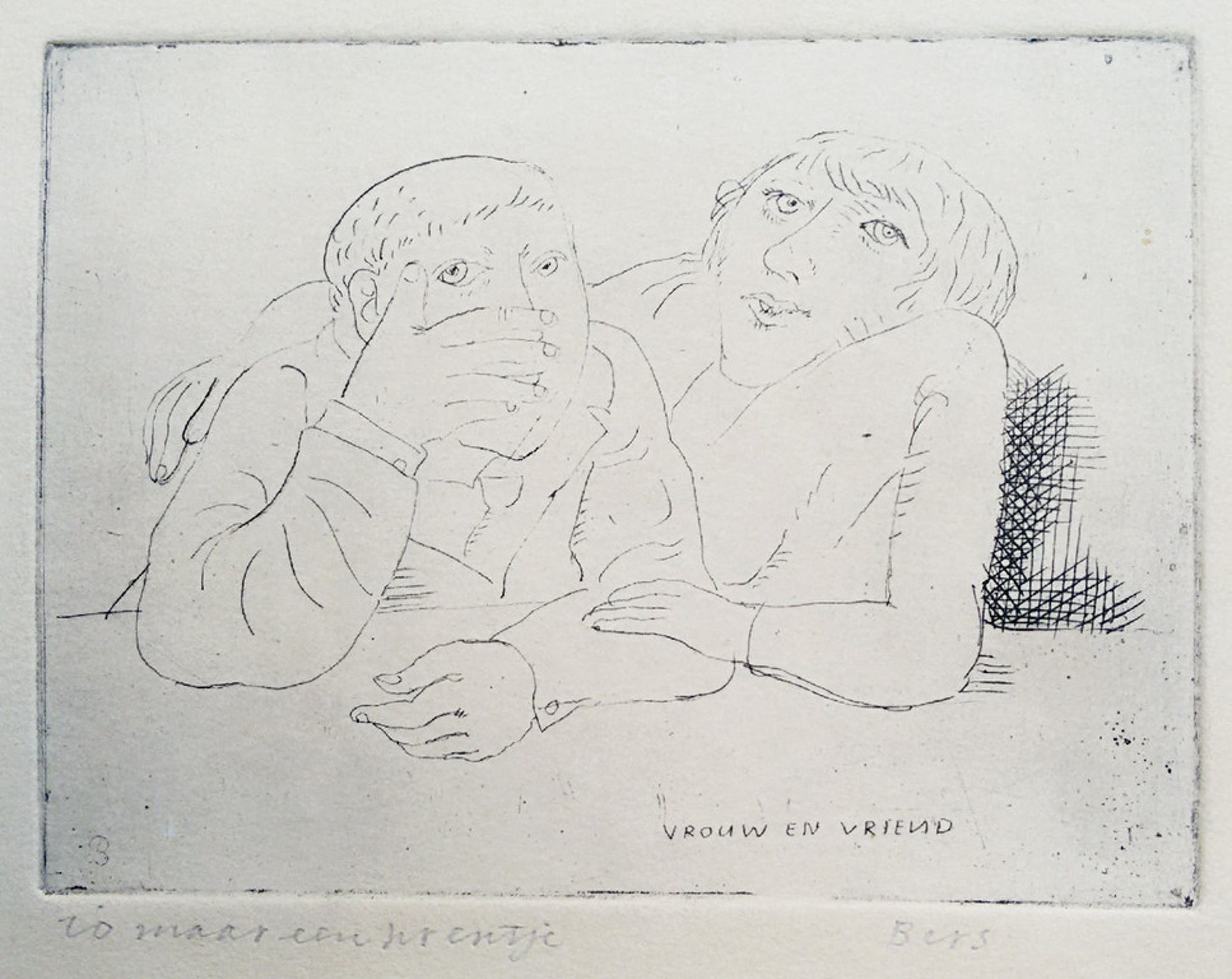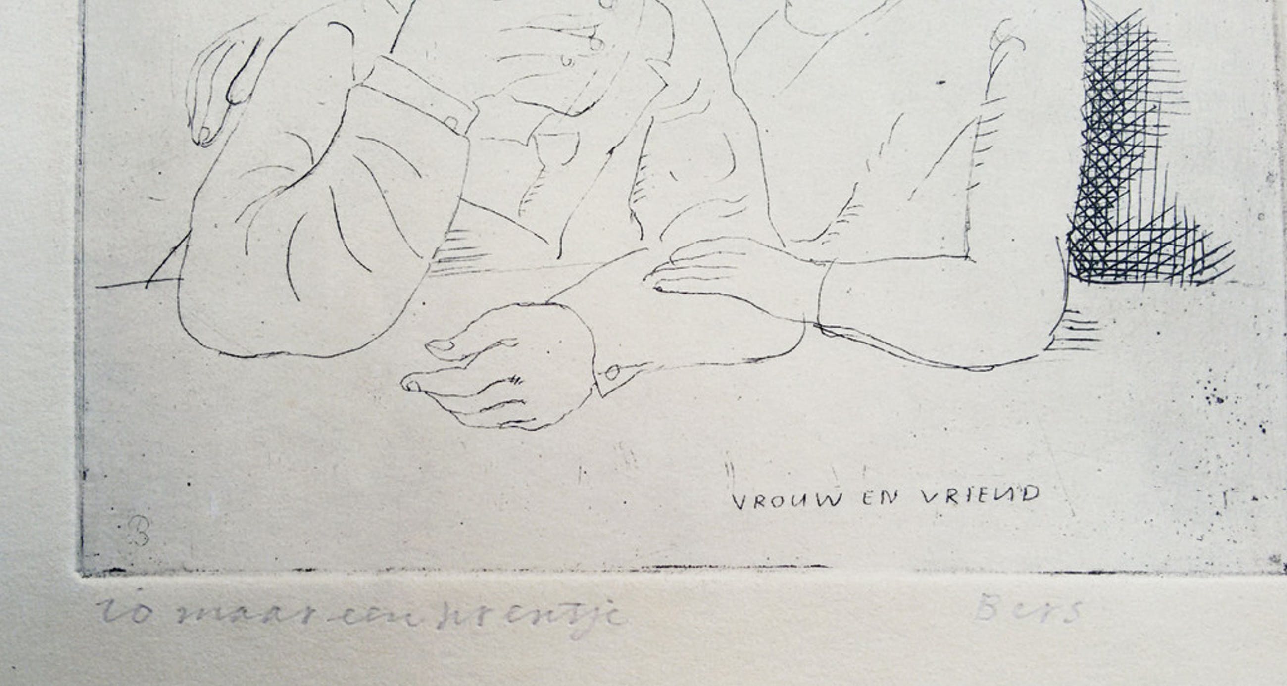 Leuk etsje van Herman Berserik. Met potlood gesigneerd (“Bers”) en geannoteerd (“zo maar een prentje”), en in de plaat getiteld. In redelijk goede staat; blad heeft ingelijst gezeten en is beschadigd aan de randen, maar ingelijst met passe-partout is het werk zeer goed want het etsbeeld en de directe marge er omheen zijn in uitstekende staat. Het blad is wel uniform verkleurd.