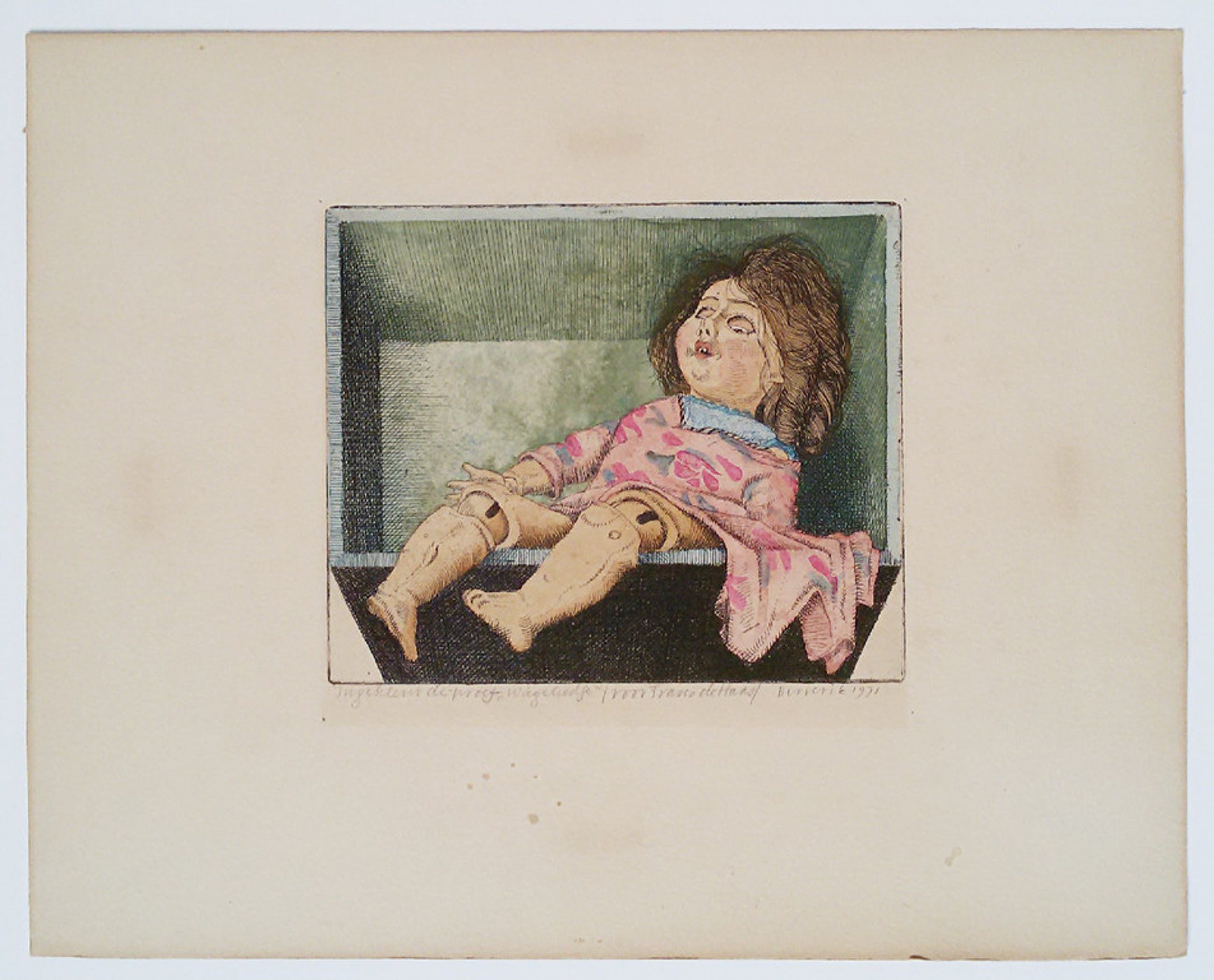 Met de hand ingekleurde ets van Herman Berserik. Proefdruk, met potlood gesigneerd, gedateerd (1971) en met opdracht “voor Frans de Haas”. In goede staat; blad heeft ingelijst gezeten want er is een verkleuring van een vorig passe-partout (eigenlijk alleen zichtbaar in de witte marge rond de tekst). Het blad is uniform verkleurd en er zitten vier speldengaatjes in de hoeken net buiten het beeld (zie foto’s).