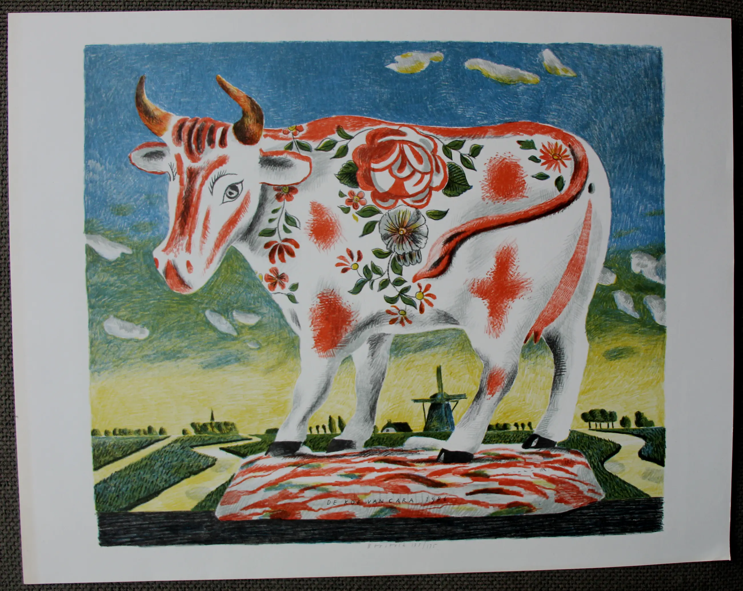Kleuren litho van Herman Berserik. Titel: De koe van Cara. Jaar: 1986. Oplage: 135/175. Afmetingen blad: H48 x b61.5cm. Afmetingen voorstelling: H42 x b48.5cm. Het werk is, rechts onderaan gesigneerd en gedateerd door de kunstenaar. De authenticiteit van het aangeboden werk wordt volledig gegarandeerd. Een certificaat van echtheid wordt, op aanvraag, gemaild.